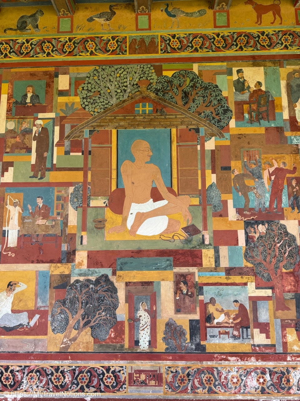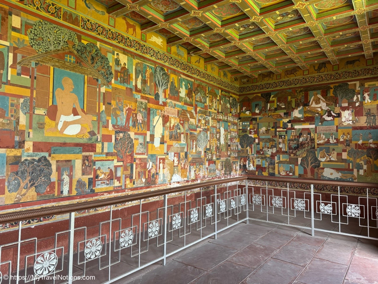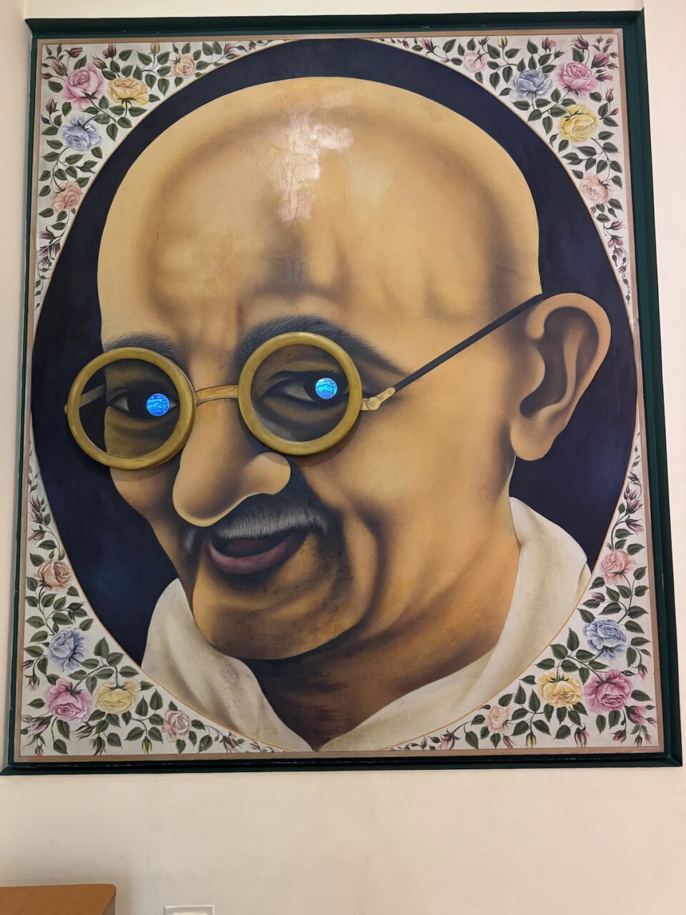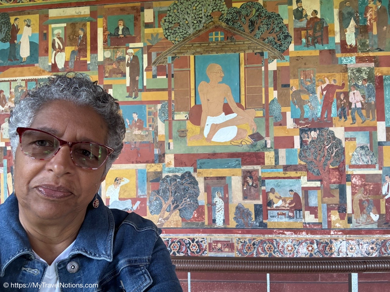 Me at the painted mural of Mahatma Gandhi’s life at the Gandhi Smriti and National Gandhi Museum in Delhi. This beautiful and peaceful estate in New Delhi is where India’s national hero lived for the final period of his life and the place where Gandhi was assassinated in 1948. (March 18, 2025)
