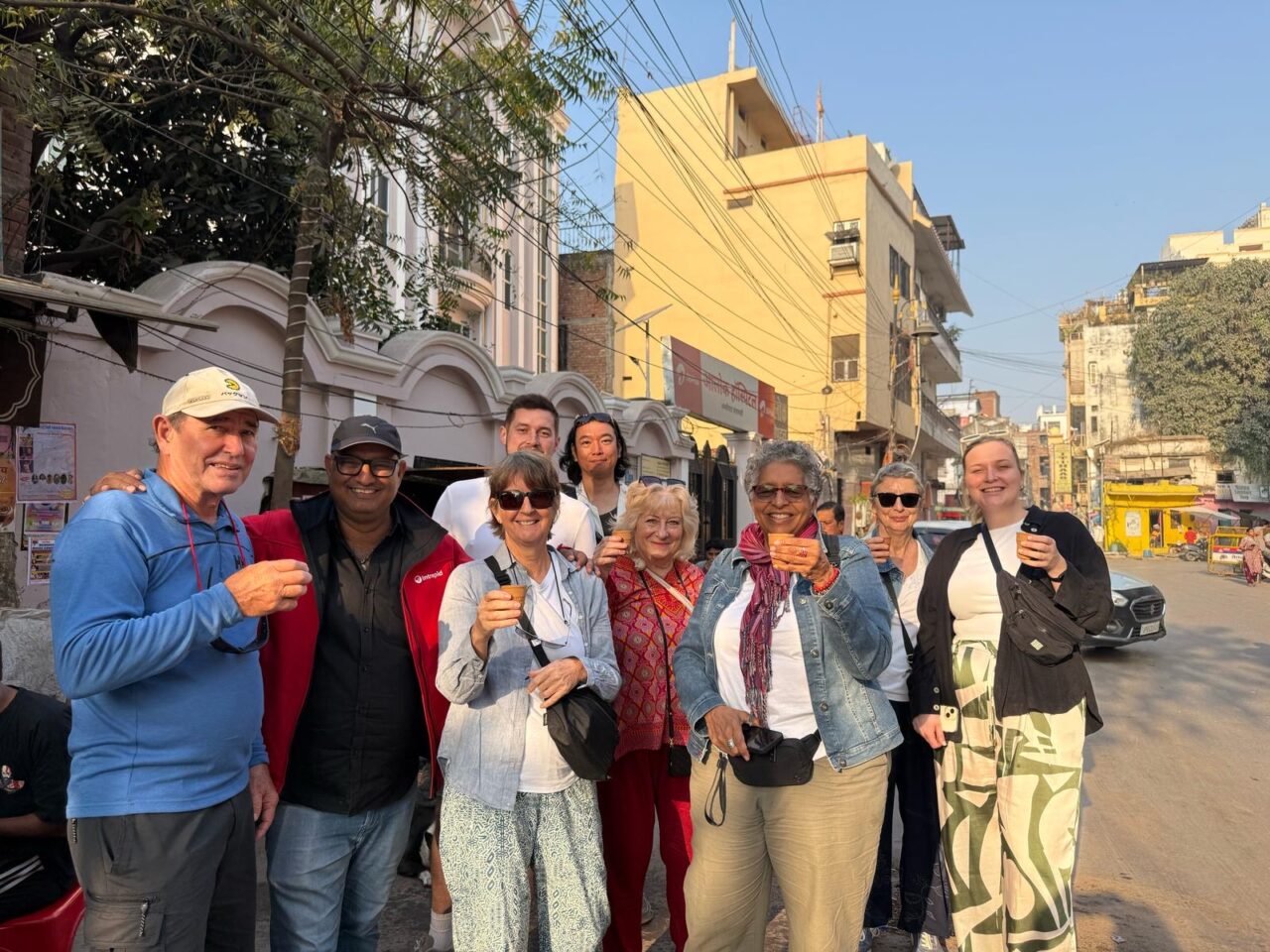 Our Intrepid India tour group drinking Masala chai tea, except for Sarah who took the photo. From left: Paul, our India Intrepid leader Kush, Janine, Sam, Atsu, Kay, me, Nicola and Robyn. Thanks Sarah for the photo. (March 11, 2025)