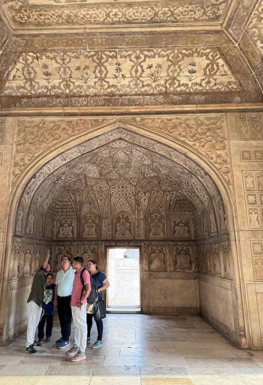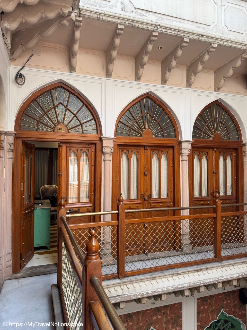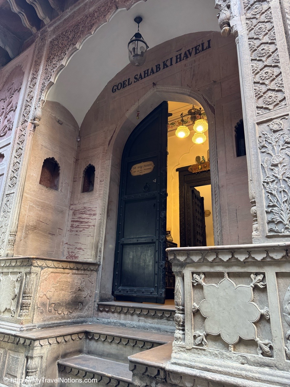 The door to my 2nd floor room at the Haveli Dharampura in the heart of crazy, hectic Old Delhi where I spent my last two nights in India. (March 18, 2025)