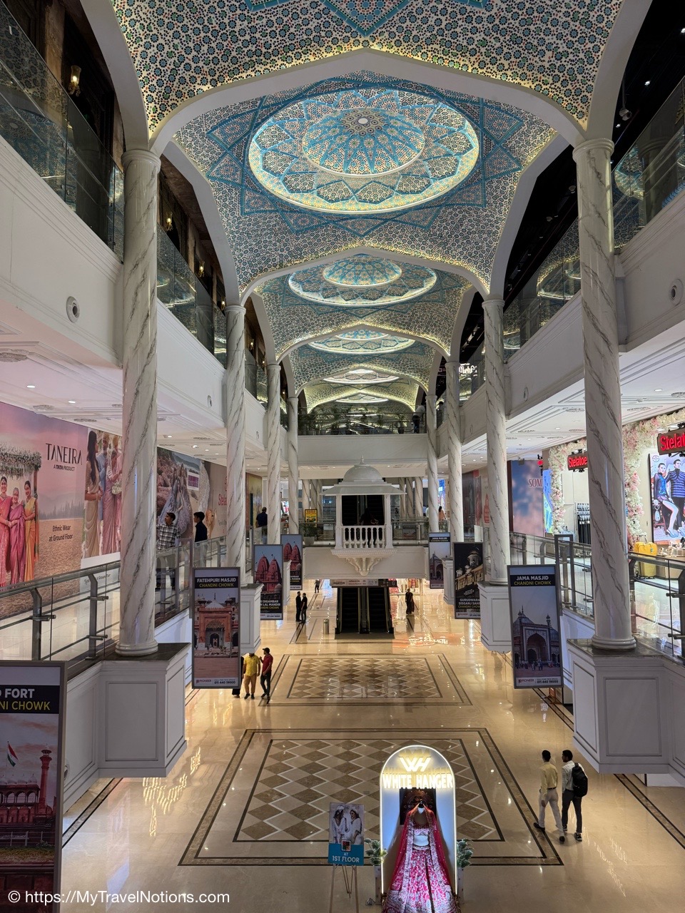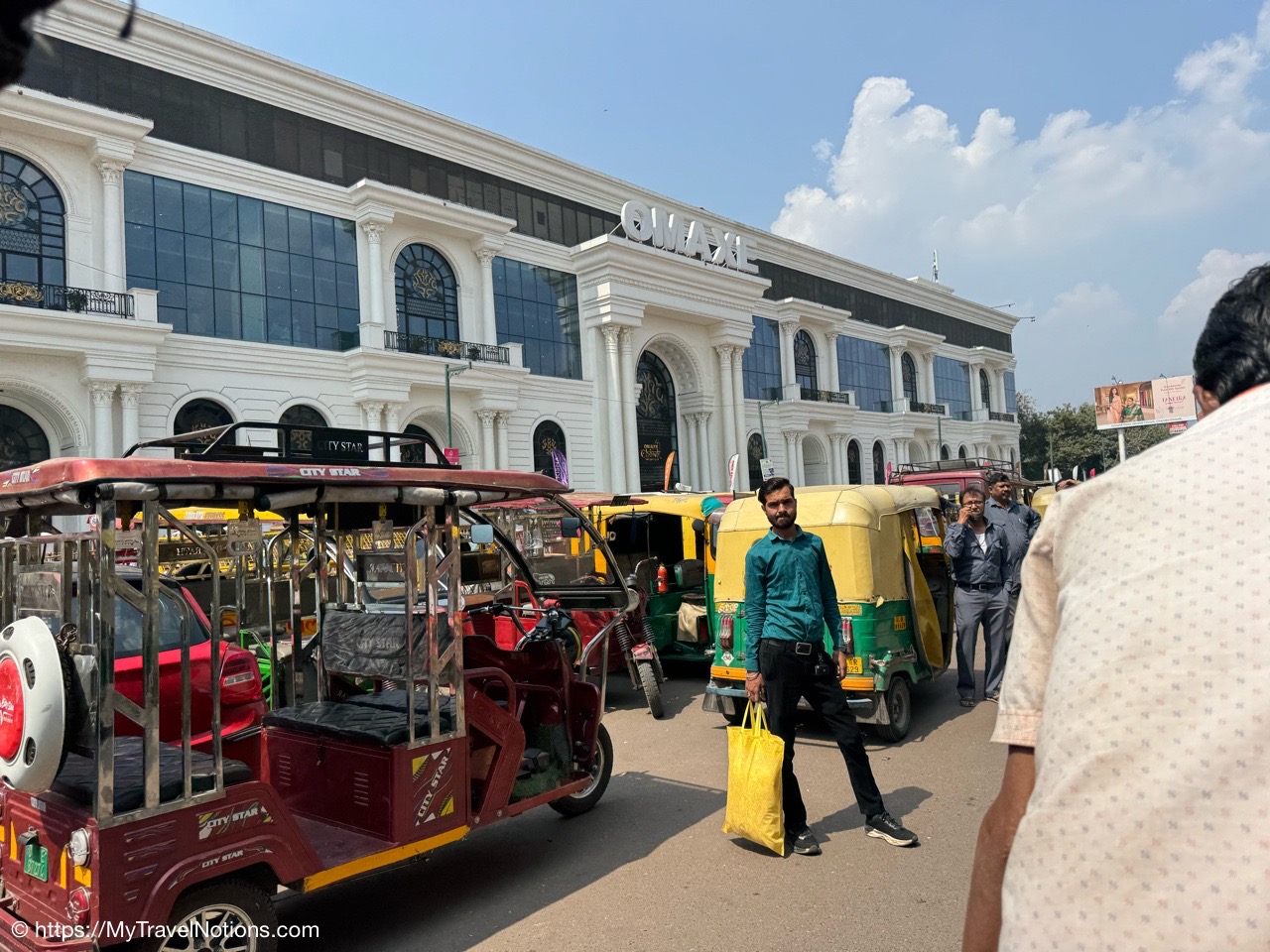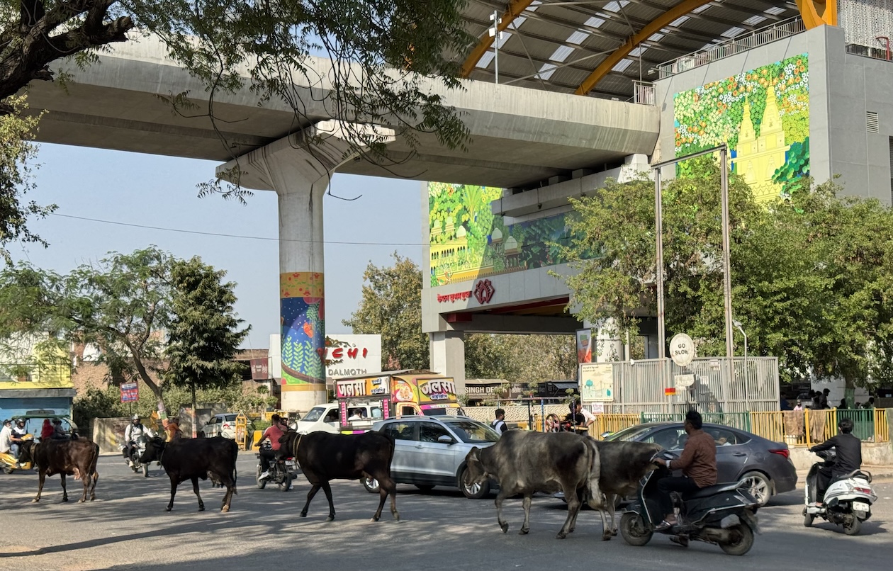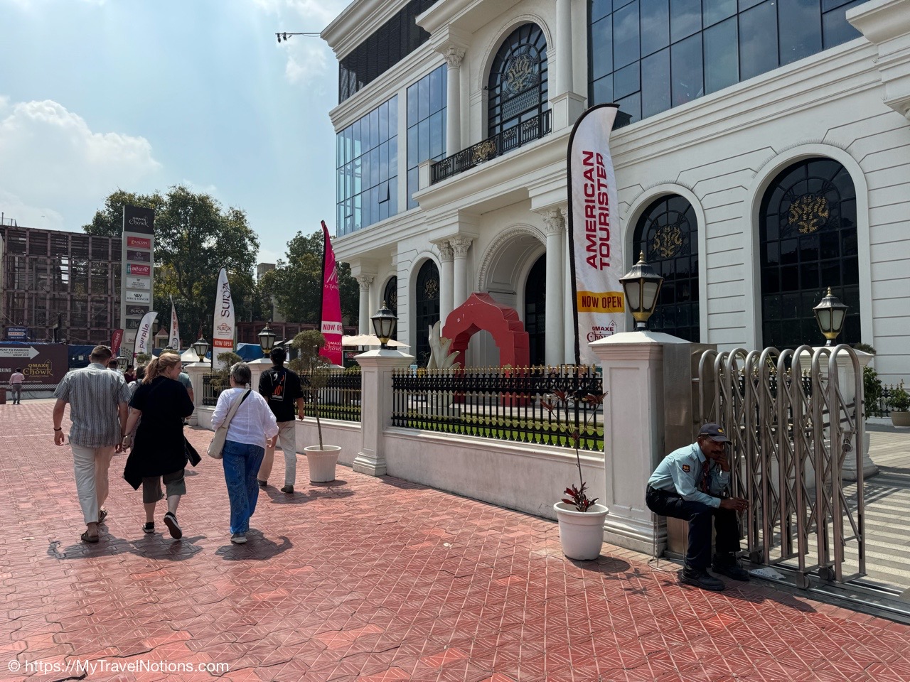 Exiting the Omaxe Mall in Chandni Chowk Old Delhi where our Intrepid tour group stopped for lunch at its food court. (March 17, 2025)