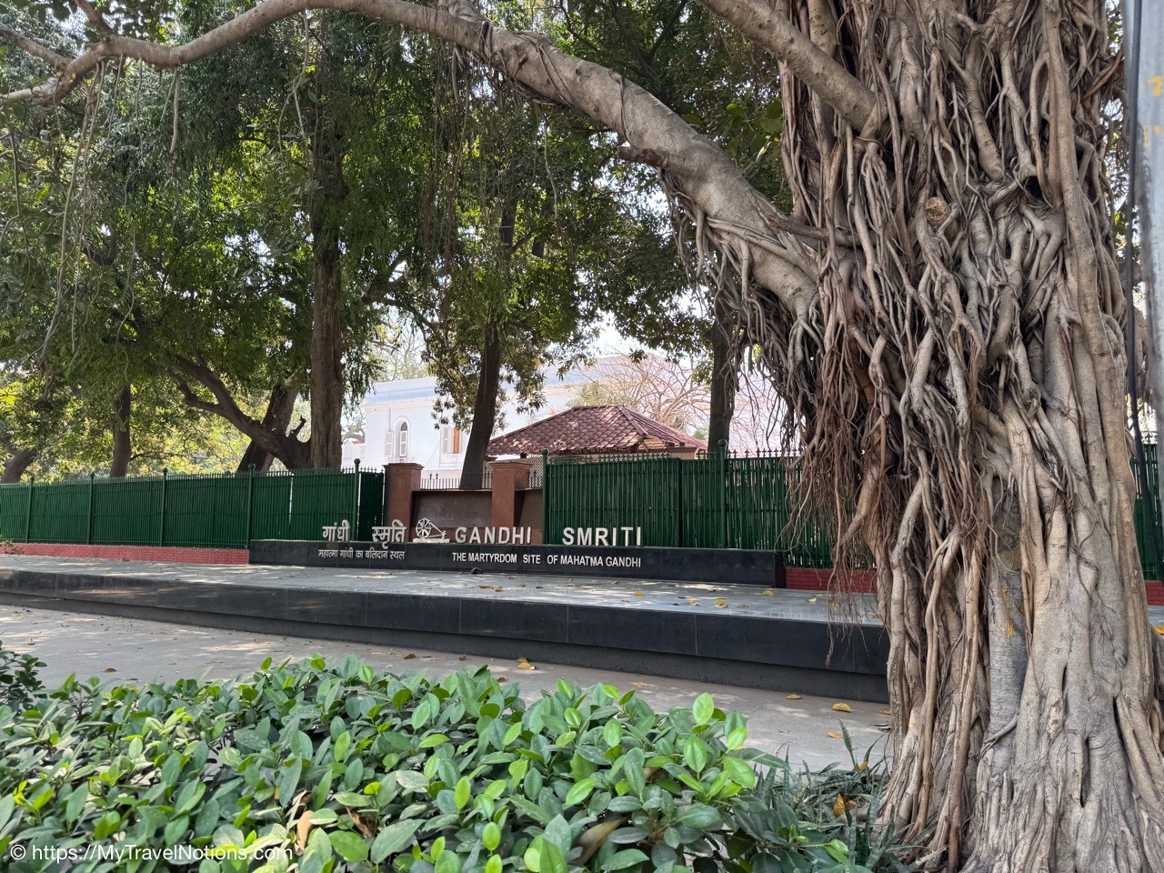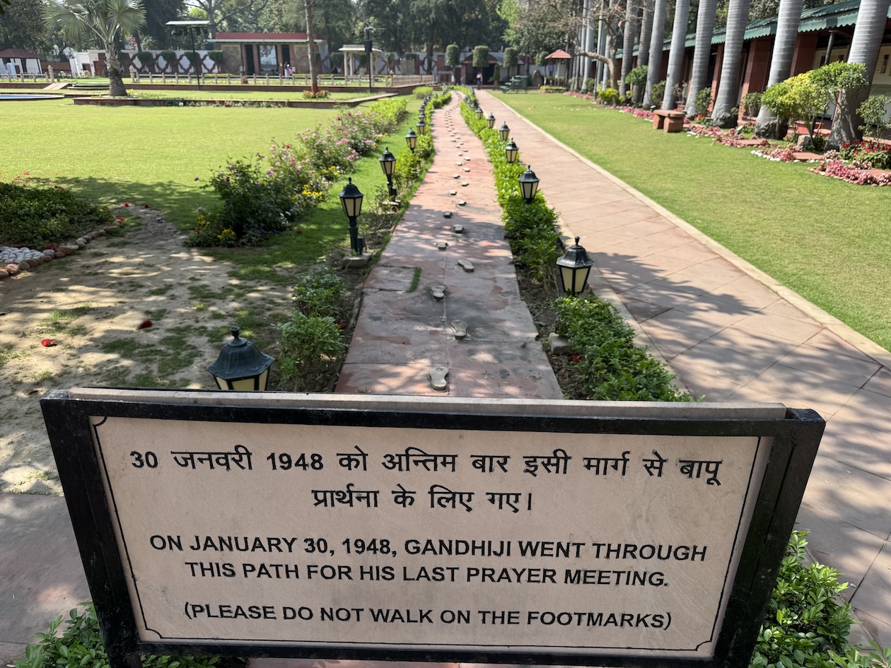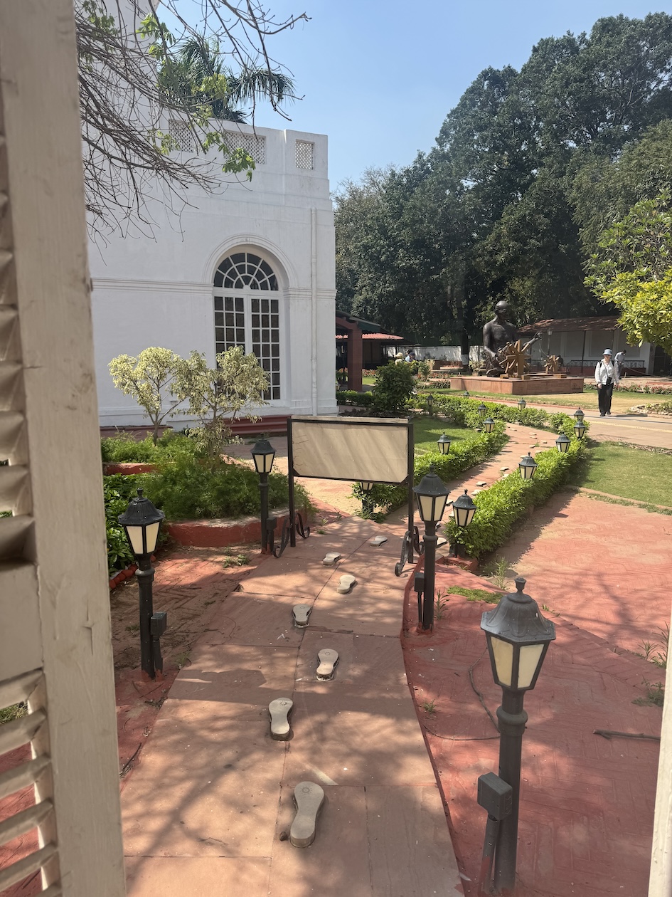 Walking into the walled estate complex of the Gandhi Smriti, the Old Birla House, that is now home to the National Gandhi Museum in New Delhi is dedicated to the life and legacy of Mahatma Gandhi. The White house to the left, is where Gandhi lived in two simple rooms that have been preserved. More of Gandhi’s after my walk through the estate. (March 18, 2025)