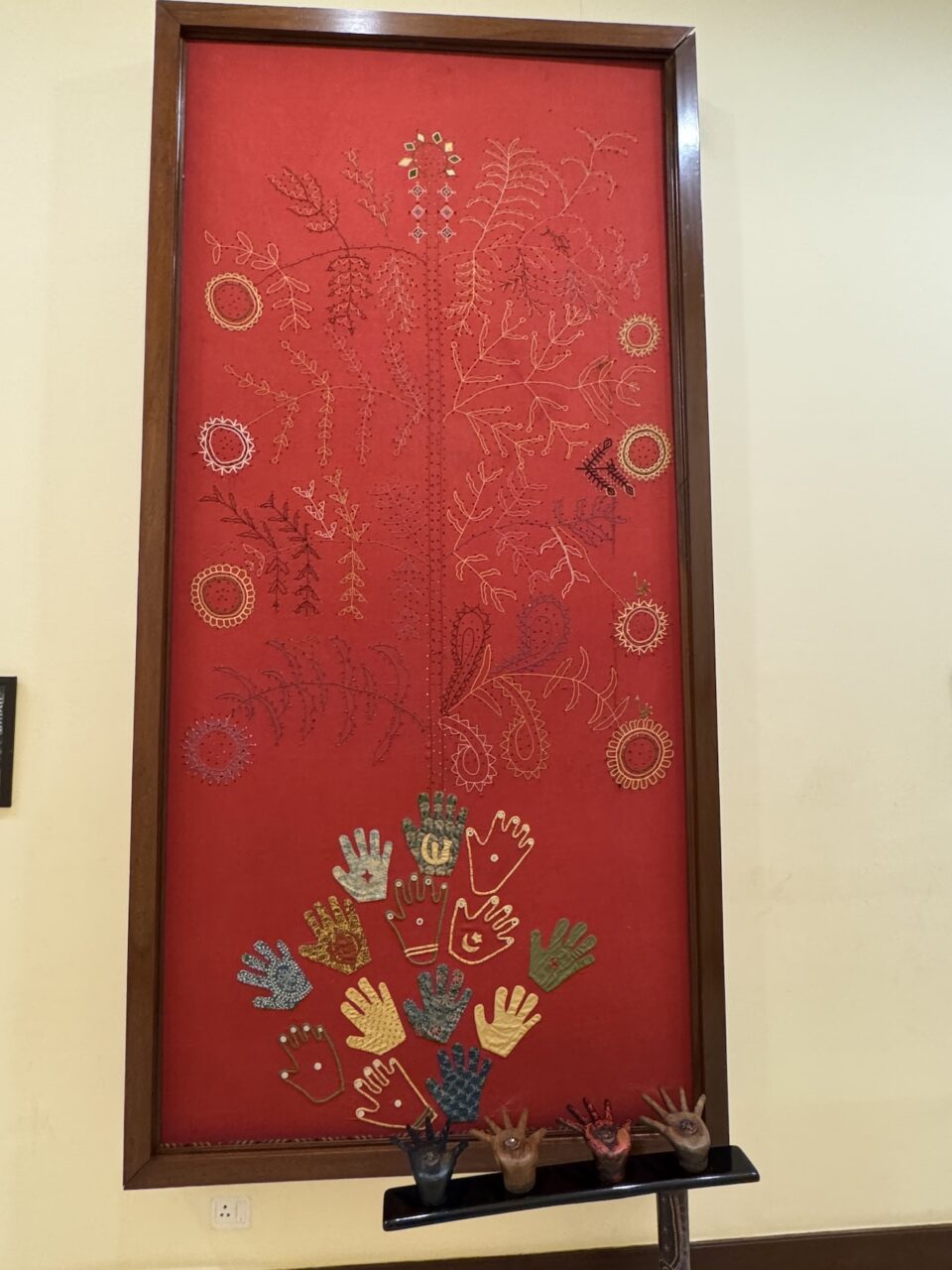 This Installation explores both the Gandhian concept of equality of religion and the concept of collaborative interface. The quilt consists of two parts. The upper part depicts the tree of life, a symbol found in all religious traditions. Lower down, the interface part, shows a representation of hands. By placing your palm on these hands you can light up the tree of life thereby committing yourself to Gandhiji’s notion of equality of religion. (March 18, 2025)