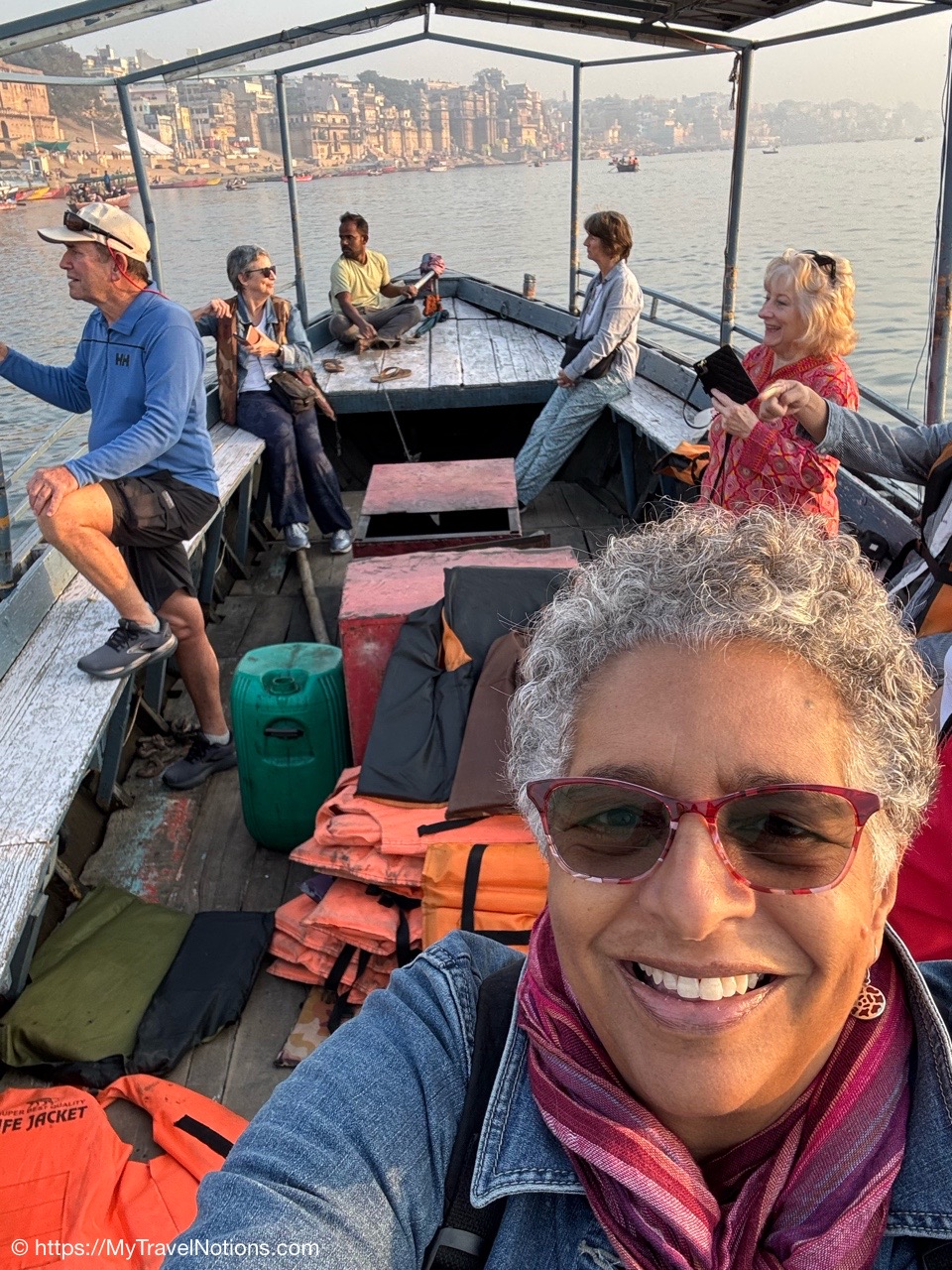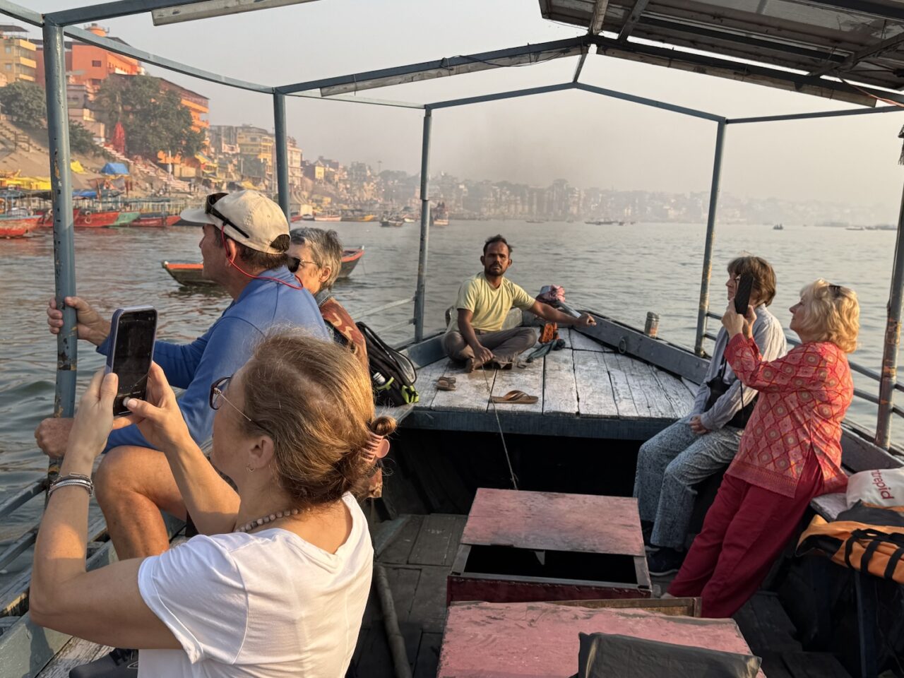 On our motorized boat during our sunrise boat ride over the Ganges river in Varanasi. (March 11, 2025)