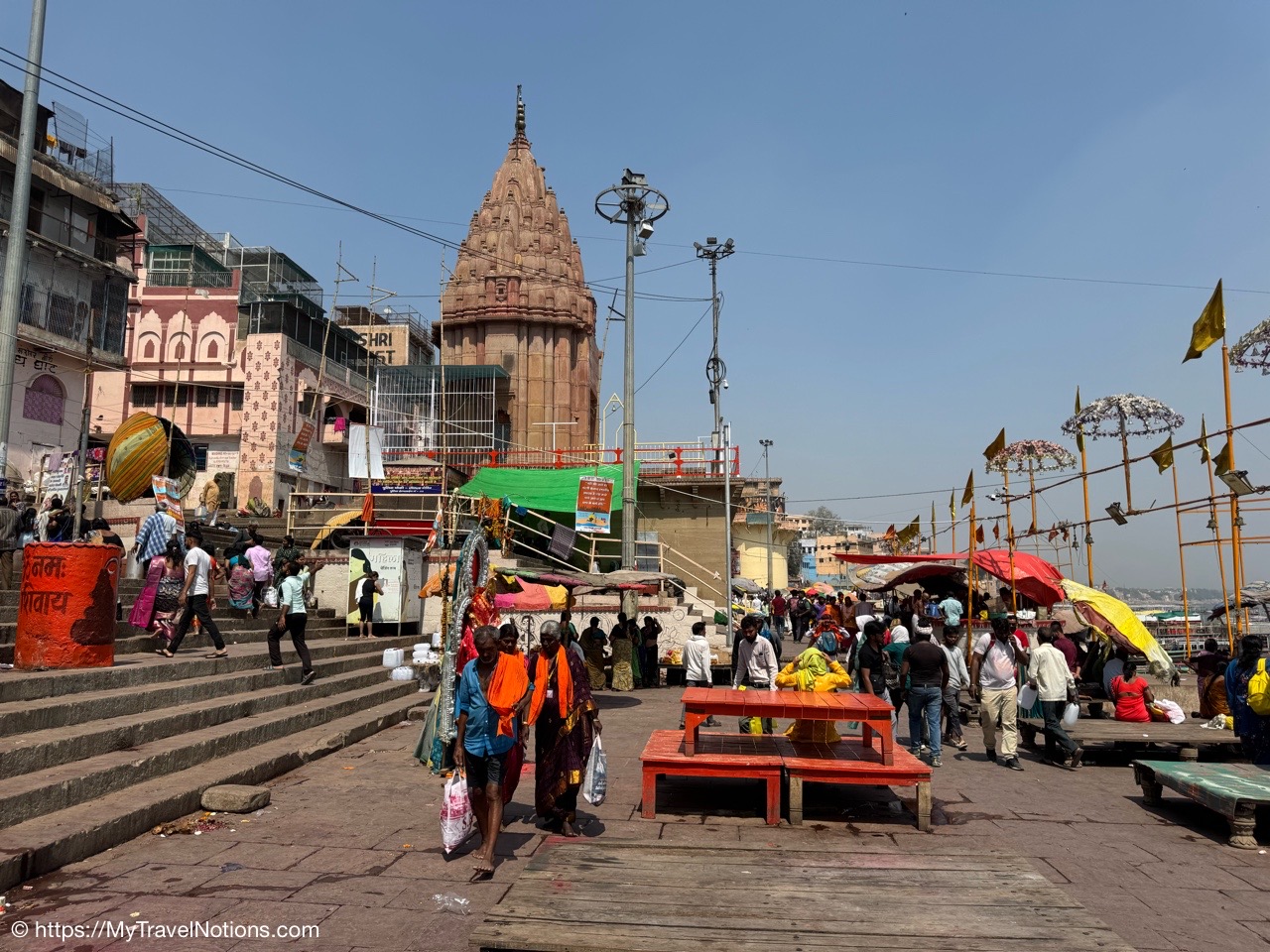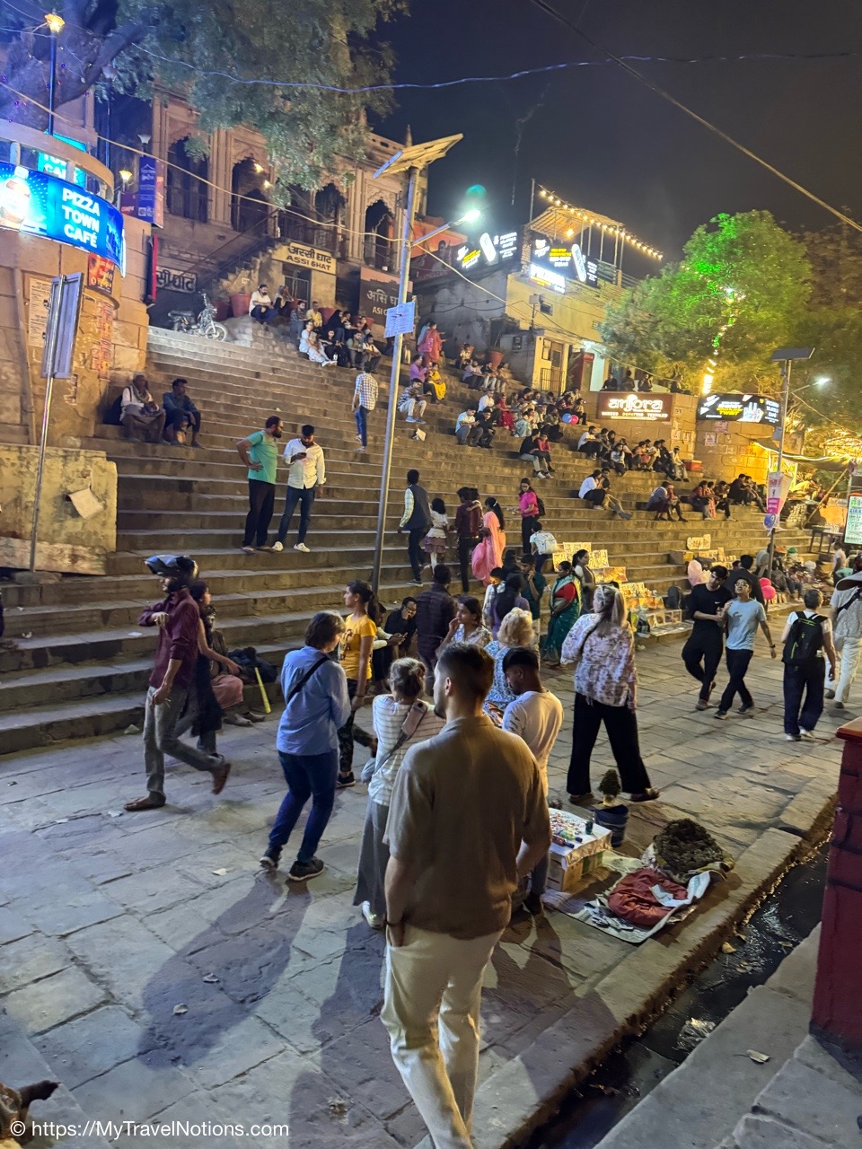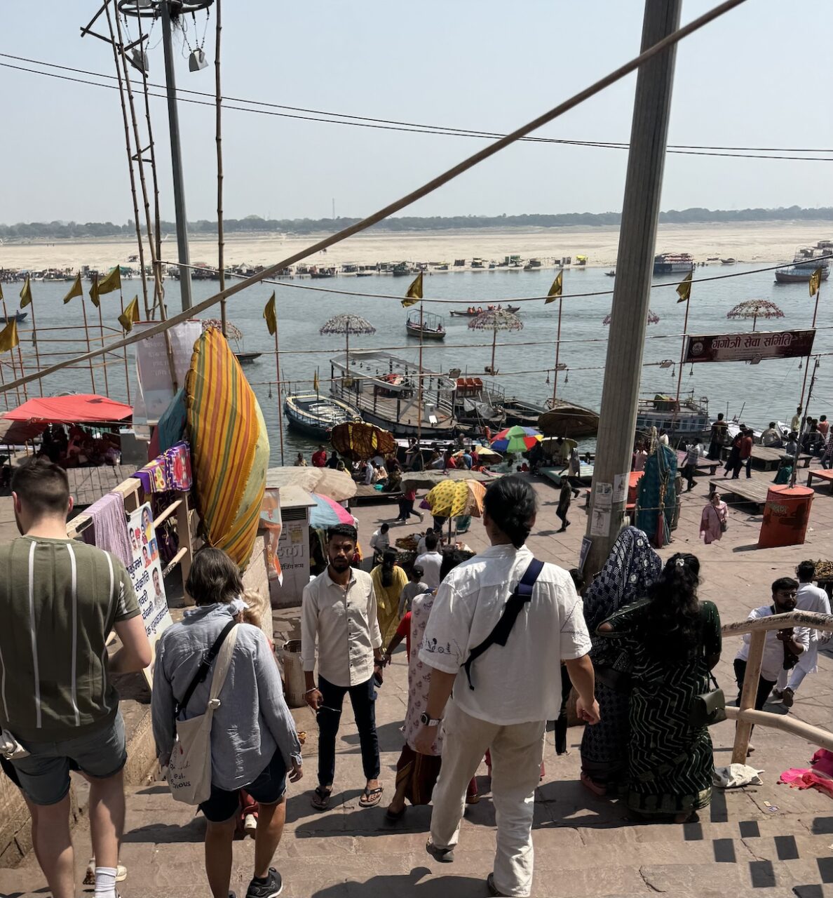 The Dasaswamedh Ghat, a riverfront step leading to the Ganges in Varanasi. This is where the nightly Ganga Aarti ceremony is held after sunset. (March 10, 2025)