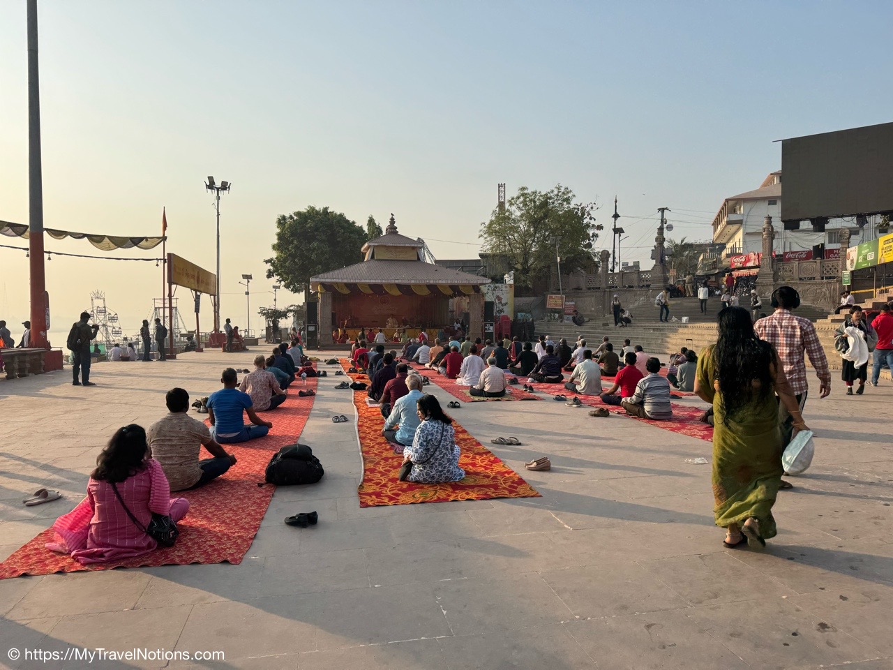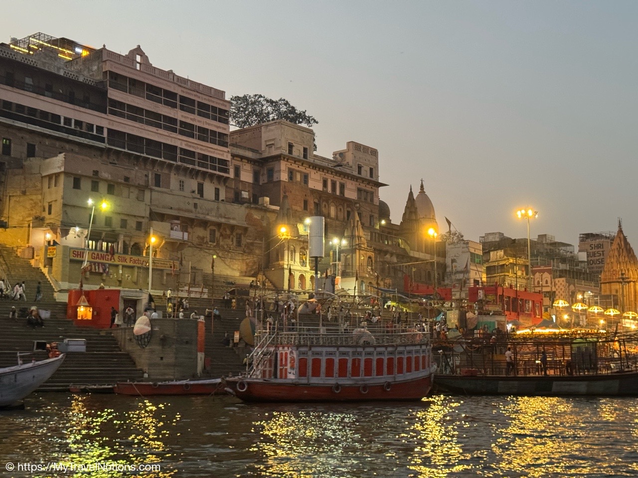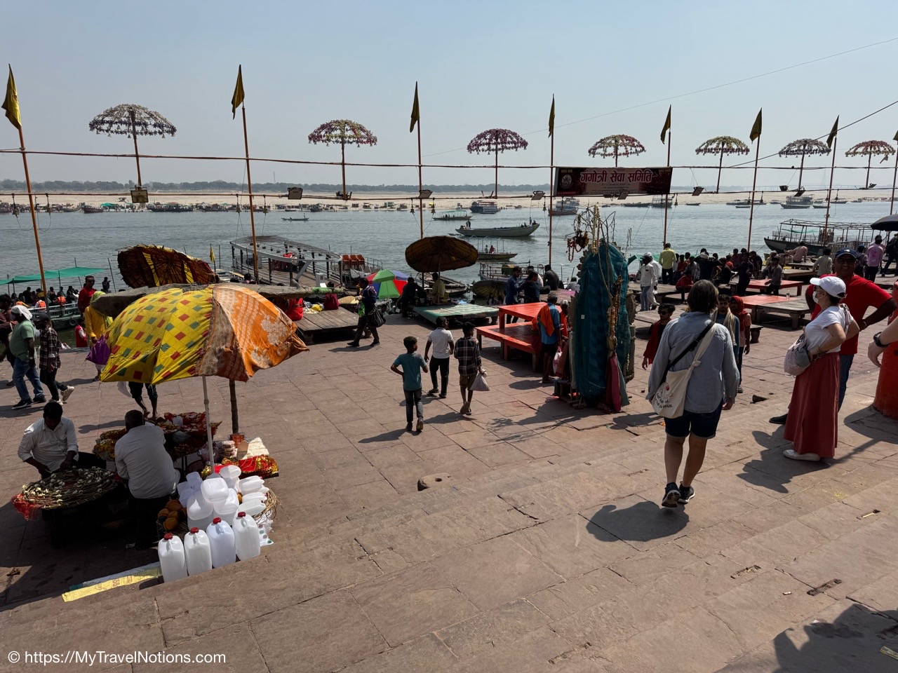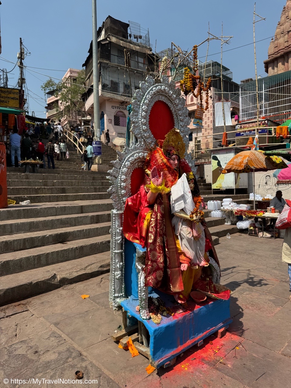 The Dasaswamedh Ghat, a riverfront step leading to the Ganges in Varanasi. This is where the nightly Ganga Aarti ceremony is held after sunset. (March 10, 2025)