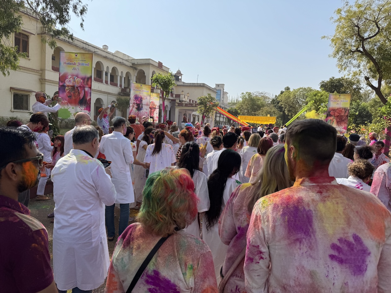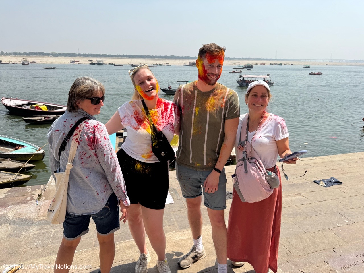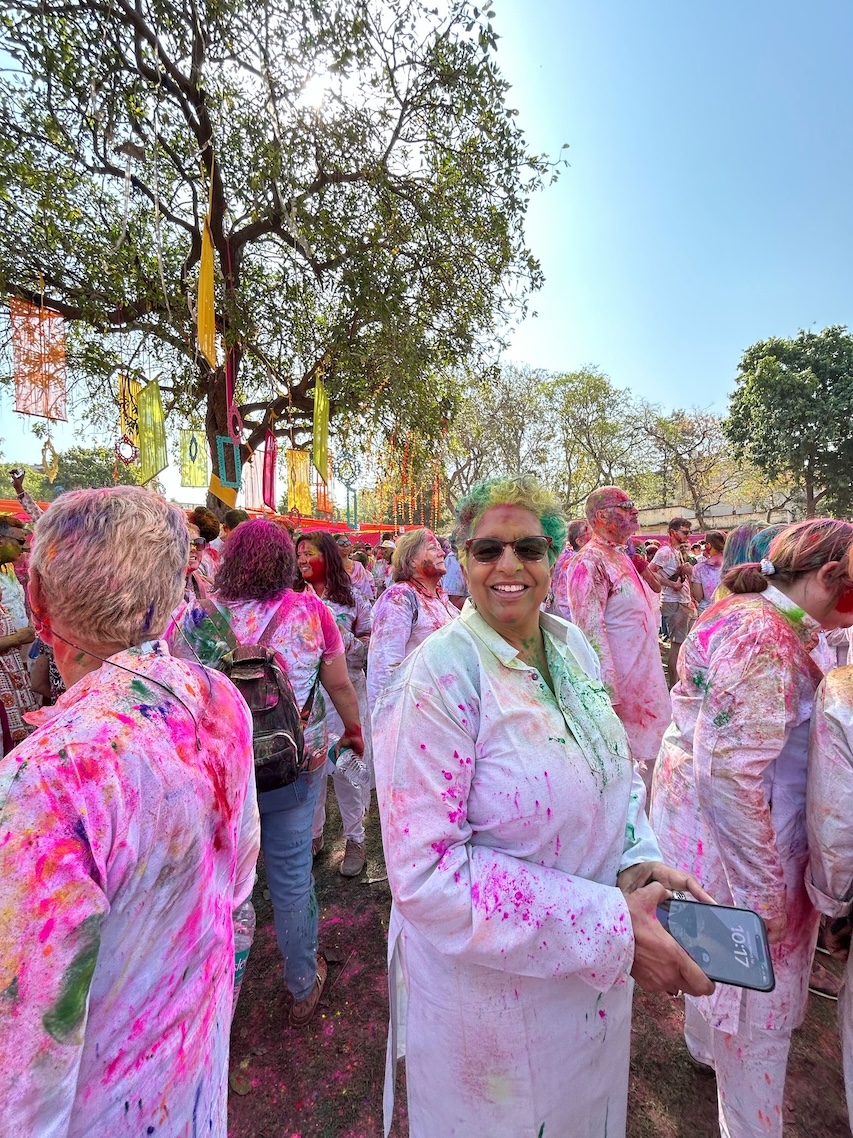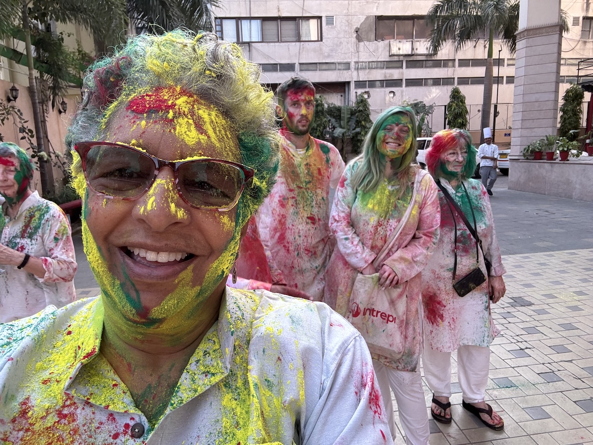 Although the Holi festival was not until March 13-14, some young people decided to start celebrating early and shared their enthusiasm with some of our tour members as we walking along the terraces of the various ghats along the Ganges river in Varanasi. From left: Janine, Robyn, Sam and Sarah. (March 11, 2025)