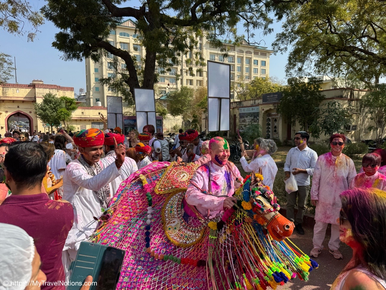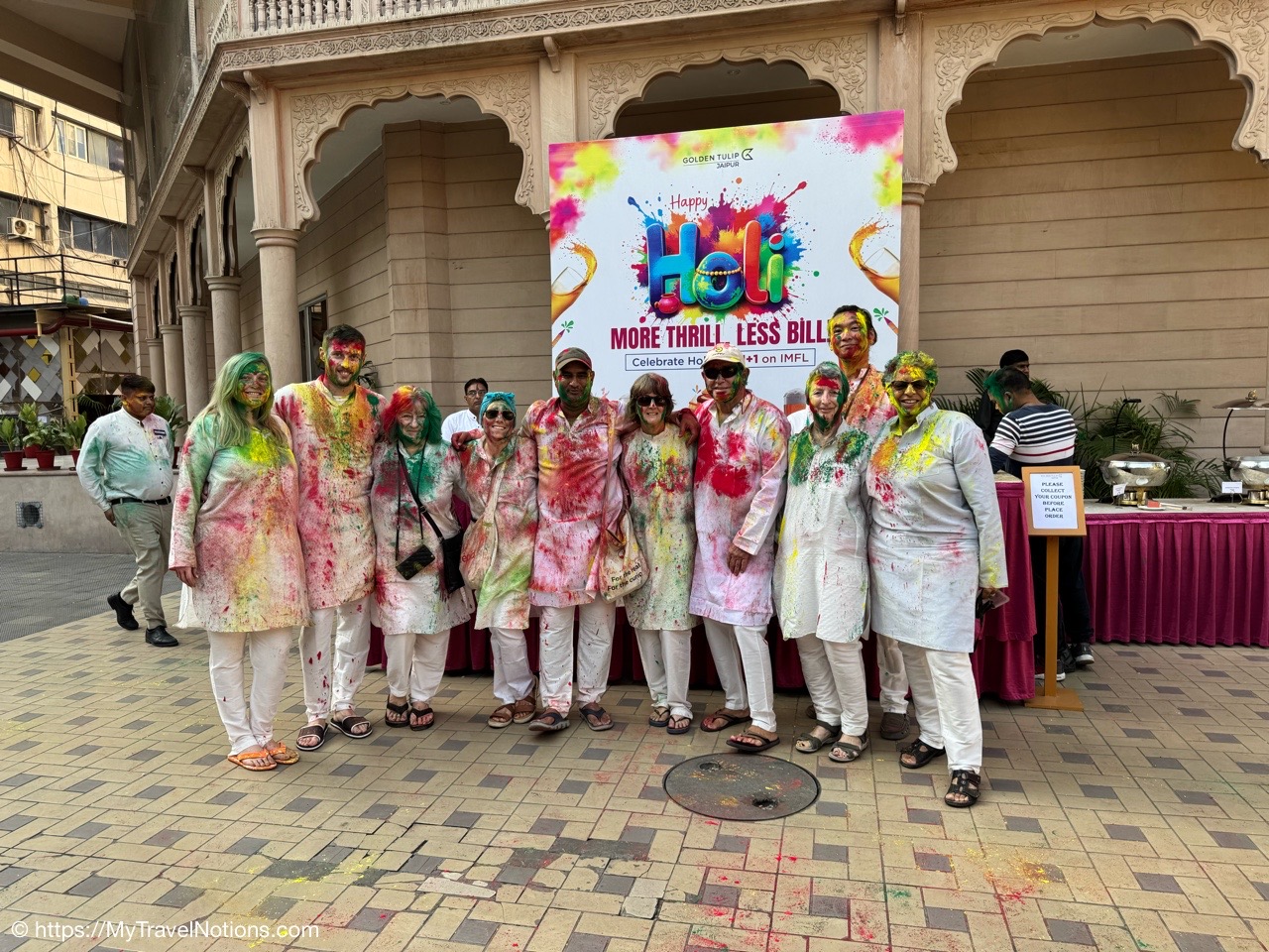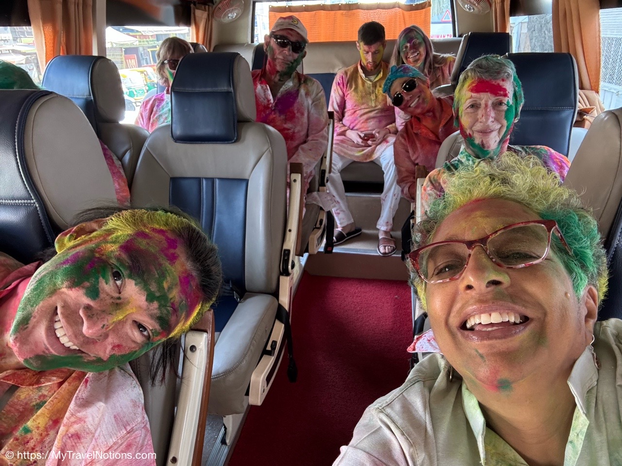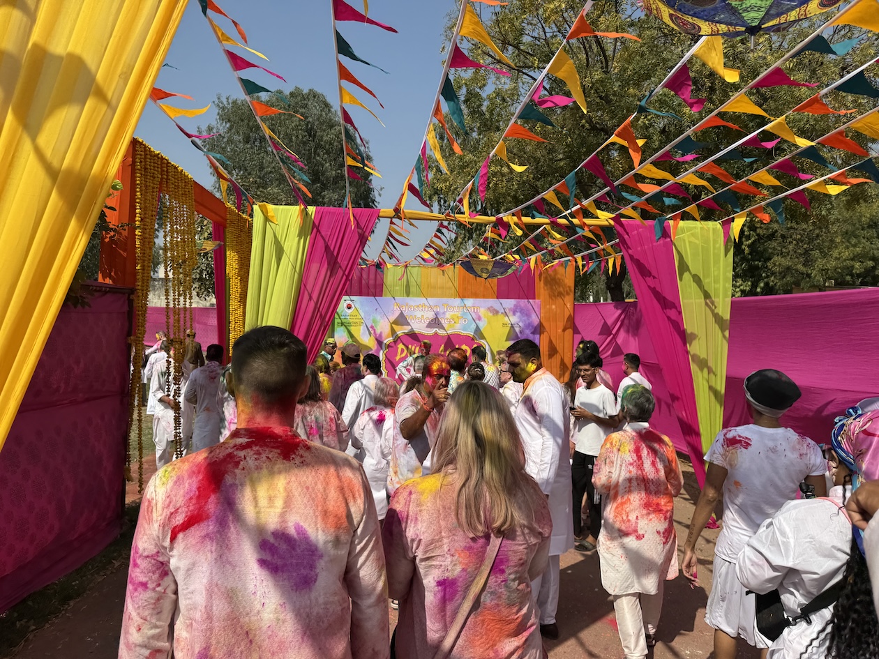 Although the Holi festival was not until March 13-14, some young people decided to start celebrating early and shared their enthusiasm with some of our tour members as we walking along the terraces of the various ghats along the Ganges river in Varanasi. From left: Janine, Robyn, Sam and Sarah. (March 11, 2025)
