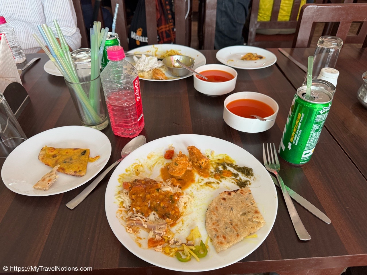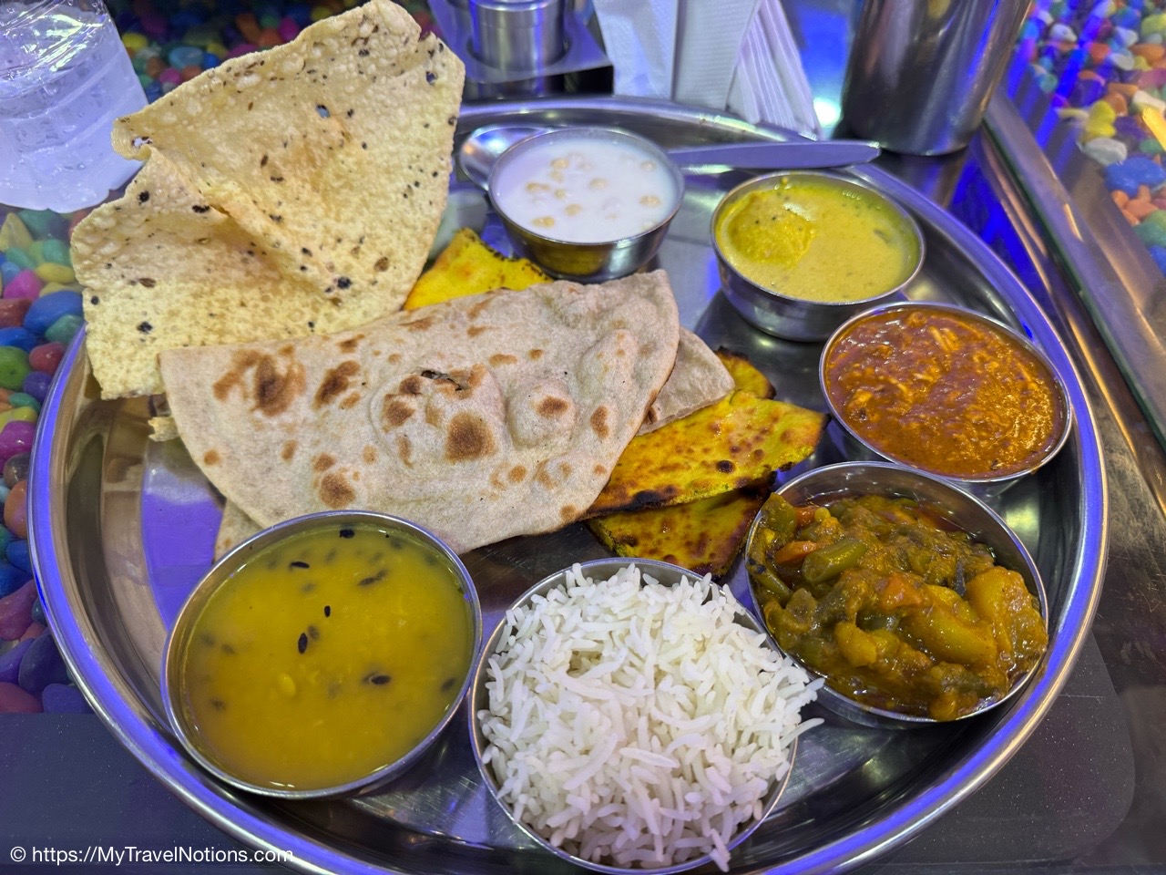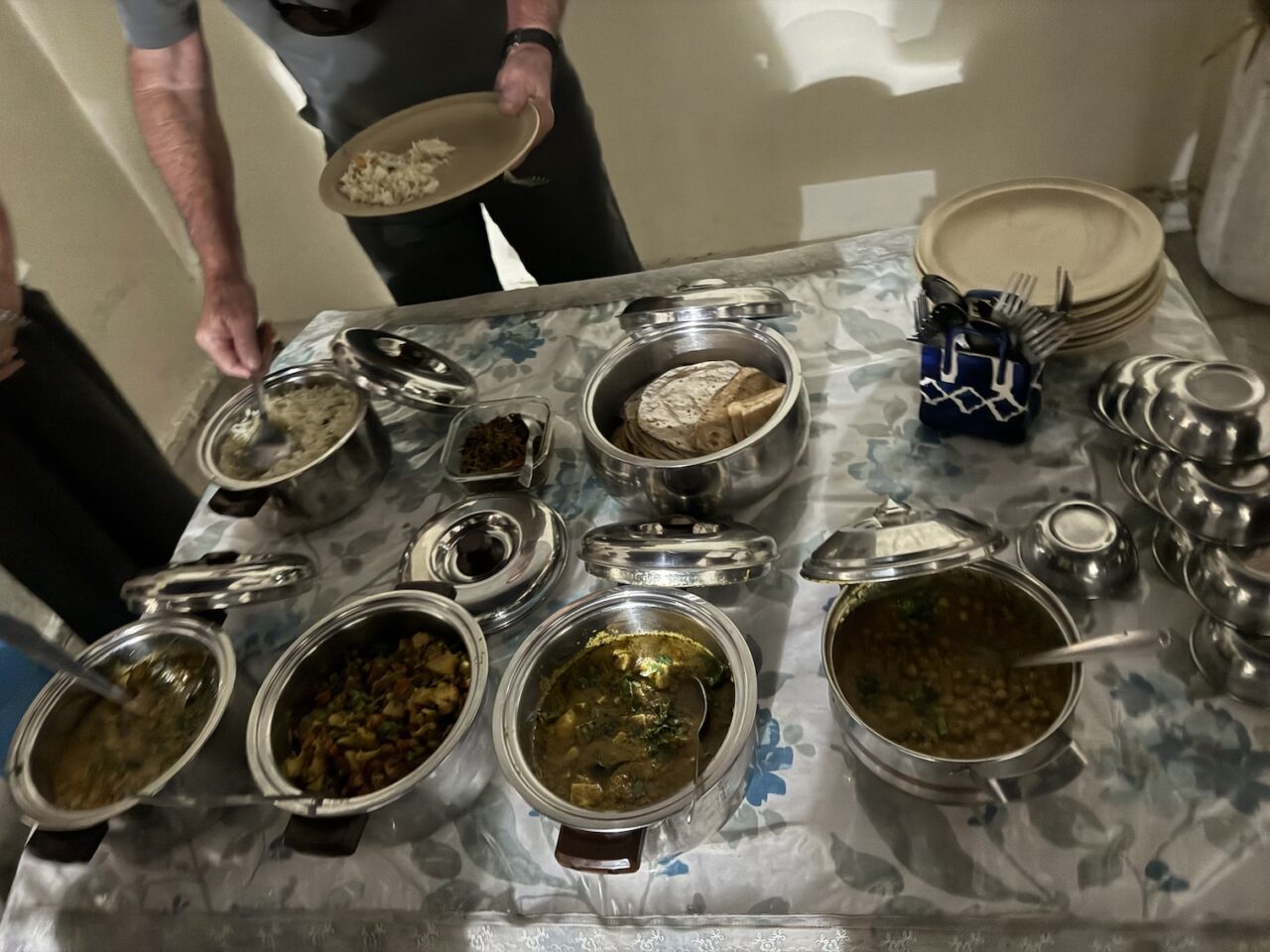 Even if this was not a vegetarian meal, I could not eat it all at our group vegetarian thali lunch at a local restaurant in Varanasi. A thali is a popular style of serving food in India, offering a selection of dishes, sides and condiments on a single large plate. (March 11, 2025)