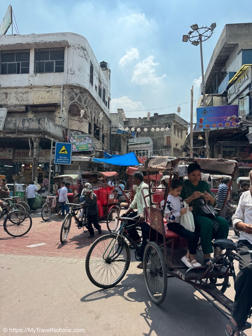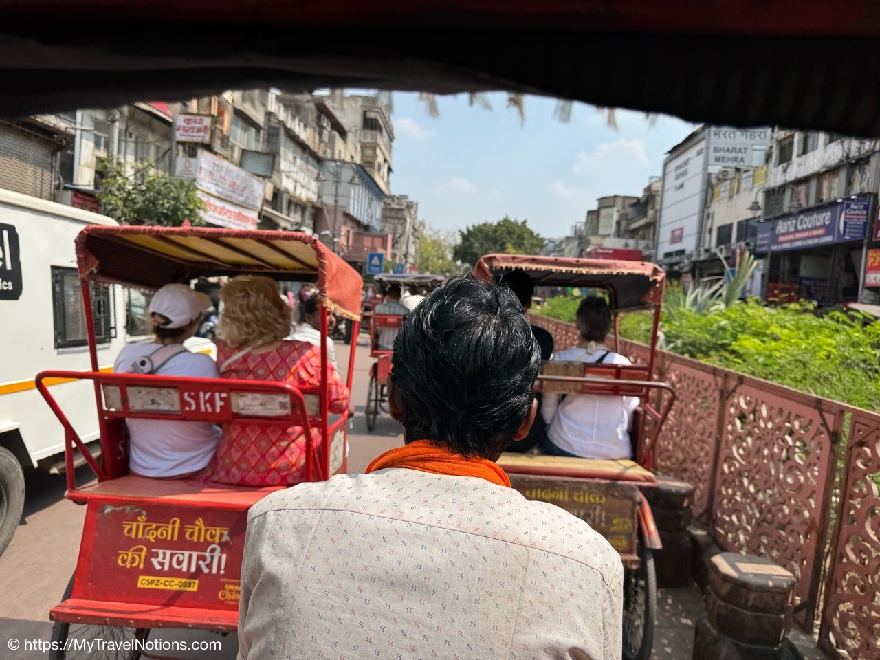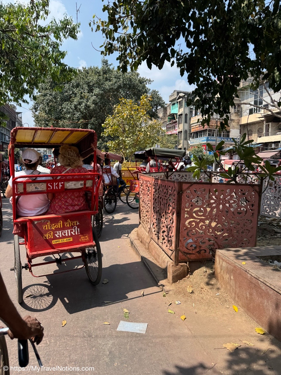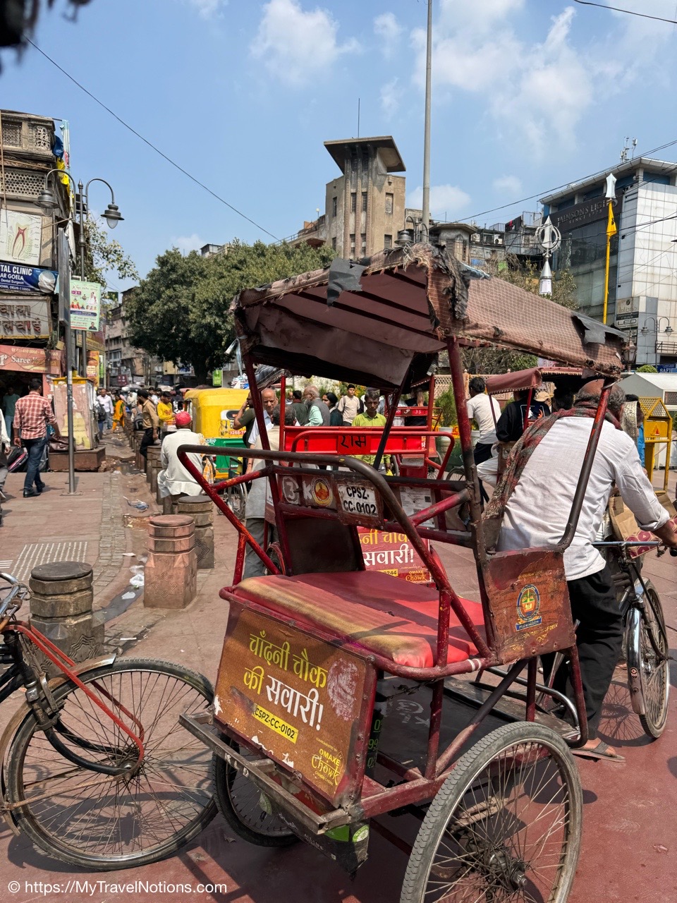 Riding in a cycle rickshaw along the Chandni Chowk a historic, bustling market area and road in Old Delhi. (March 17, 2025)