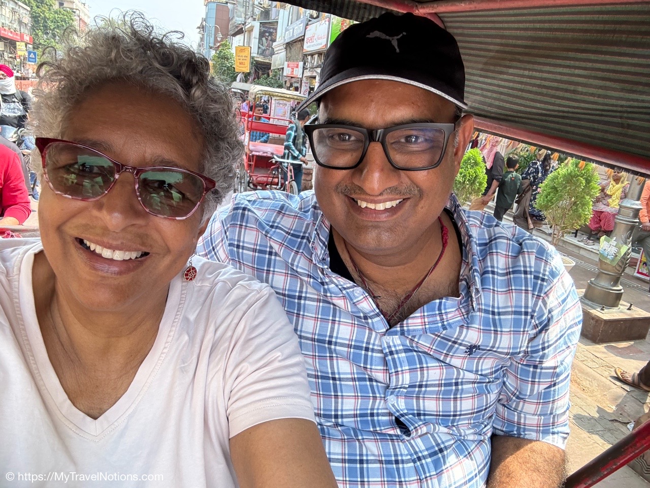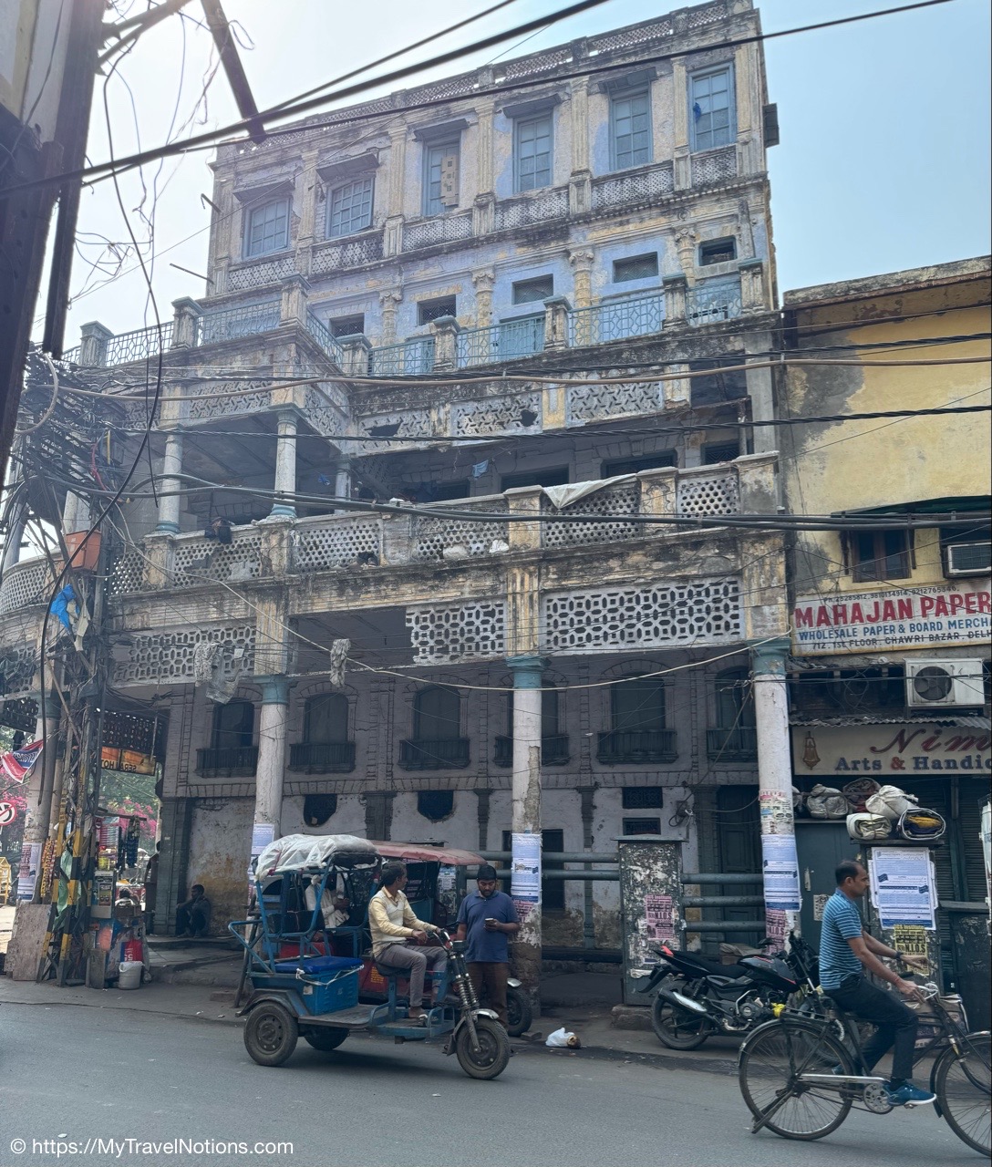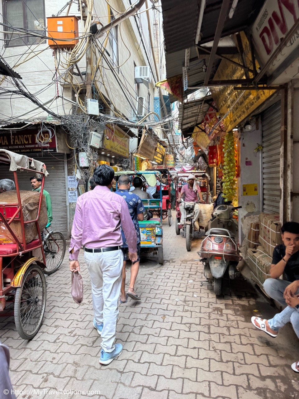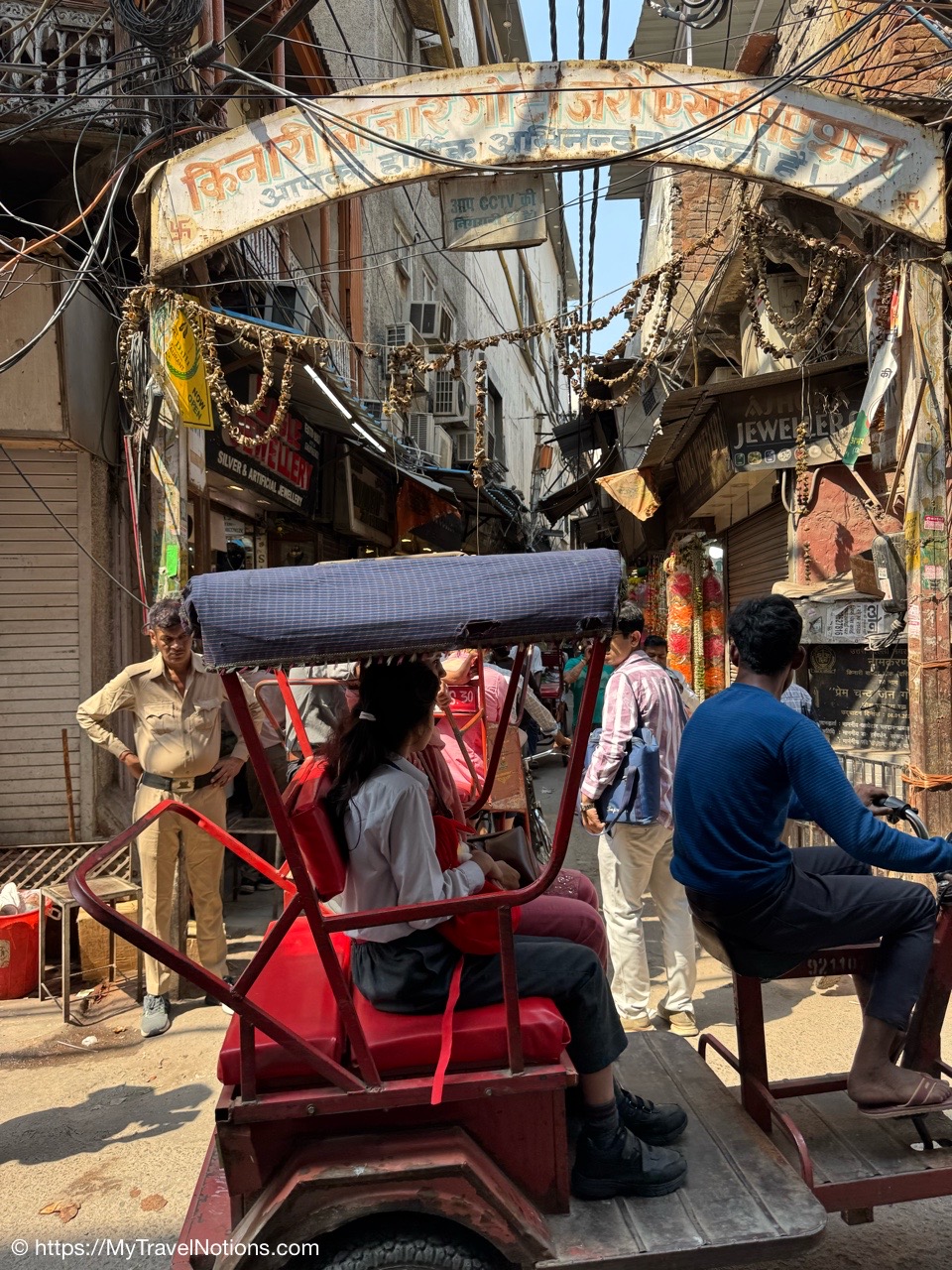 Riding in a cycle rickshaw along the Chandni Chowk a historic, bustling market area and road in Old Delhi. (March 17, 2025)