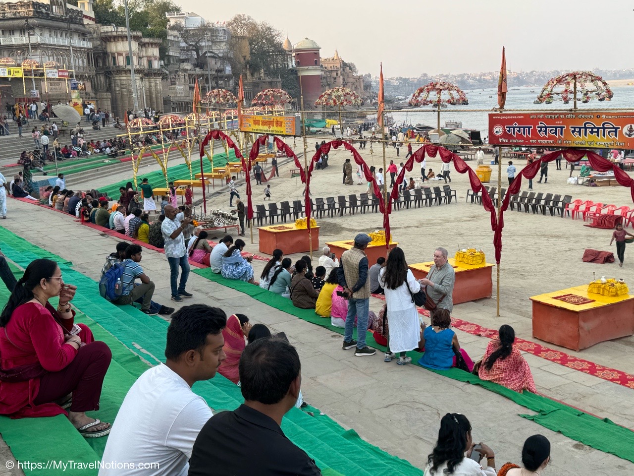 Decorations set up and people are gathering at the Dasaswamedh Ghat, a riverfront step leading to the Ganges river in Varanasi. The nightly, after sunset ceremony, is called the Ganga Aarti, a devotional Hindu ritual performed offering reverence to the Ganges, considered a living goddess. (March 10, 2025)
