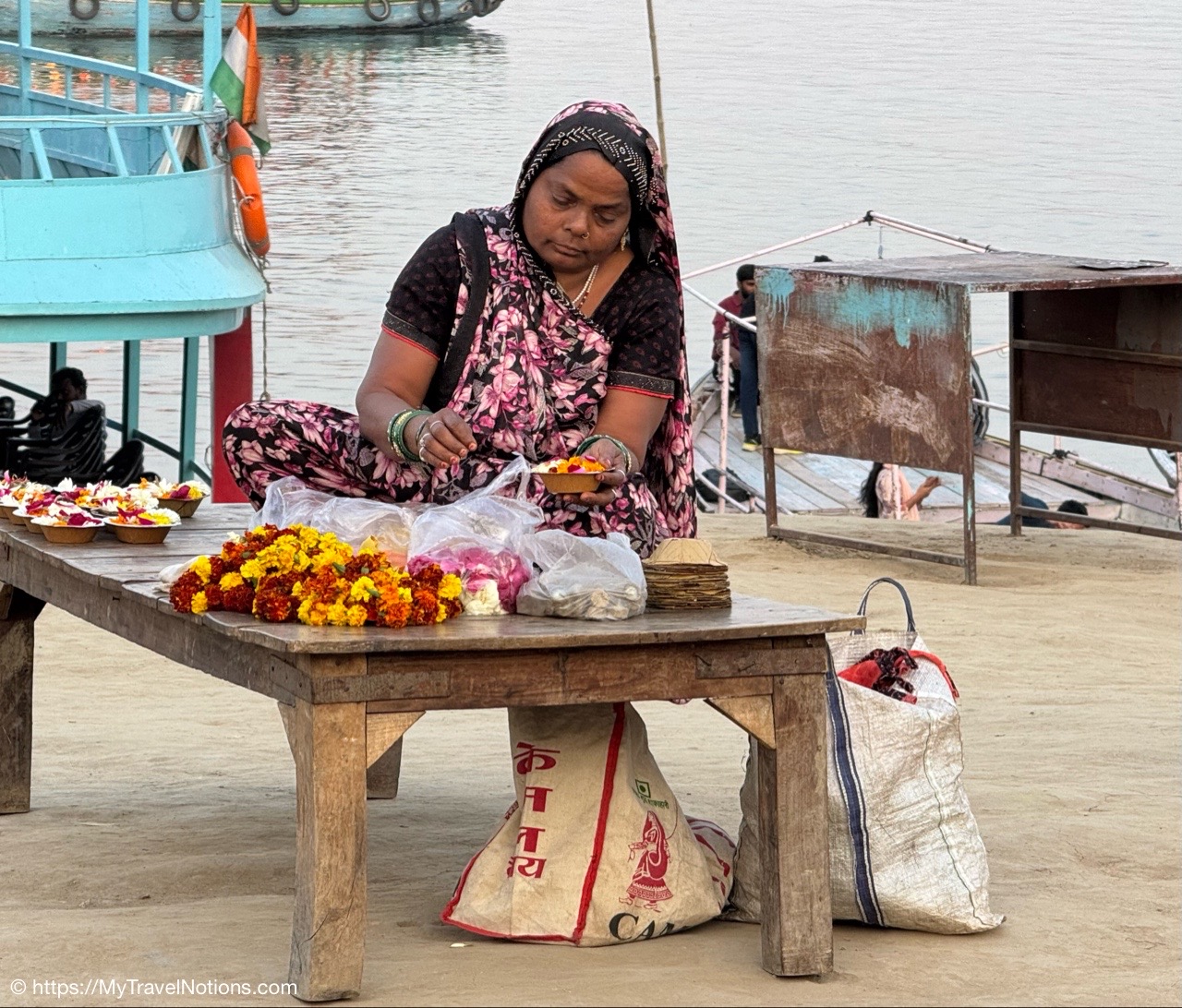 The flower lady selling flowers for the nightly Ganga Aarti ceremony at the banks of the Ganges river in Varanasi. (March 10, 2025)