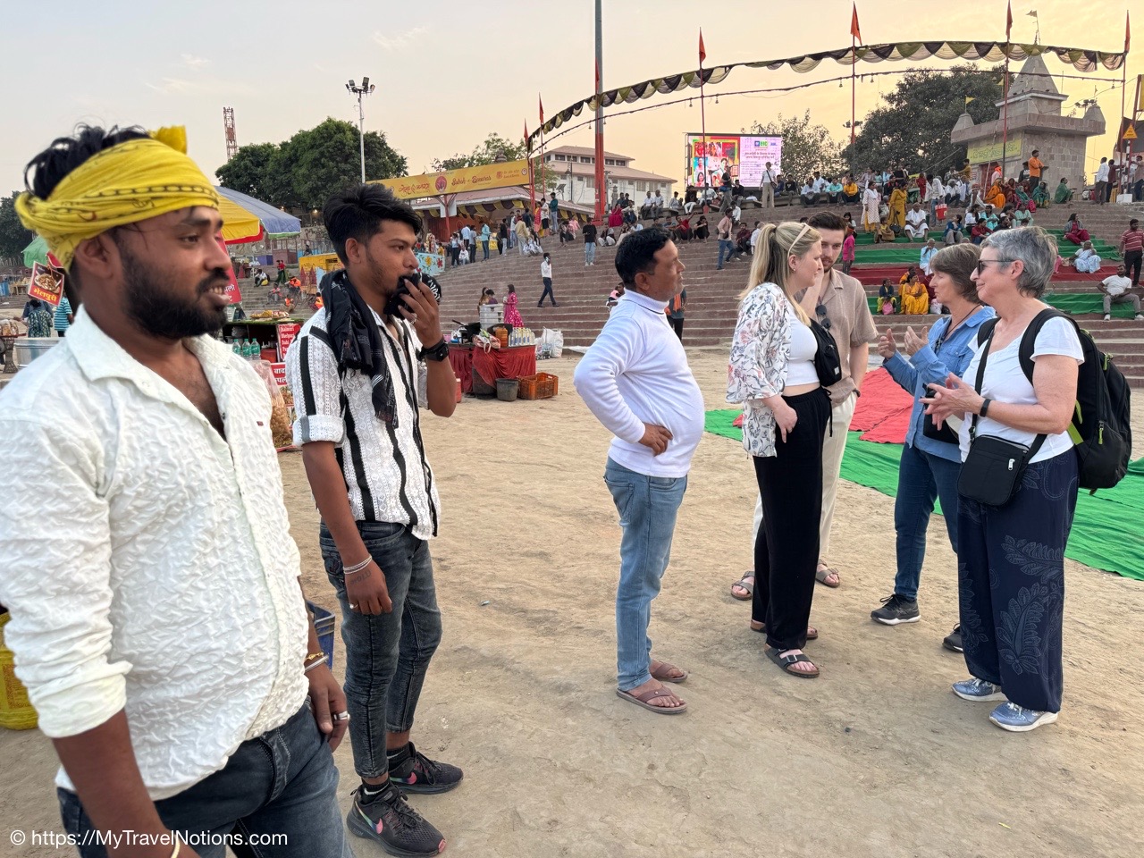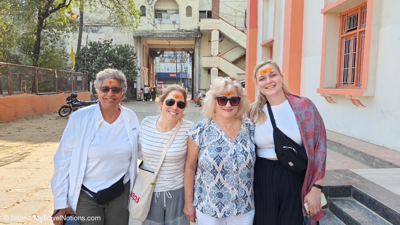 Blondes seem to get a lot of attention in India and Robyn, one of our travelers, caught a lot of attention and requests for photographs at the Dasaswamedh Ghat, a riverfront step leading to the Ganges river in Varanasi. The man standing next to Robyn on the left is trying to get a photo with her. (March 10, 2025)