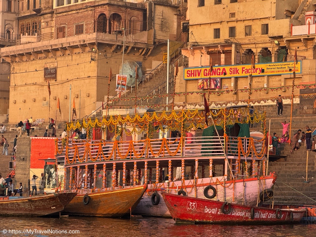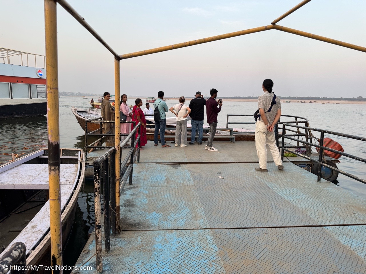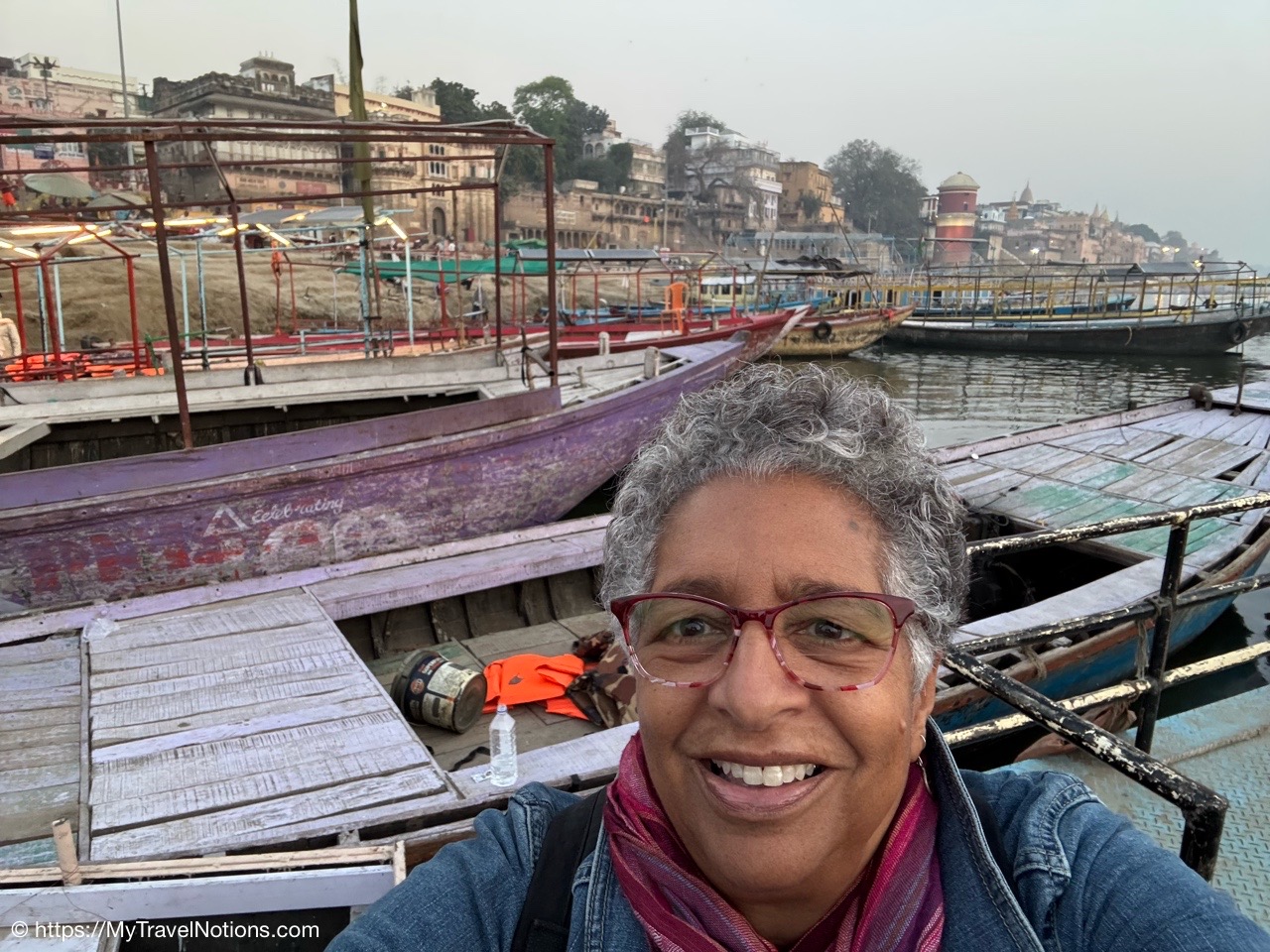 Getting ready to board our motorized wooden canoe-looking boat to experience sunrise over the Ganges River in Varanasi. (March 11, 2025)