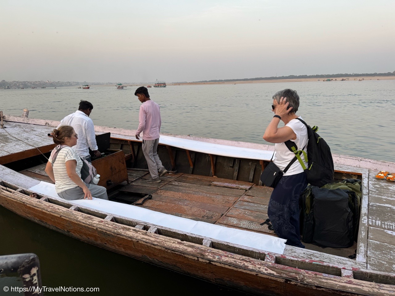 Boarding our motorized wooden canoe-like boat for an evening ride along the Ganges river in Varanasi. (March 10, 2025)