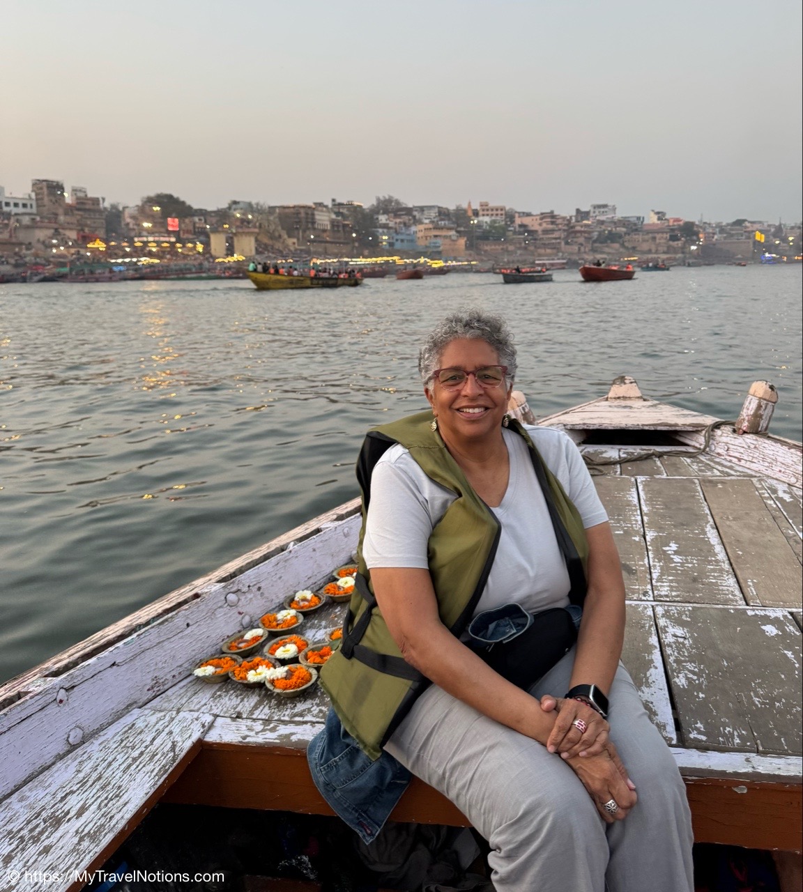 Me with my flower offering during our evening flower ceremony on the Ganges river from our motorized wooden canoe-like boat. Part of the nightly Ganga Aarti, it is a spiritual Hindu ritual performed in honor of the Ganges and is a symbolic tribute to its power and sanctity. Thanking Sarah for the photo. (March 10, 2025)