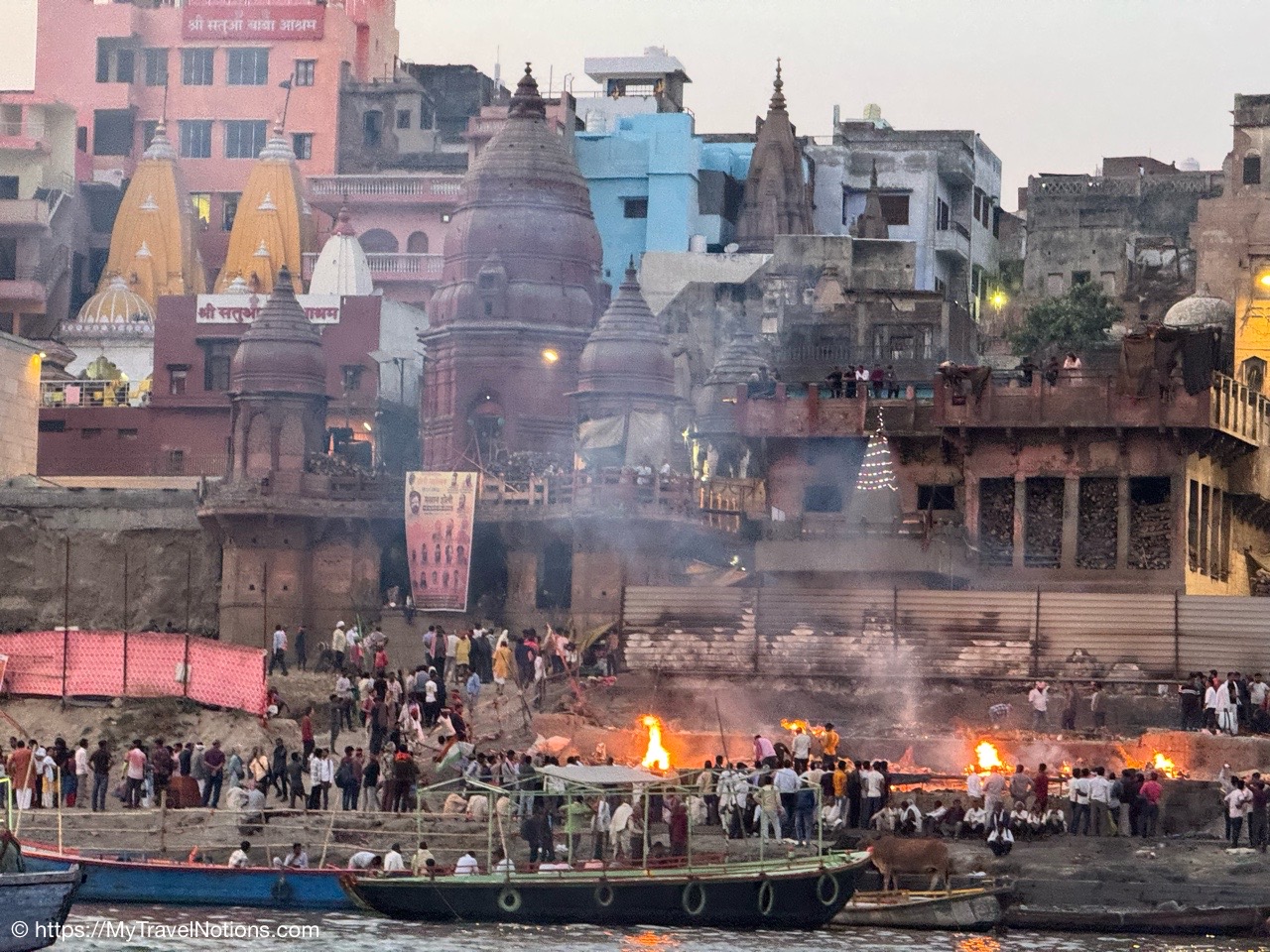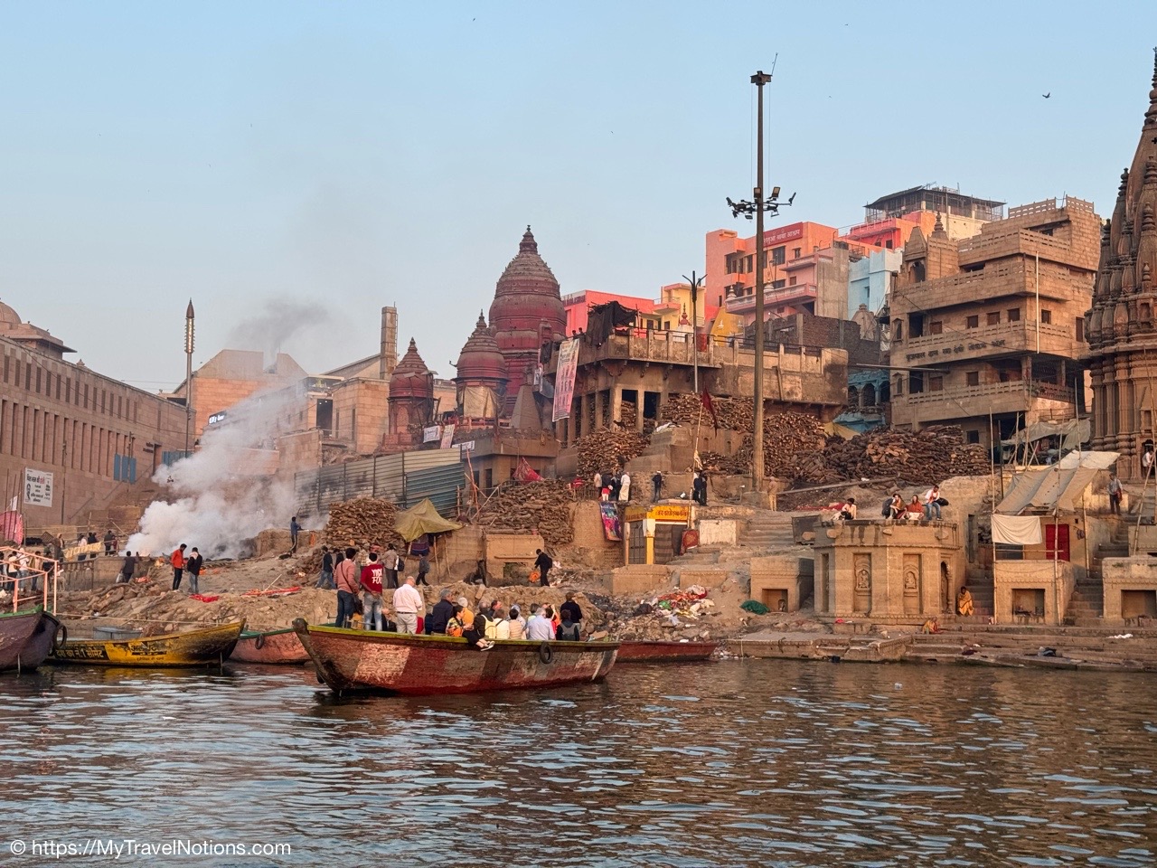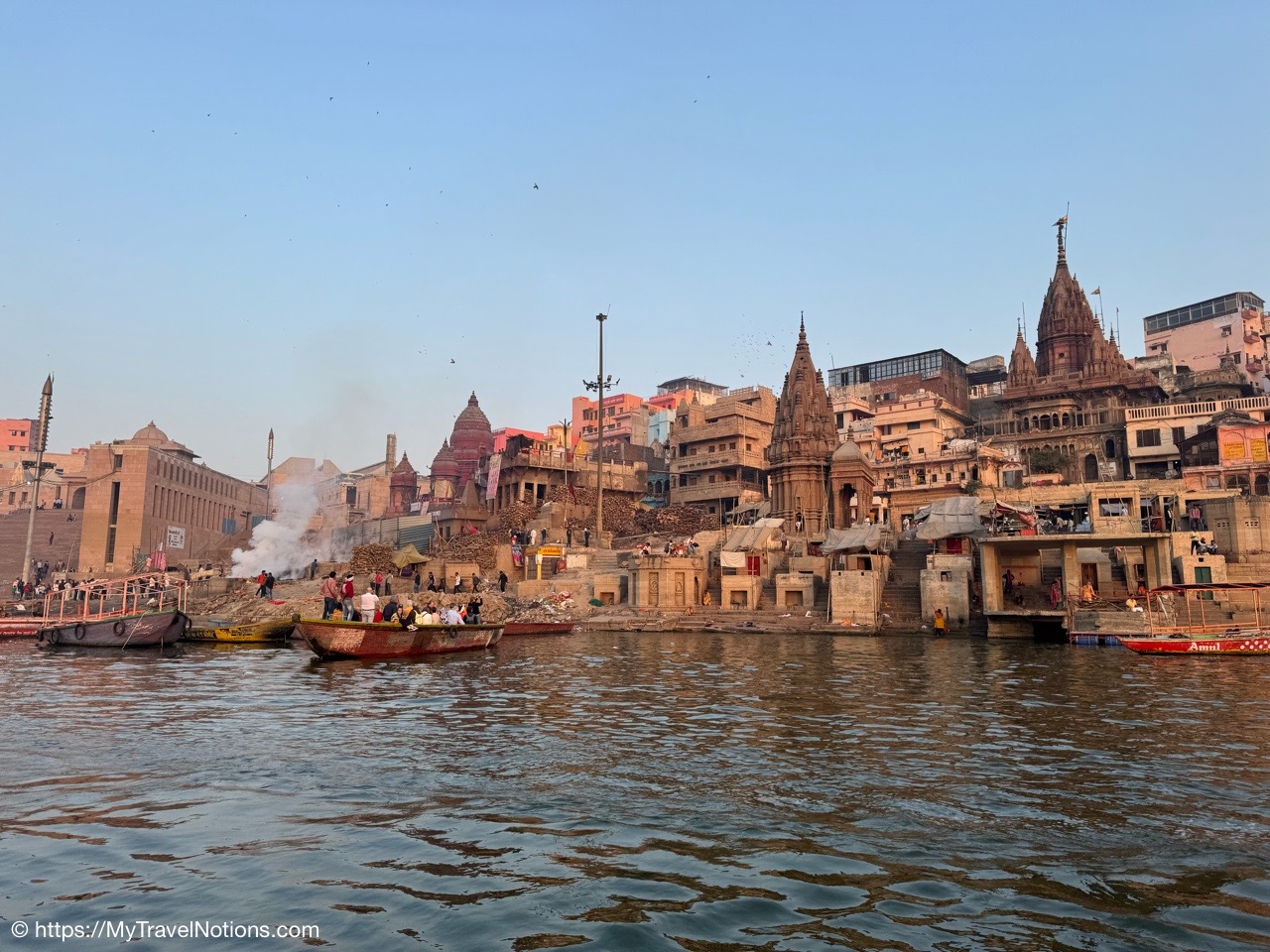 The billowing smoke clouds from the Manikarnika Ghat, the holy cremation ground, along the banks of the Ganges river signaling the end of life during our sunrise boat ride in Varanasi.(March 11, 2025)