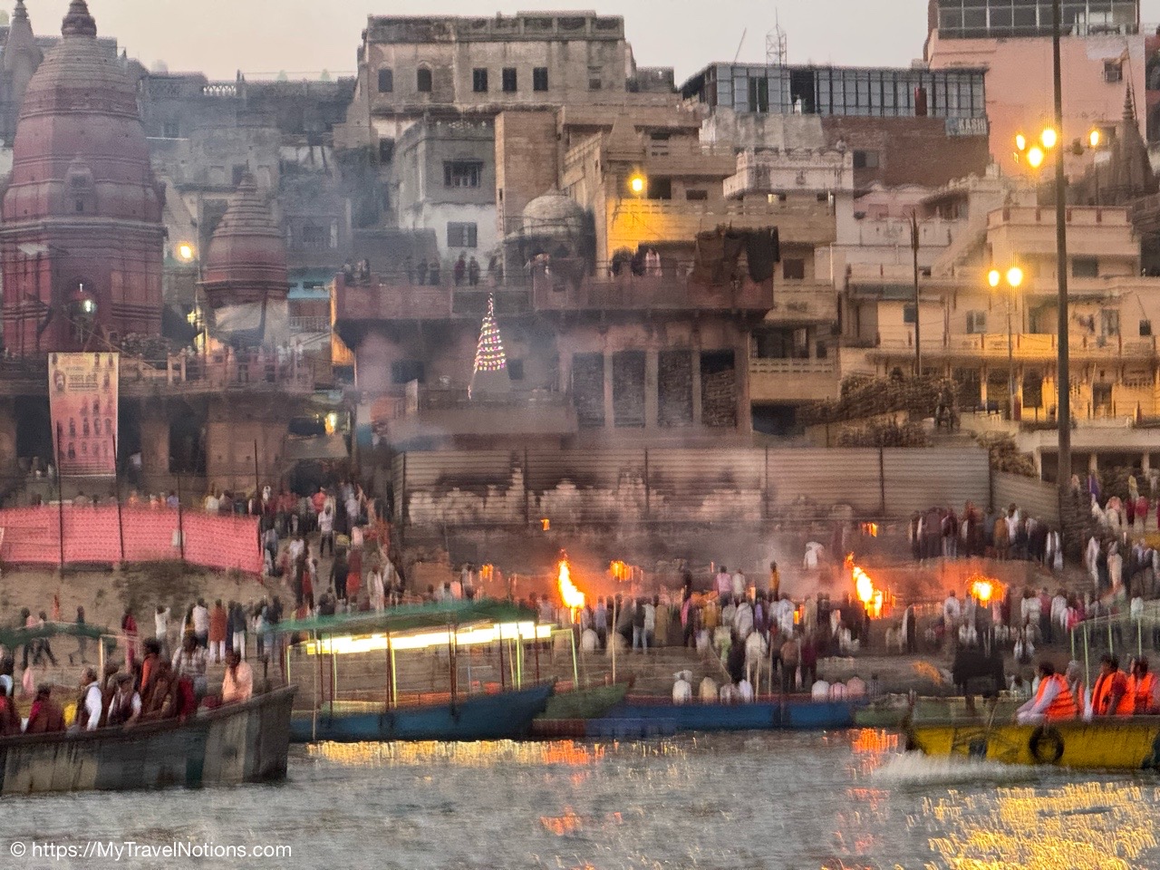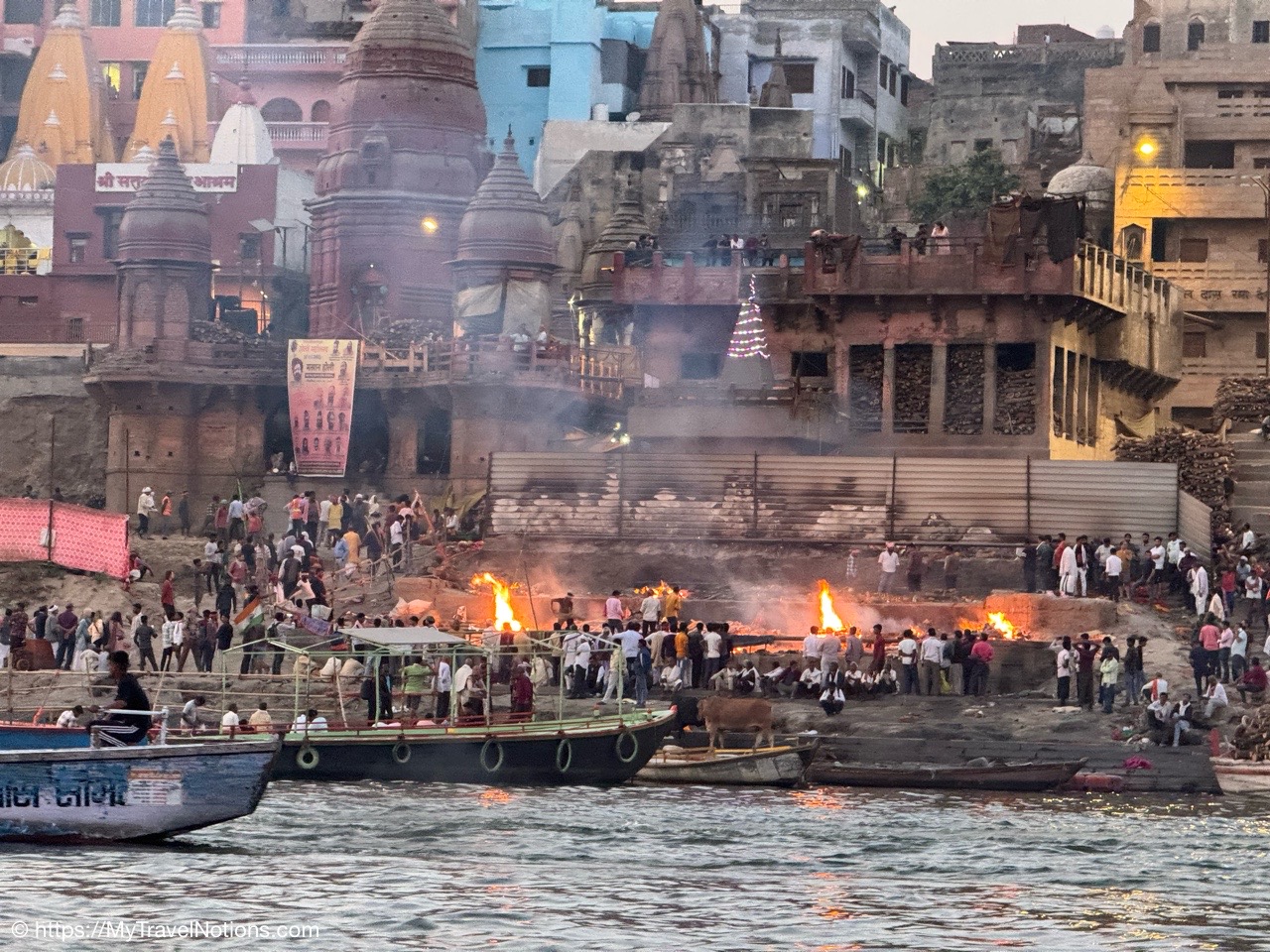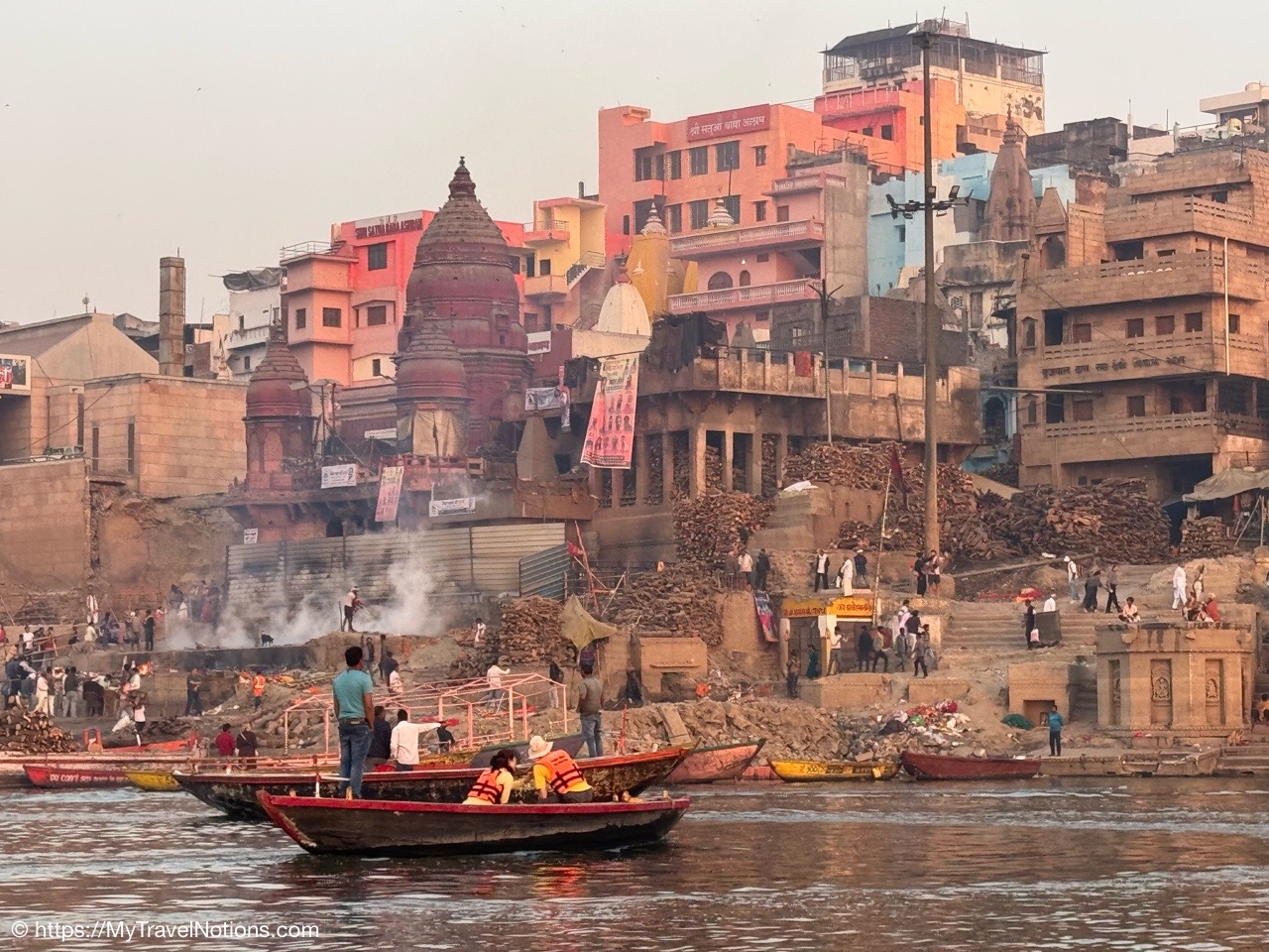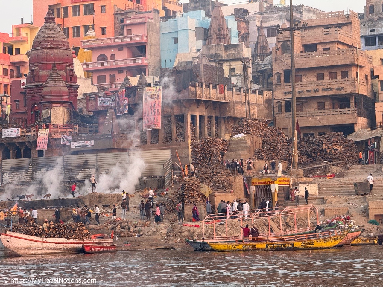 The billowing smoke clouds from the Manikarnika Ghat, the holy cremation ground, along the banks of the Ganges river signaling the end of life during our sunrise boat ride in Varanasi.(March 11, 2025)