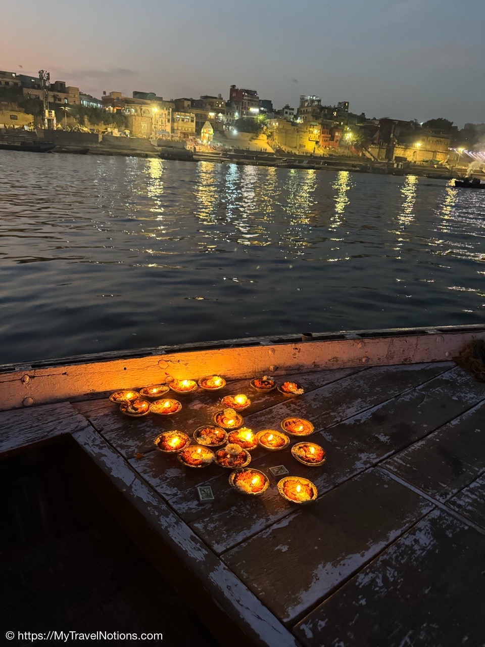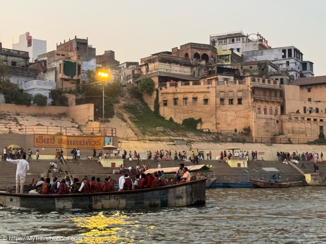 An evening boat ride in the Ganges River in Varanasi, India. Considered the spiritual capital of India, Varanasi is a mixture of extremes from calm to chaotic. Here on the Ganges it is calm. And in the background are the riverfront steps called ghats, of which there are 84 that leads to the banks of the Ganges river. Most of the ghats are bathing and puja ceremonial ghats, while two ghats are used exclusively as cremation sites. The buildings are temples and other historically significant structures like palaces and forts, reflecting Hindu and Mughal architectural influences. (March 10, 2025)