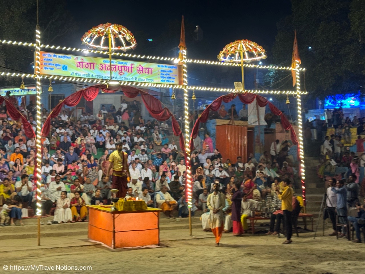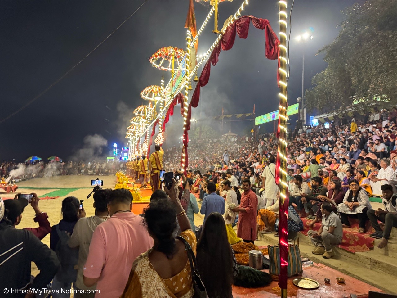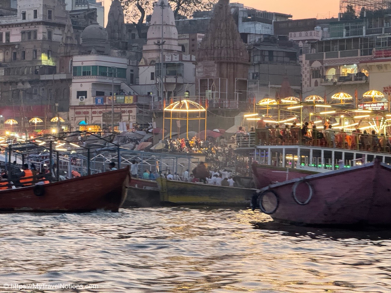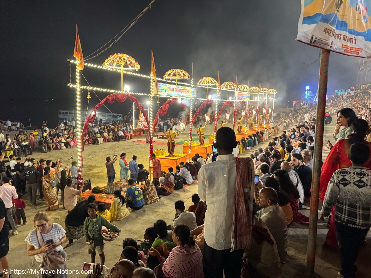 After the boat ride on the Ganges river in Varanasi, we stopped back at the Dasaswamedh Ghat where the nightly ceremony of the Ganga Aarti was underway. The ceremony, a devotional Hindu ritual performed every evening on the banks of the river, offering reverence to the Ganges, considered a living goddess.