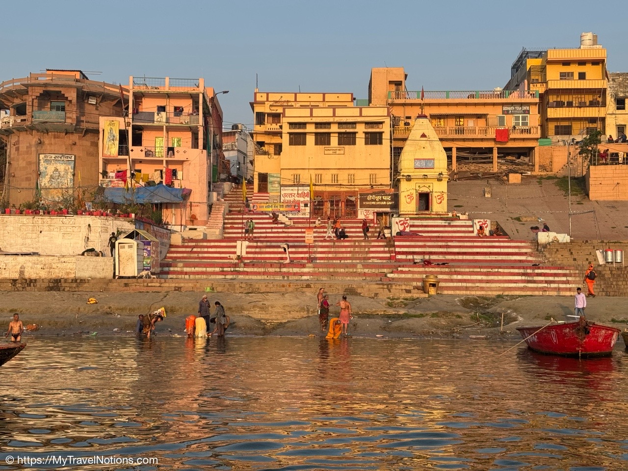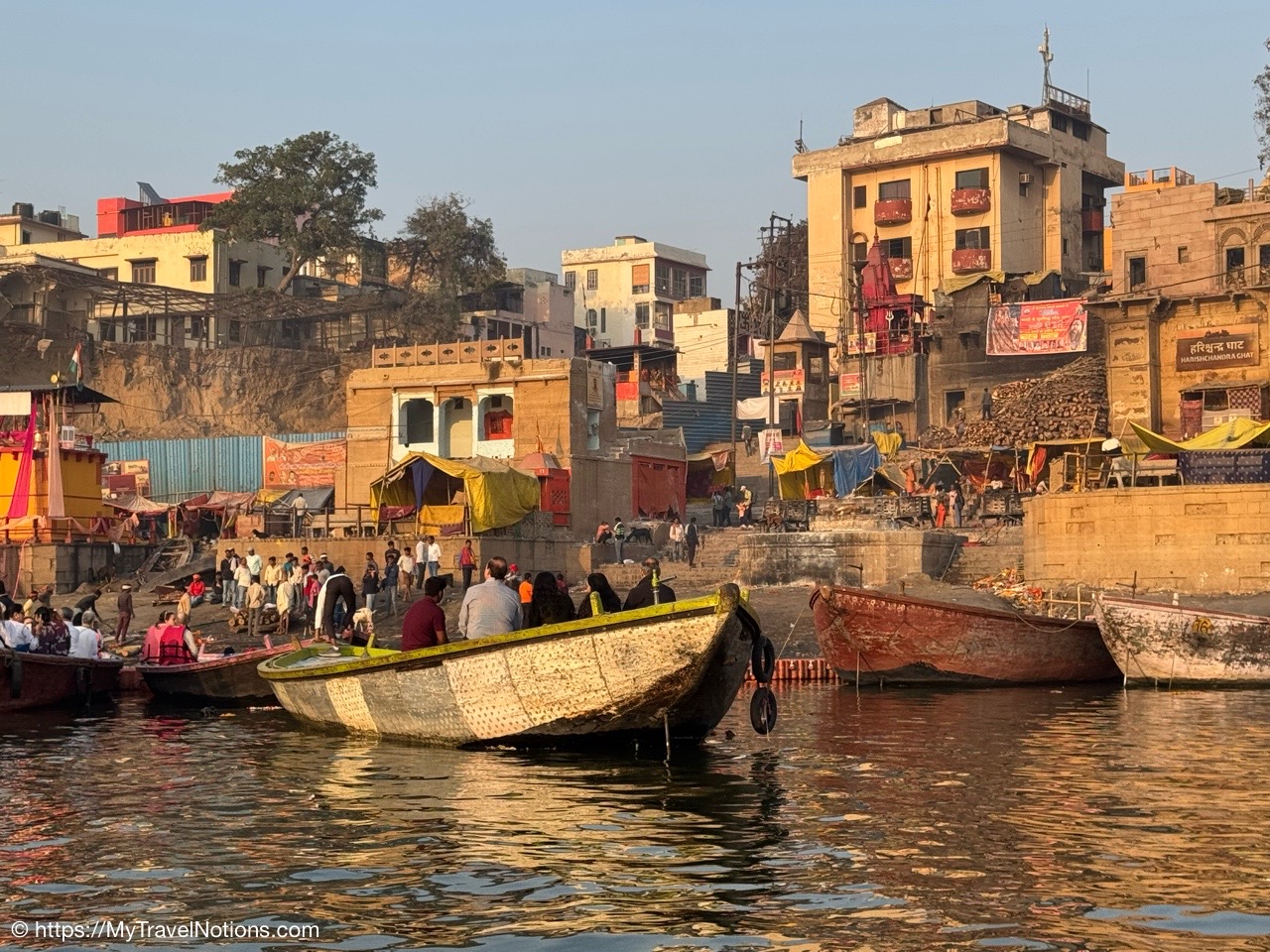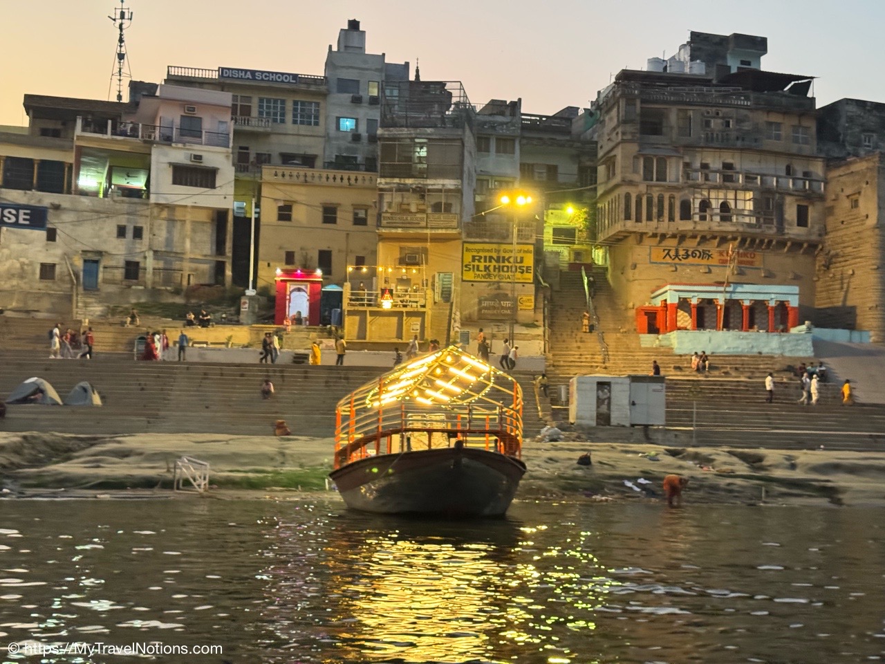 Heading towards our motorized wooden canoe-like boat for an evening ride along the Ganges river in Varanasi. (March 10, 2025)
