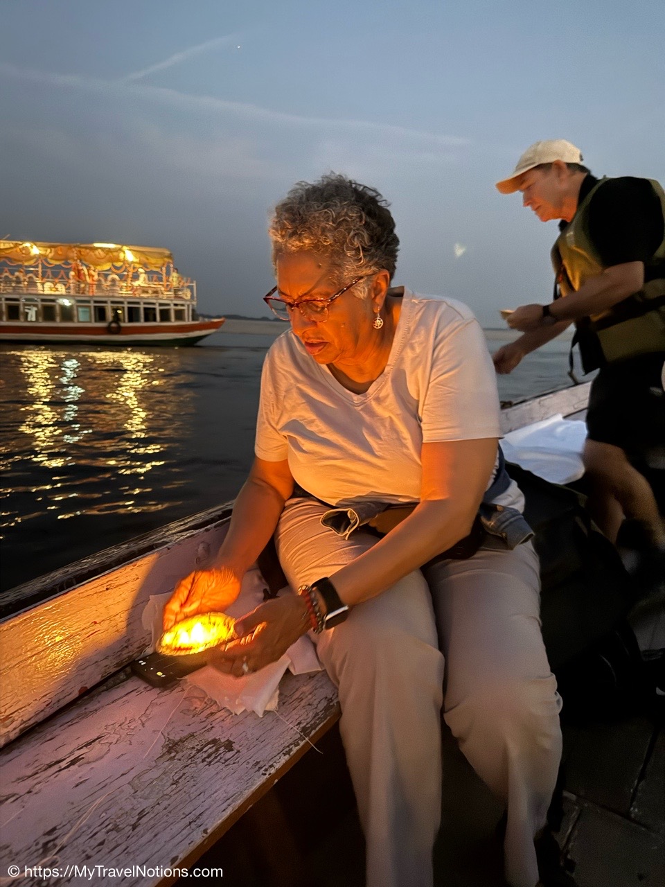 Our evening offering during our boat ride on the Ganges river in Varanasi of flowers and a candle on banana leaves to lay in the river and offer a special prayer for our ancestors from the mother goddess. (March 10, 2025)