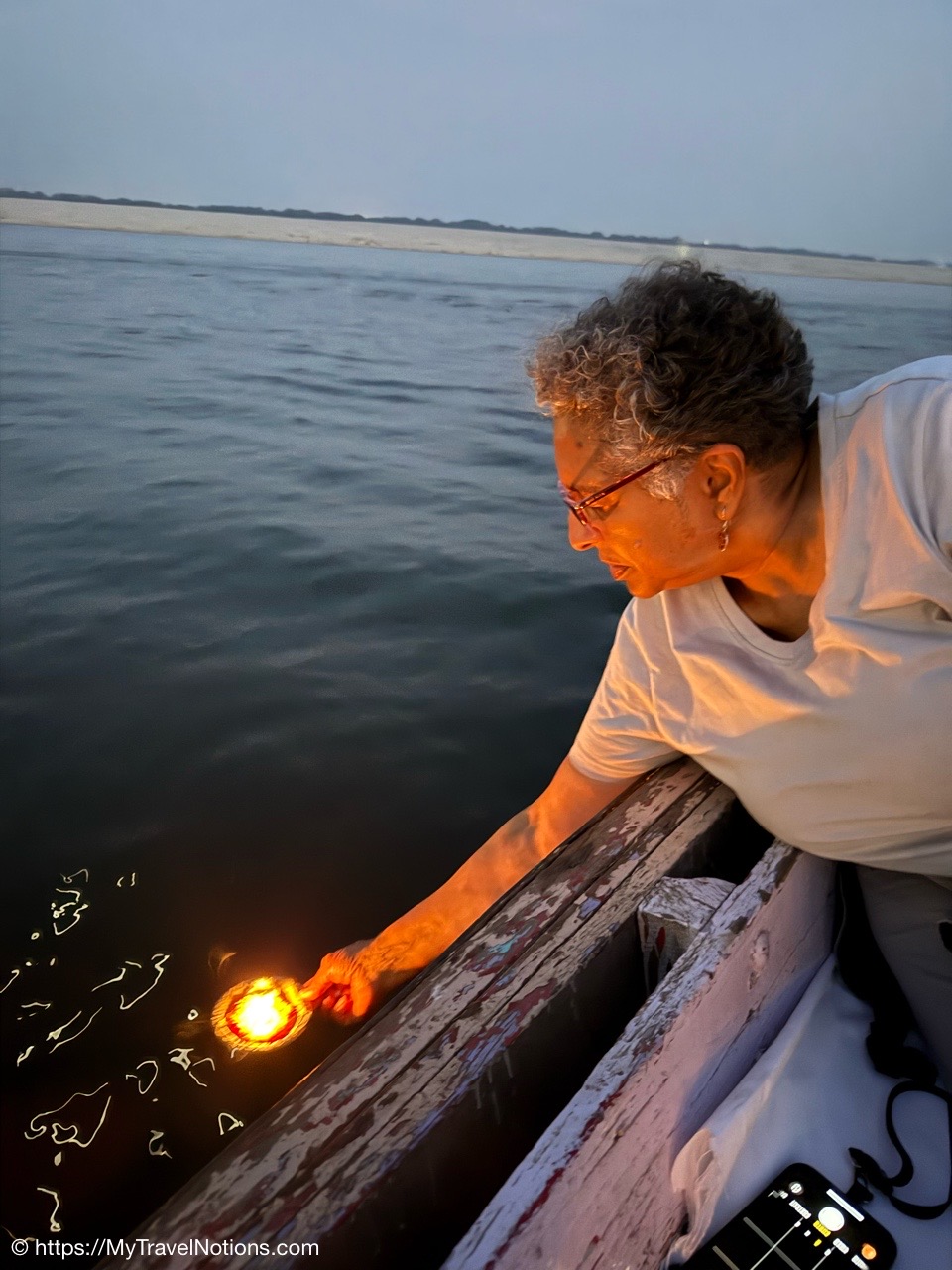 Me placing my flower offering onto the sacred river Ganges where worshippers bath in its waters and perform rituals at the ghats (steps) along the riverbank. Thanking Sarah for the photo. (March 10, 2025)