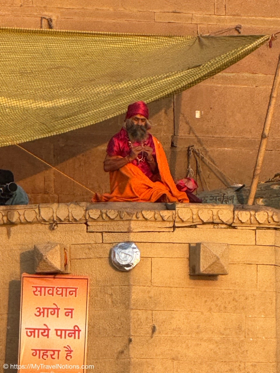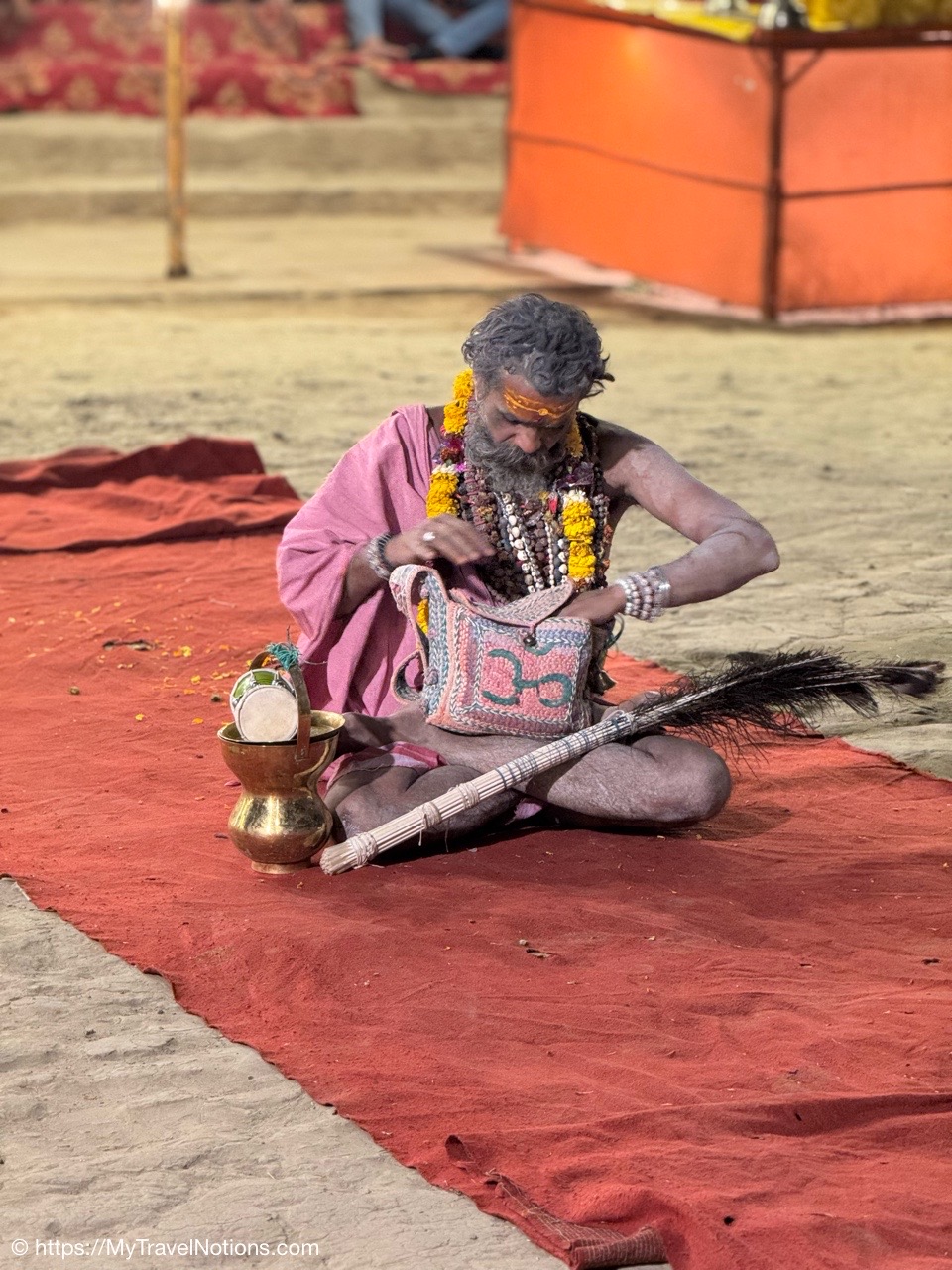 A holy man at the Dasaswamedh Ghat in Varanasi where the nightly ceremony of the Ganga Aarti was underway. (March 10, 2025)
