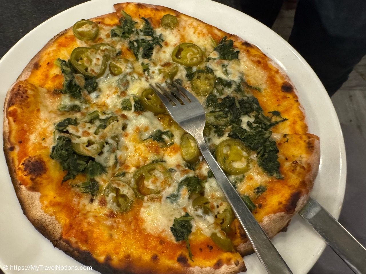 My Spinach and jalapeño pizza, which was quite delicious with a nice kick to it, at the Pizzeria Yaatika Cafe on the banks of the Ganges river in Varanasi. (March 10, 2025)