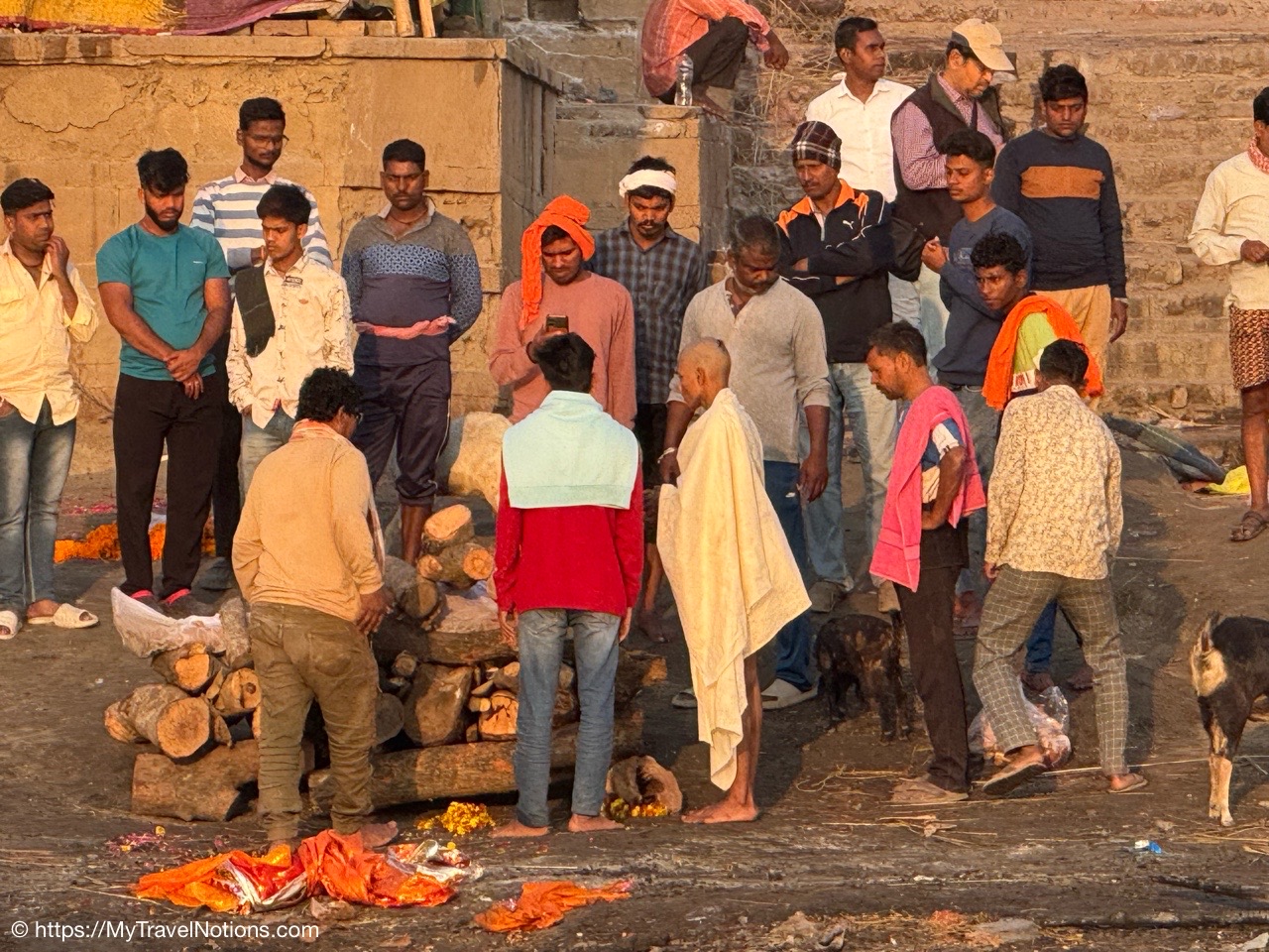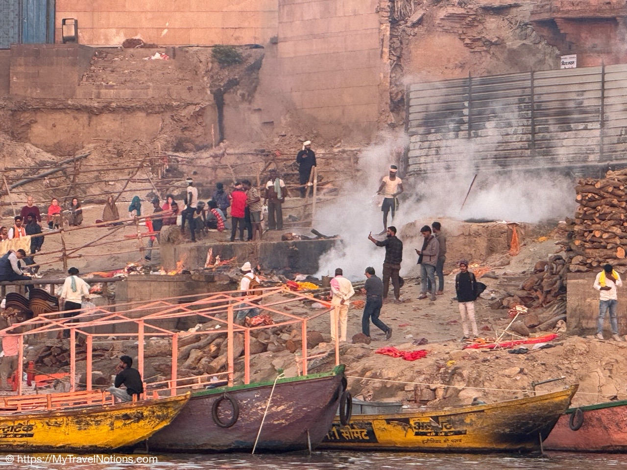 A family gathering at the cremation site during our sunrise boat ride over the Ganges river in Varanasi. (March 11, 2025)