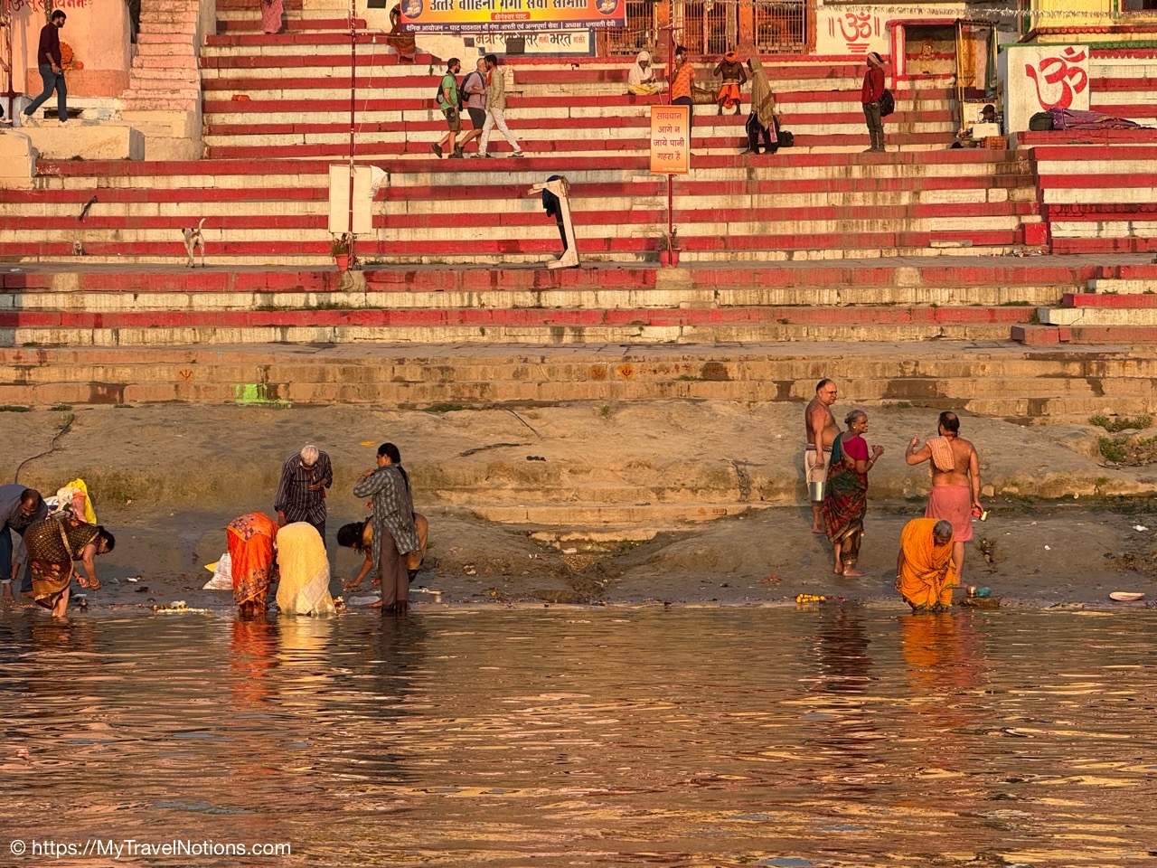 People bathing and walking in the Ganges river in Varanasi during our sunrise boat ride. The river goddess is believed to wash away sins and bestow spiritual purification. (March 11, 2025)