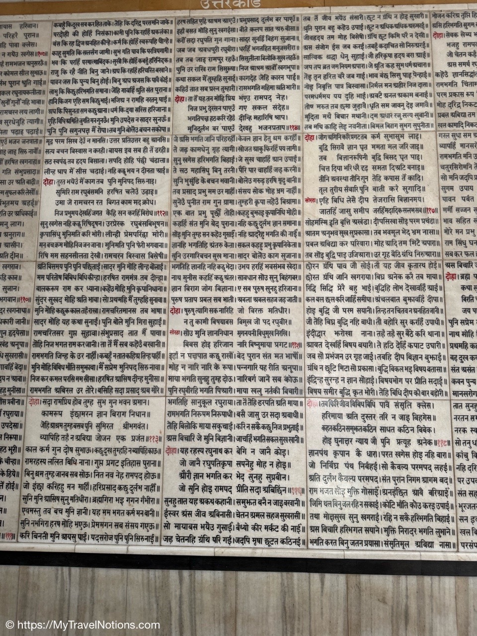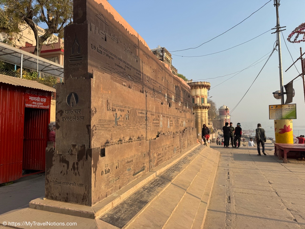 An engraved historical timeline block on the terrace along the Ganges river provides