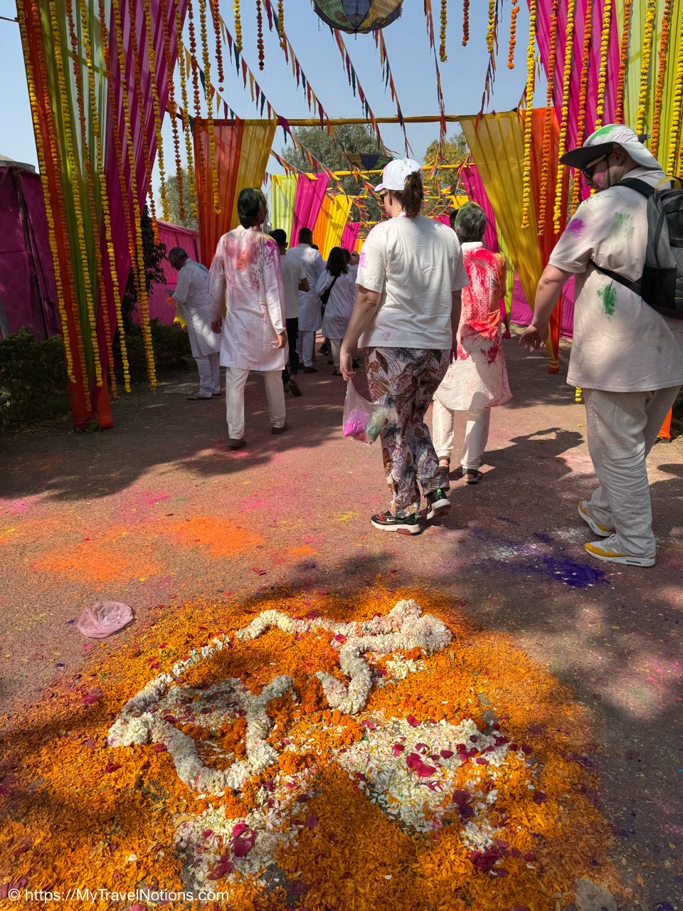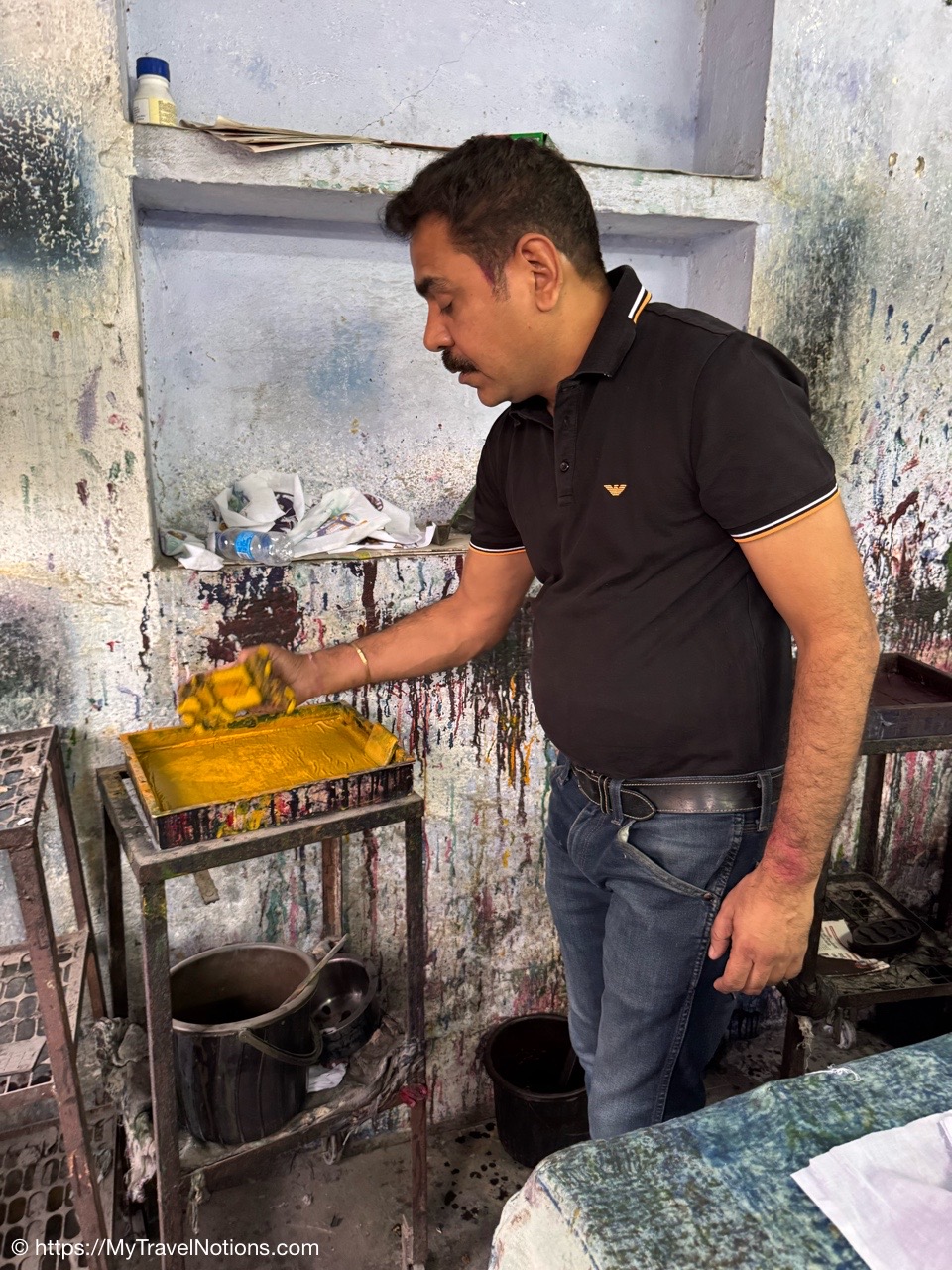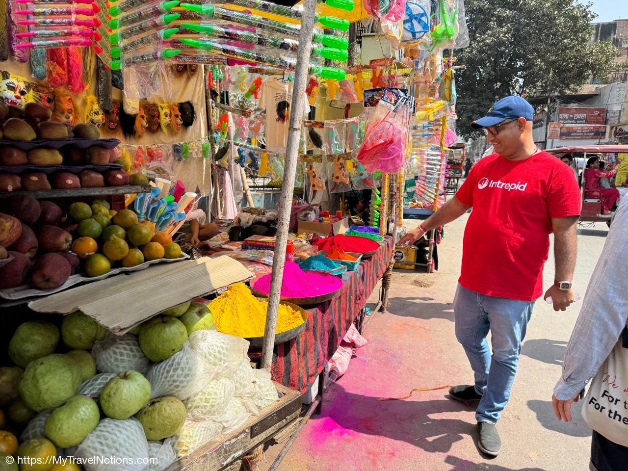 Walking along the streets of Varanasi. Our Intrepid leader, stopping to show us the dyes being sold in preparation of the coming Holi Festival celebrate. The “Festival of Colors,” is a major Hindu festival celebrated on the last full moon of the Hindu lunar calendar, typically in March to mark the arrival of spring, the end of winter, and the triumph of good over evil, as well as to celebrate love and divine relationships. (March 11, 2025)
