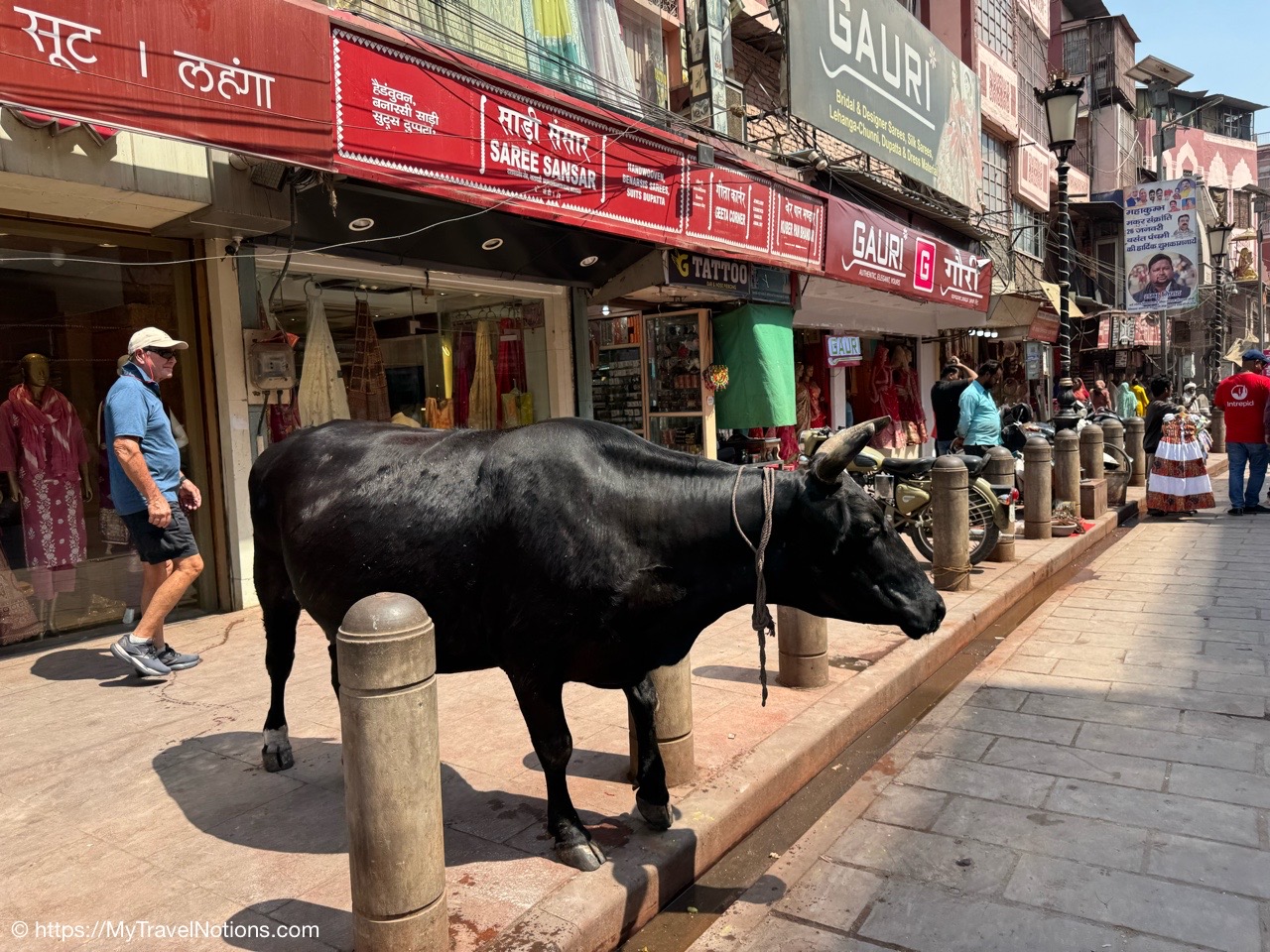 A cow on the sidewalk along the streets of Varanasi. (March 11, 2025)
