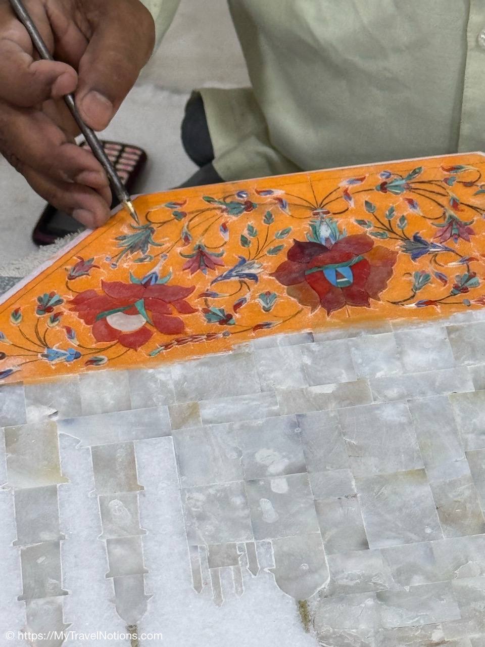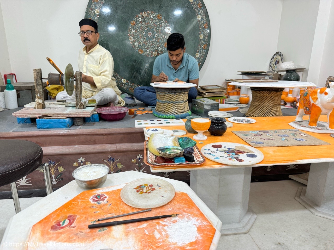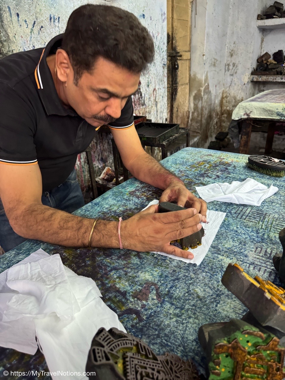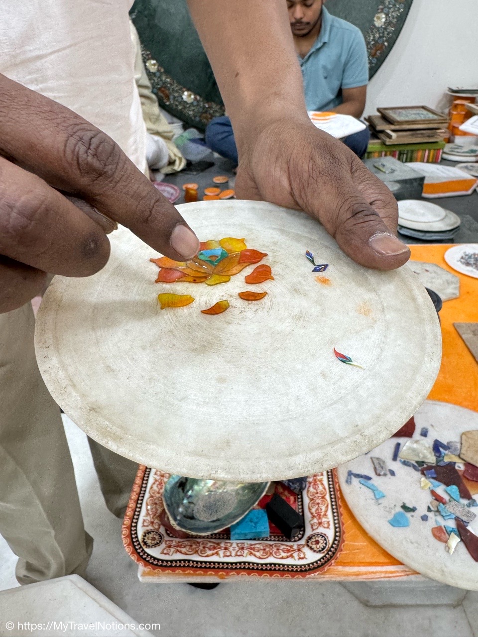 Showing of the workmanship of a beautiful scarfs or pashminas in Varanasi. (March 11, 2025)