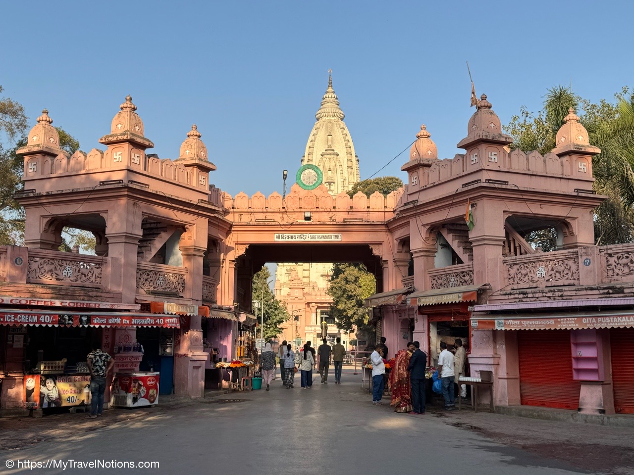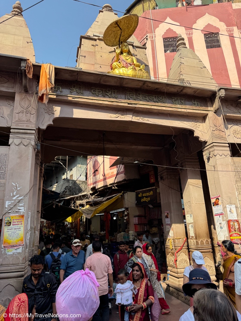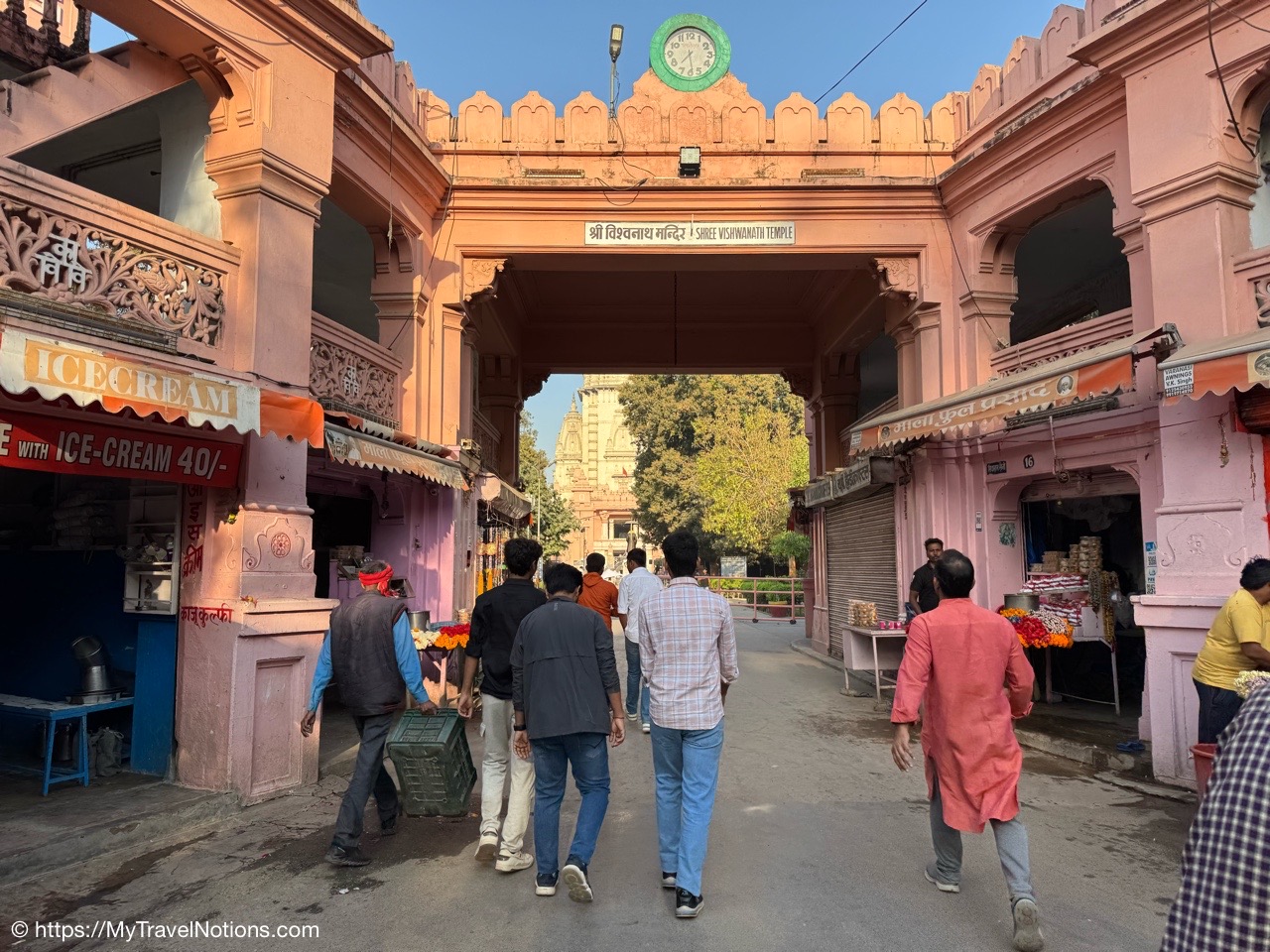 Exiting the shop-filled alleyways in Varanasi to have our vegetarian lunch in Varanasi. (March 11, 2025)