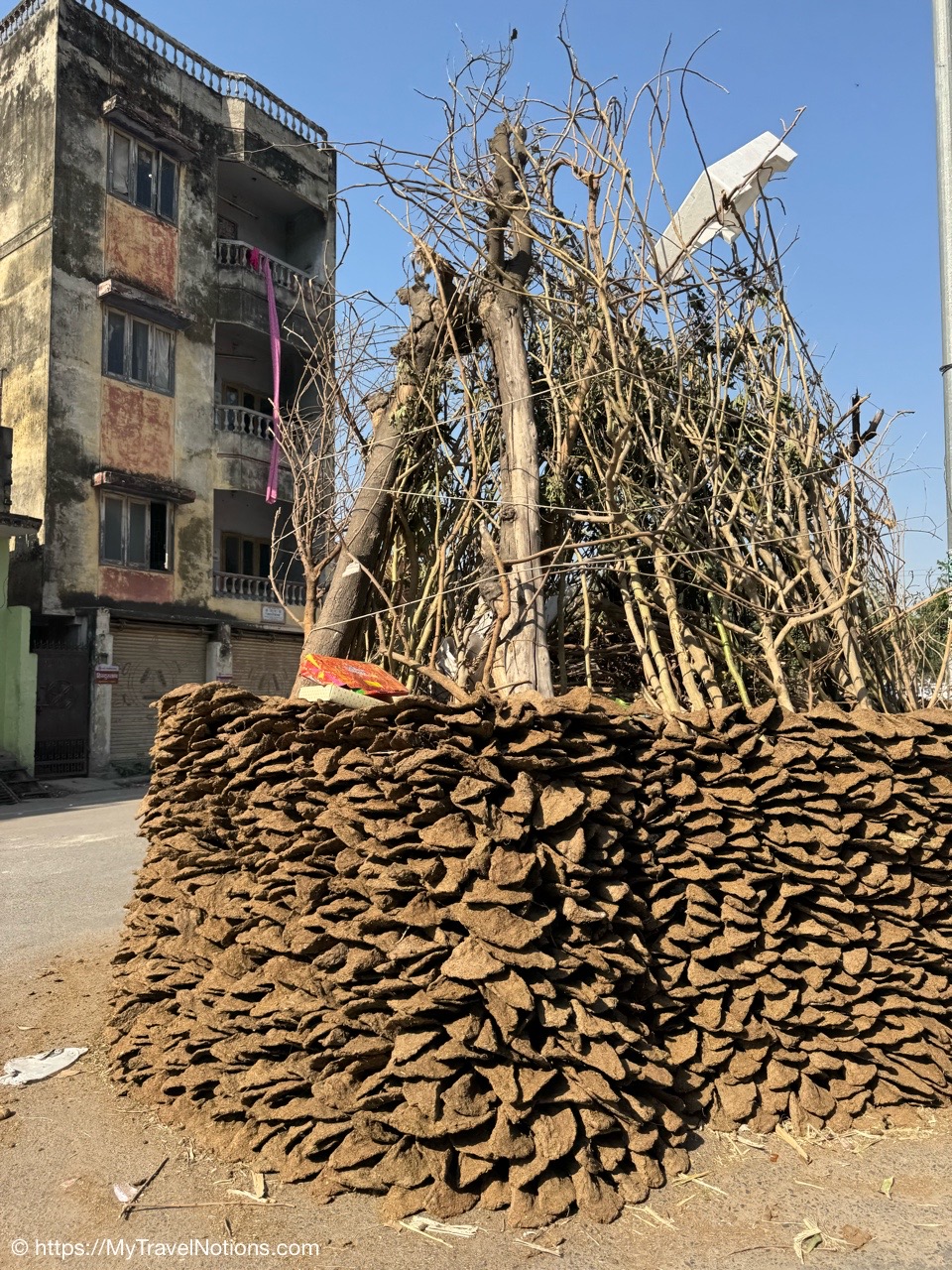 The billowing smoke clouds from the Manikarnika Ghat, the holy cremation ground, along the banks of the Ganges river signaling the end of life during our sunrise boat ride in Varanasi. Fire pits, fed each day by thousands of pounds of wood, burn the bodies of the dead brought here by grieving family members. What surprised me was the lack of smell which might have been masked by the flowers (March 11, 2025)
