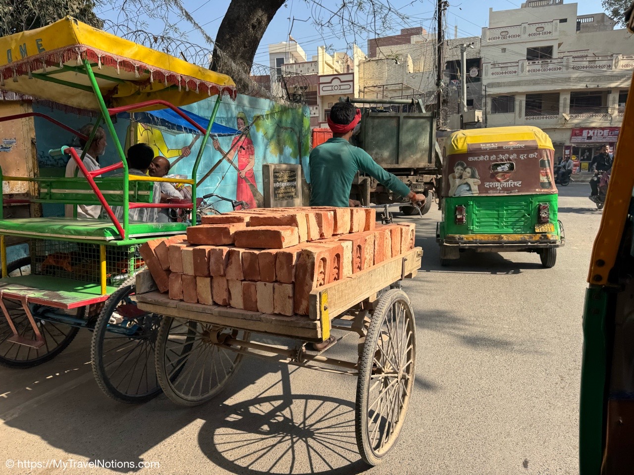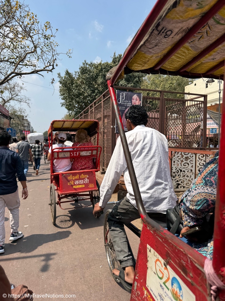 Riding in a cycle rickshaw (that’s the back of my hard-working cycle rickshaw driver) along the Chandni Chowk a historic, bustling market area and road in Old Delhi. (March 17, 2025)