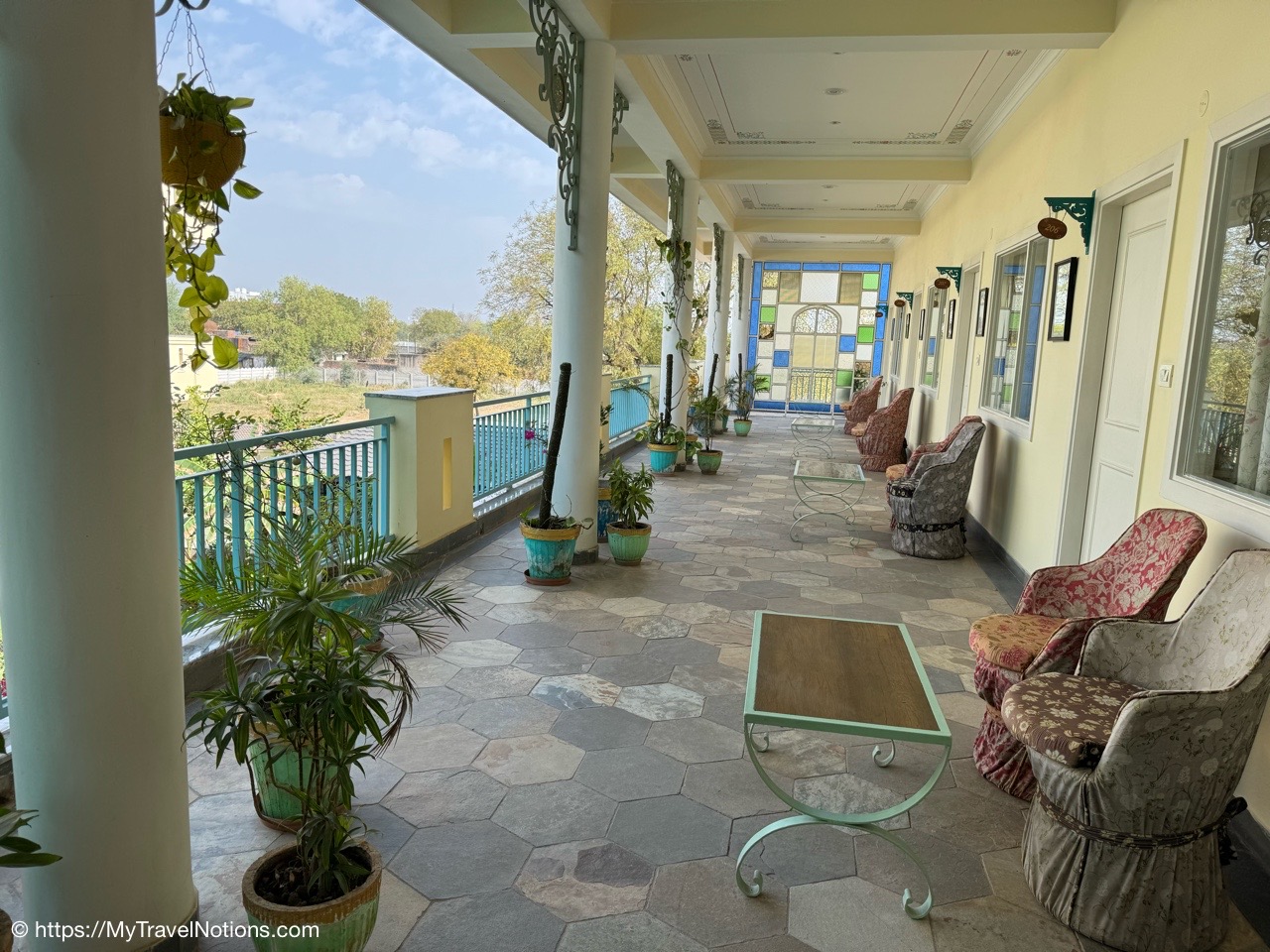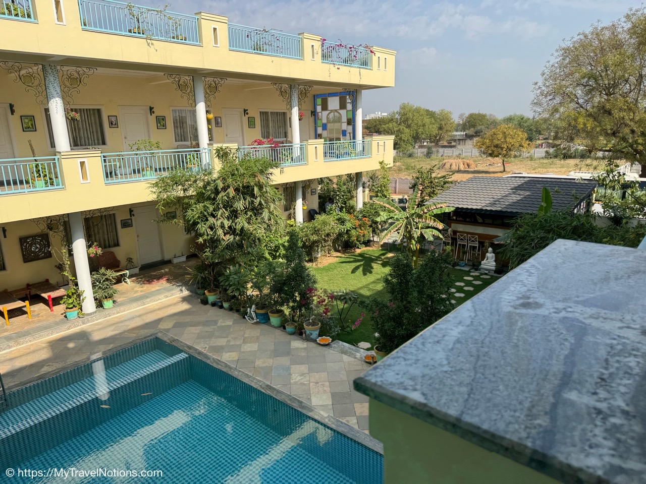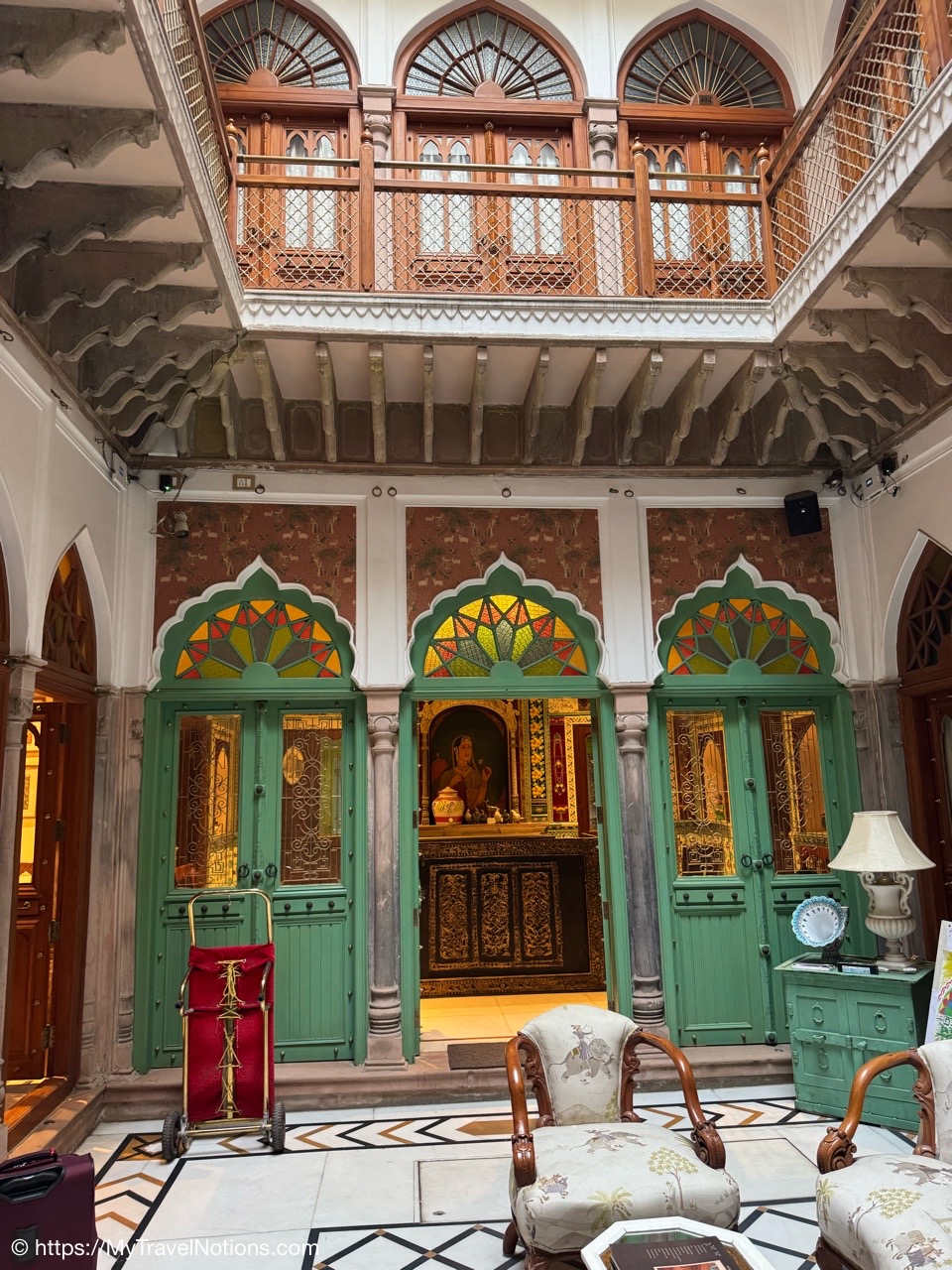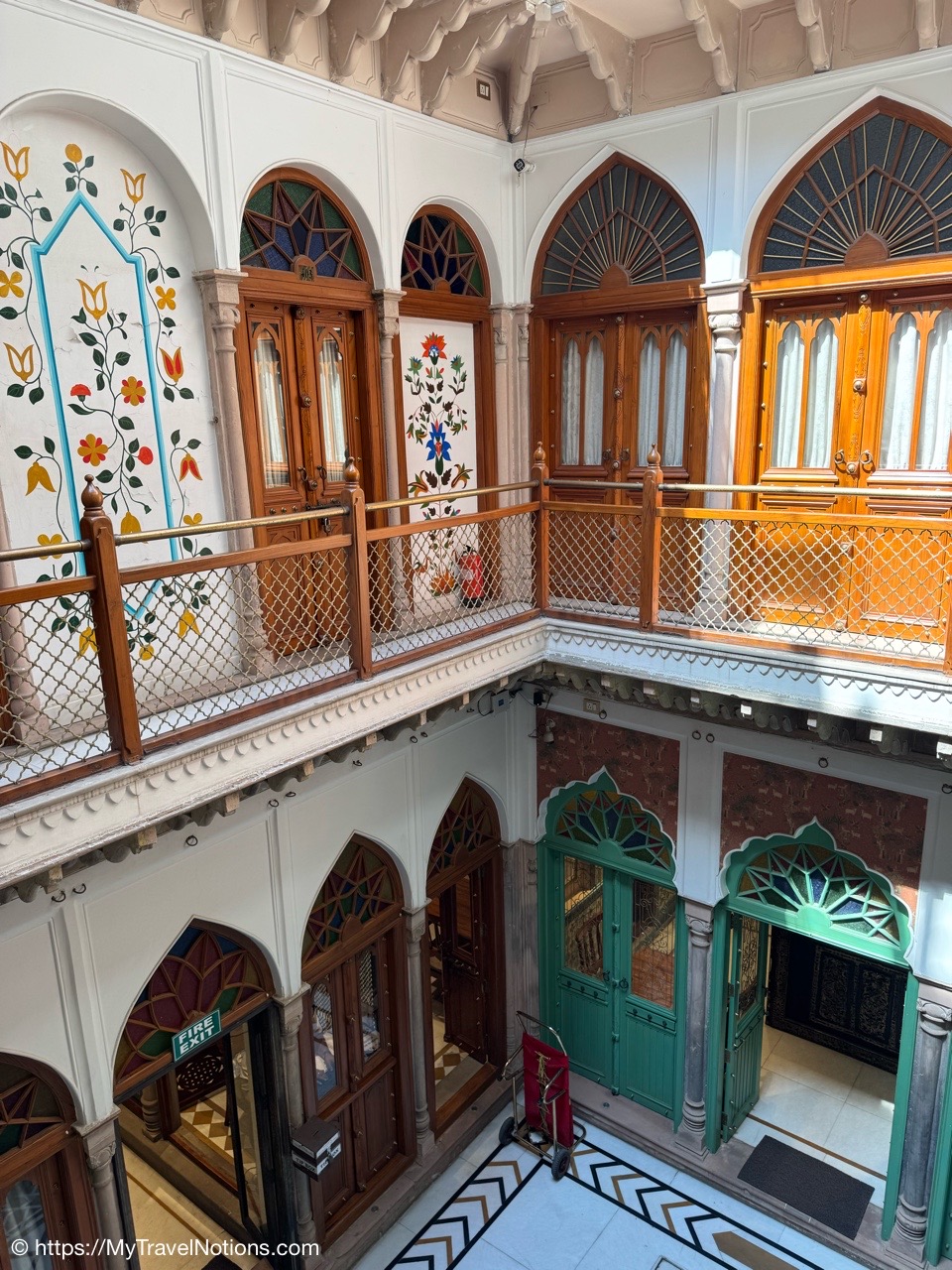Looking down onto the lobby area of my 2nd floor room where I stayed at the Haveli Dharampura, a UNESCO awarded boutique hotel in the heart of Old Delhi. (March 20, 2025)