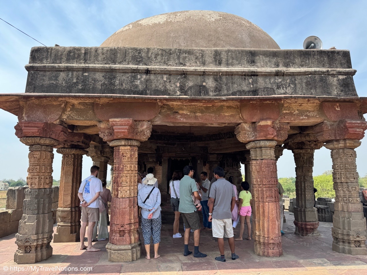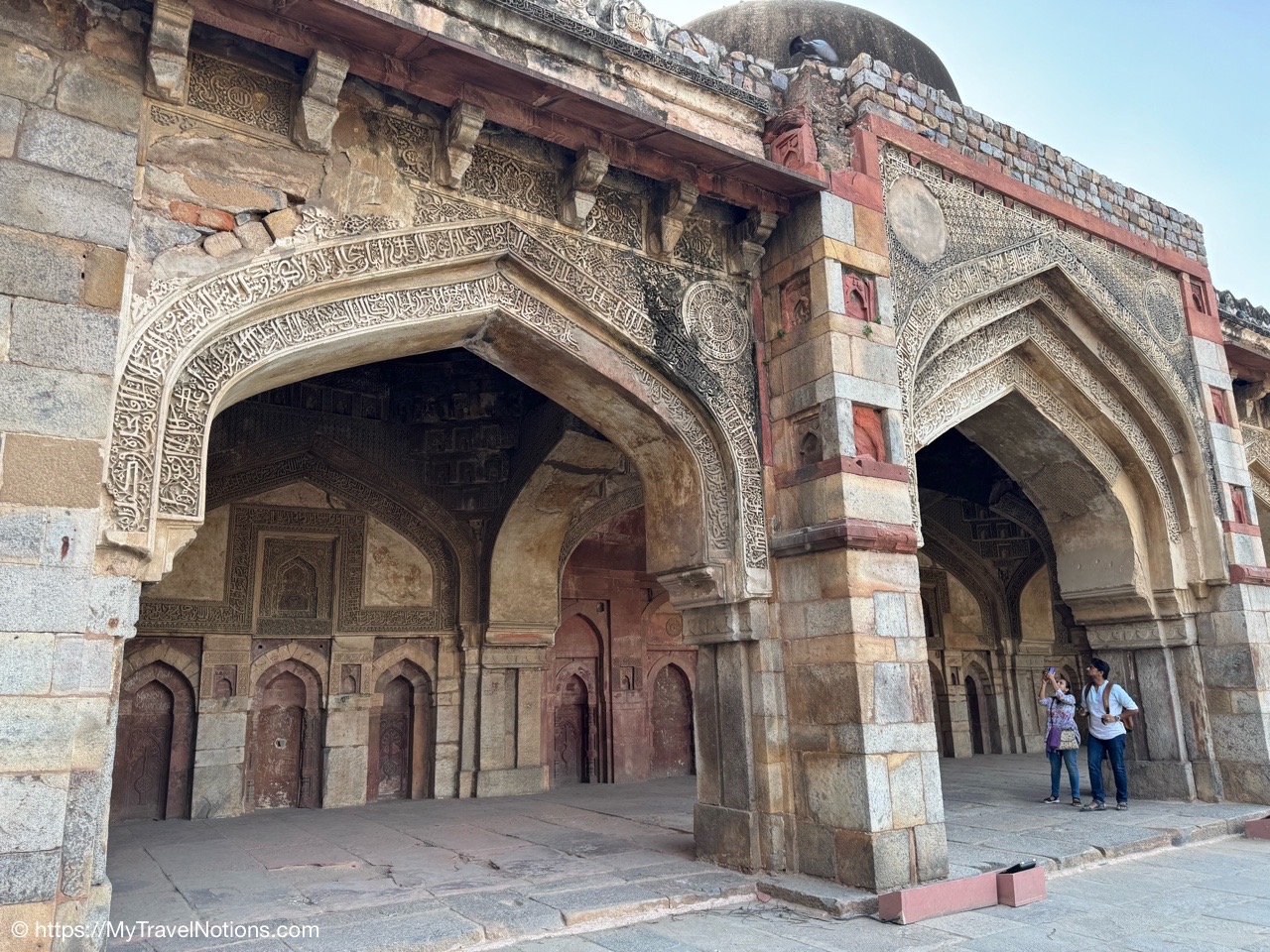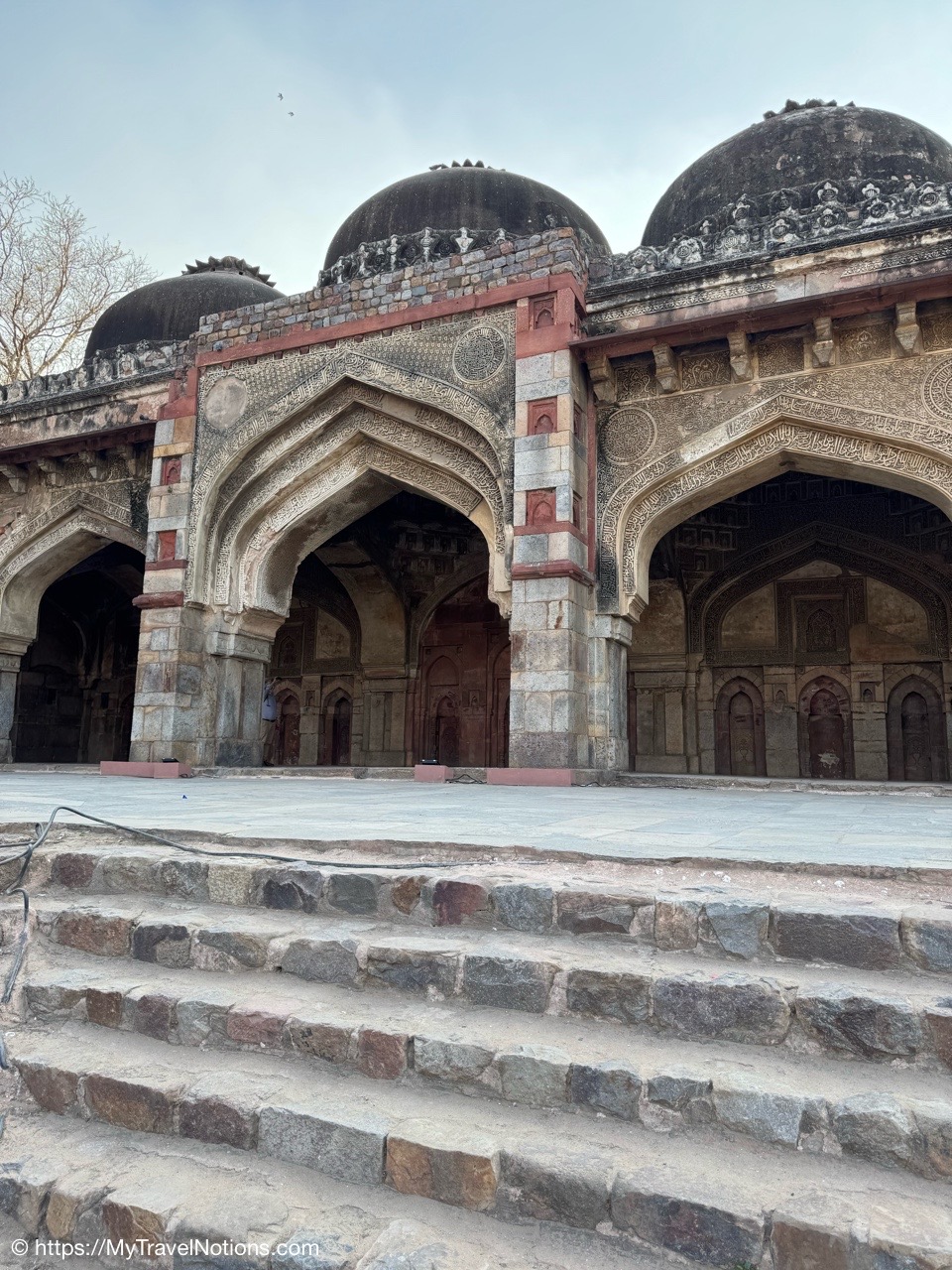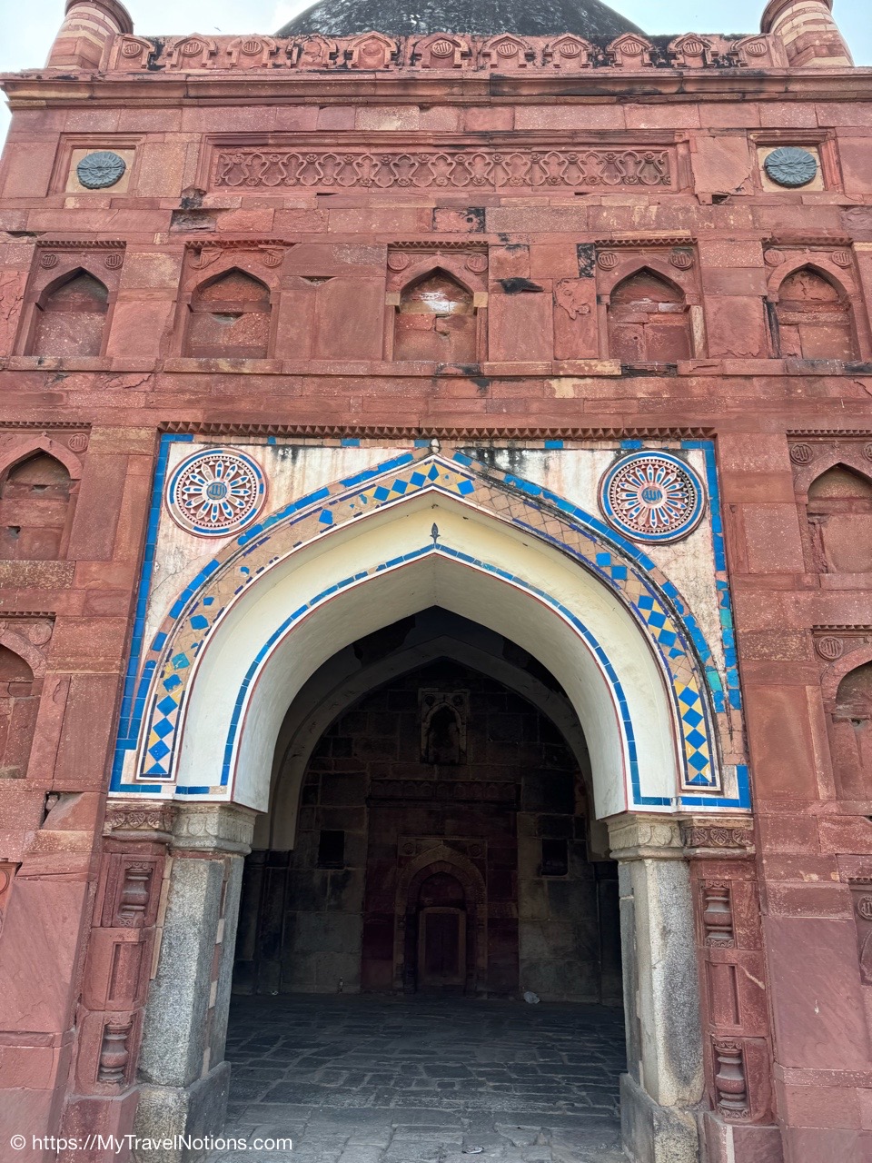 Isa Khan’s Garden Tomb in Delhi. The mausoleum is built mainly with grey quartzite with red sandstone used for ornamentation. The square head doorway of the gate chamber has been built in Hindu architectural style. (March 17, 2025)