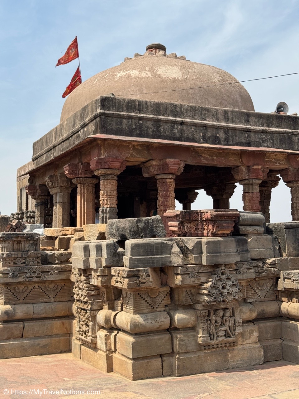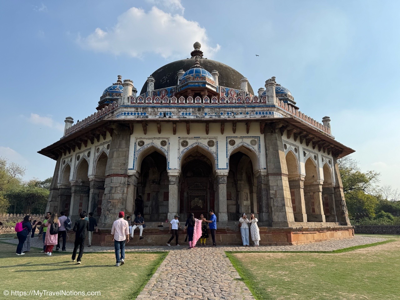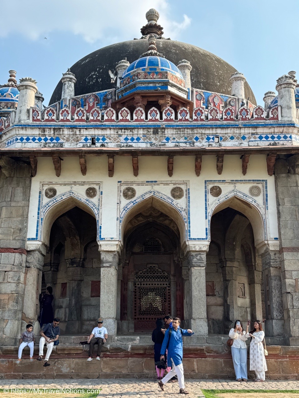 Isa Khan’s Garden Tomb in Delhi. The mausoleum is built mainly with grey quartzite with red sandstone used for ornamentation. The square head doorway of the gate chamber has been built in Hindu architectural style.(March 17, 2025)