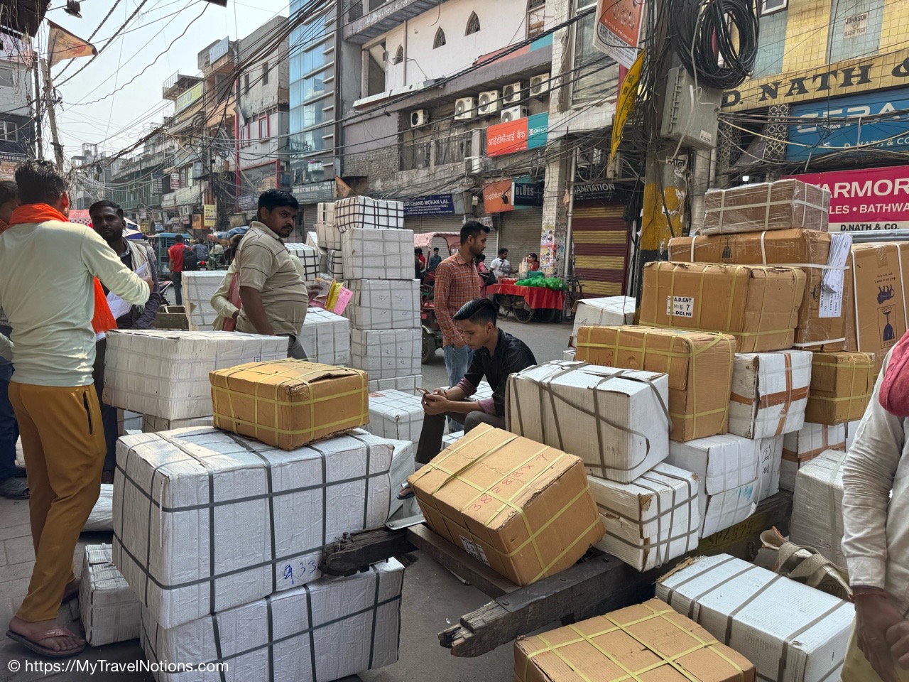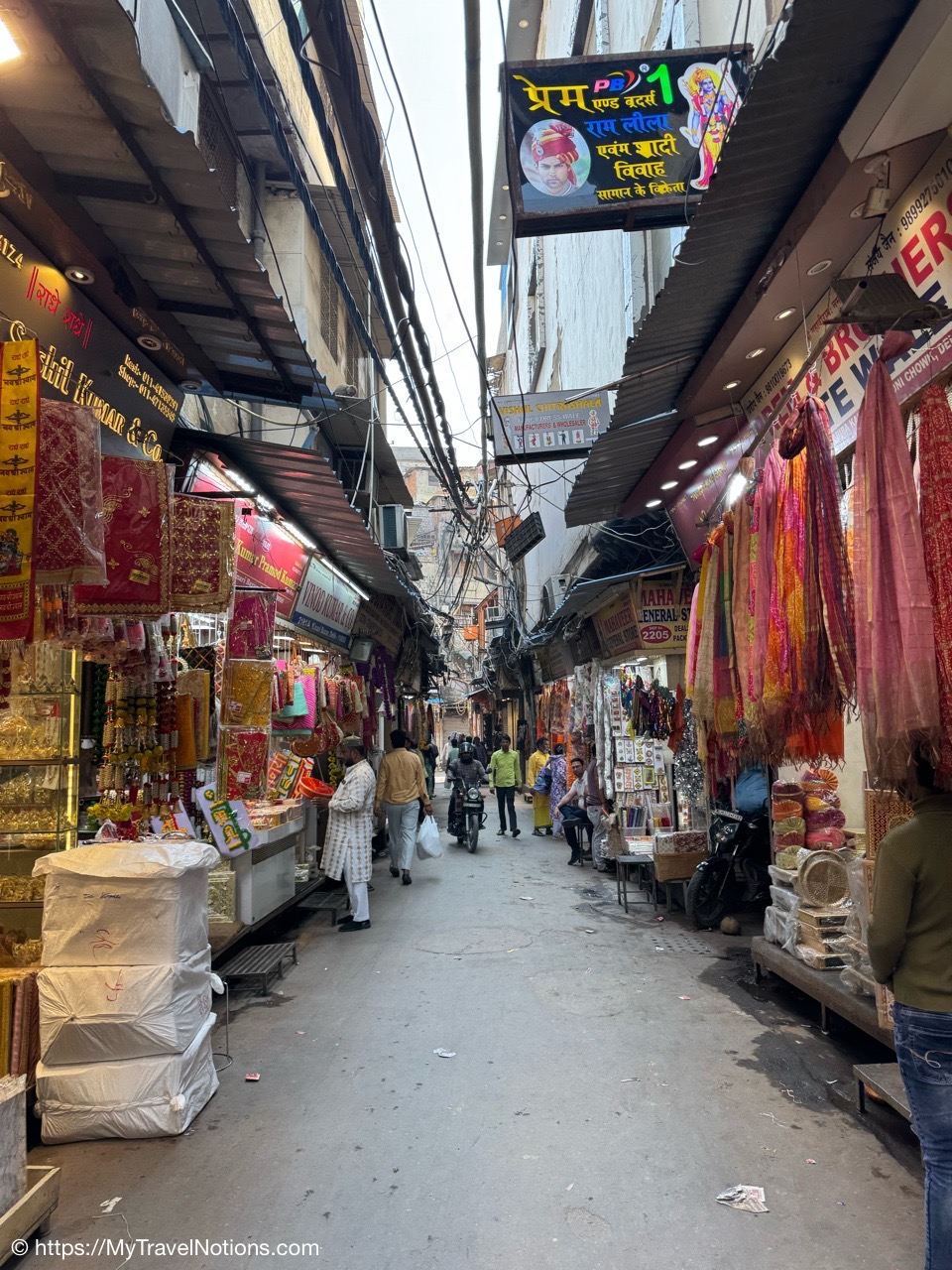 The alleyway of the Kinari Bazaar Road, a wholesale market area in Old Delhi for fancy laces, borders and tassles plus fancy paper items including envelopes for gifting, adornments for idols and festival decorations and much more. (March 17, 2025)