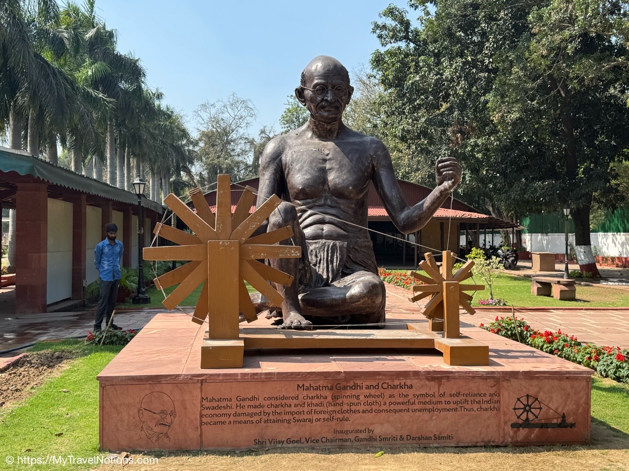 A statue of Mahatma Gandhi and Charkha, a spinning wheel, at the Gandhi Smriti, the Old Birla House, that is now home to the National Gandhi Museum in New Delhi dedicated to the life and legacy of Mahatma Gandhi who considered the charkha as the symbol of self-reliance. He made charkha and khadi (hand-spun cloth) a powerful medium to uplift the Indian economy damaged by the import of foreign clothes and the increase of unemployment. (March 18, 2025)