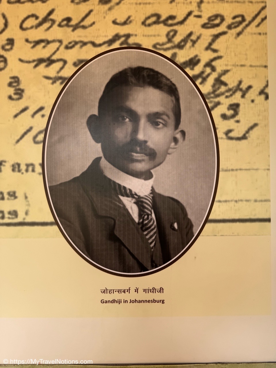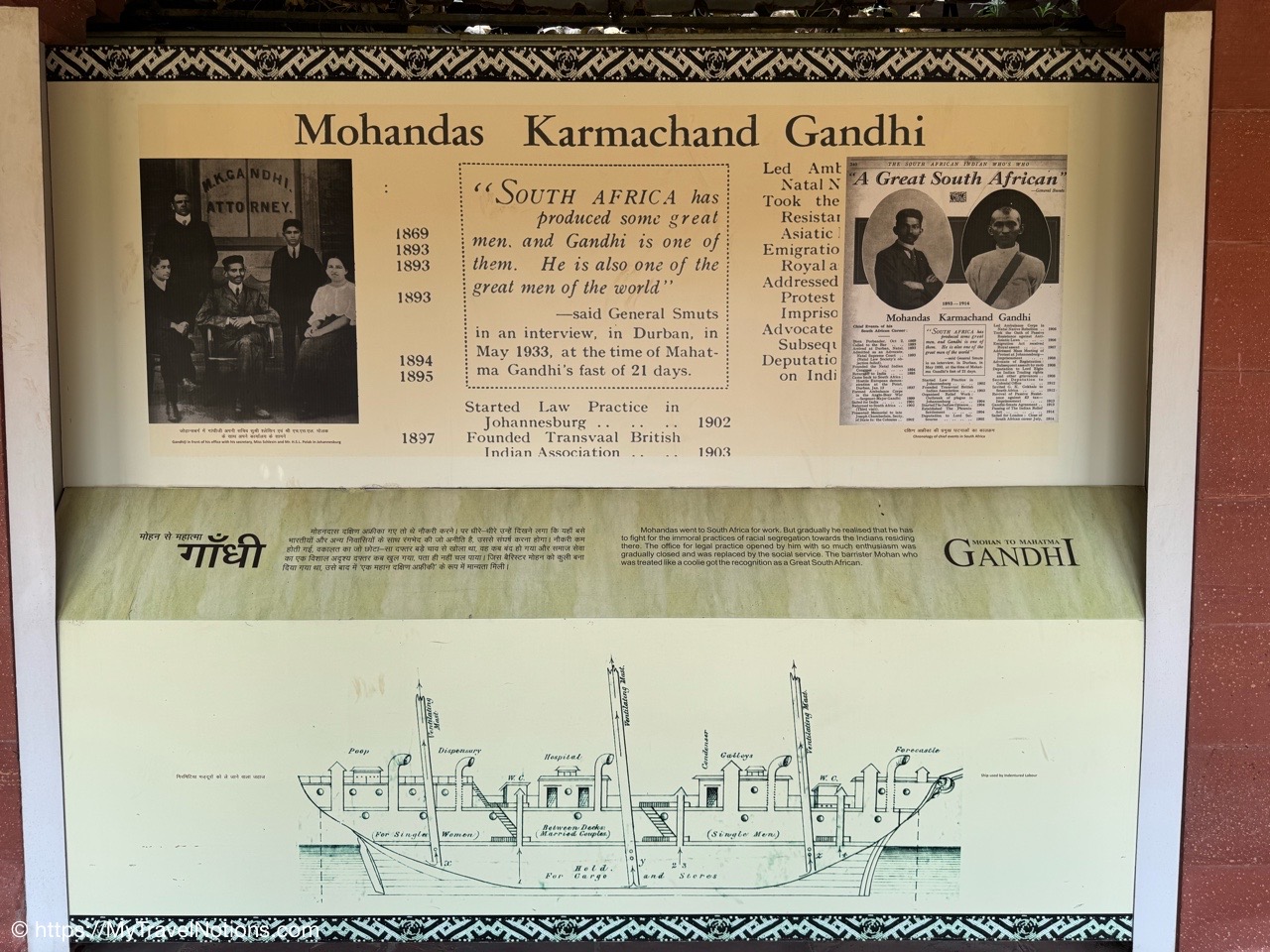 This information board along the single row of large panel: “Mohandas went to South Africa for work. But gradually he realized that he has to fight for the immoral practices of racial segregation towards the Indians residing there. The office for legal practice opened by him with so much enthusiasm was gradually closed.” (March 18, 2025)