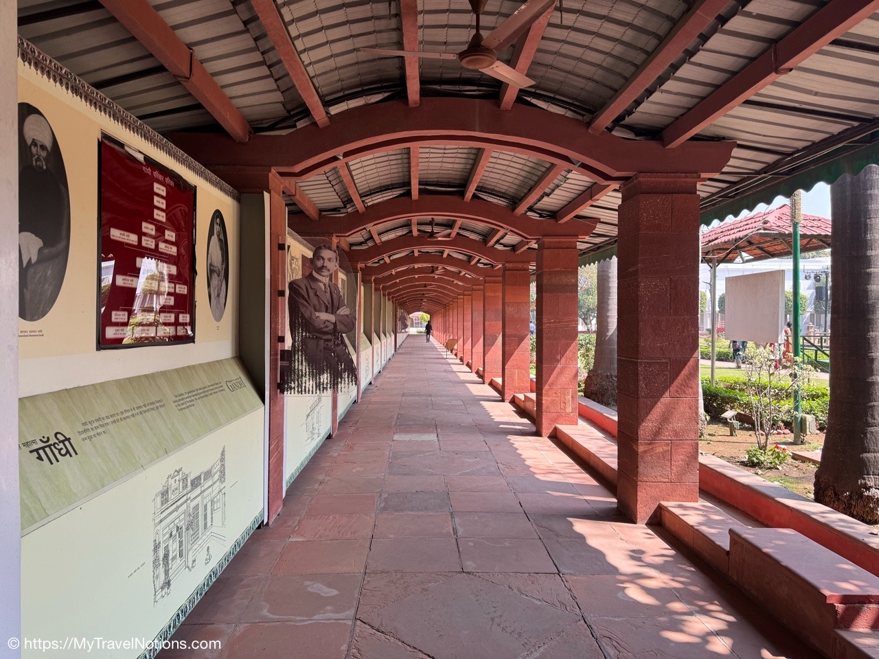 Along one side of the garden at the Gandhi National Museum in Delhi is this semi-open-air exhibition which consists of a single row of large panels with photos and reproductions of text documents pertaining to the life and work of Mahatma Gandhi, with short explanatory texts at the bottom – in both Hindi and English. (March 18, 2025)