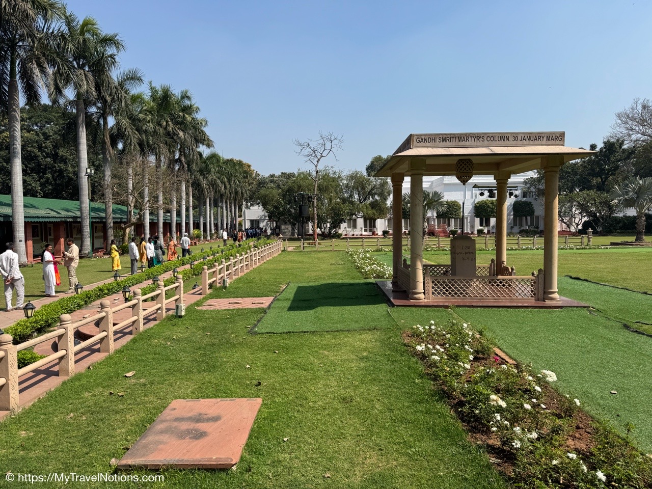 The Gandhi Smriti garden at the Gandhi National Museum in Delhi marks the spot where Mahatma Gandhi was assassinated at the ‘Martyr’s Column’ with a 4-pillared memorial stone and a path of symbolic footprints to the memorial. (March 18, 2025)