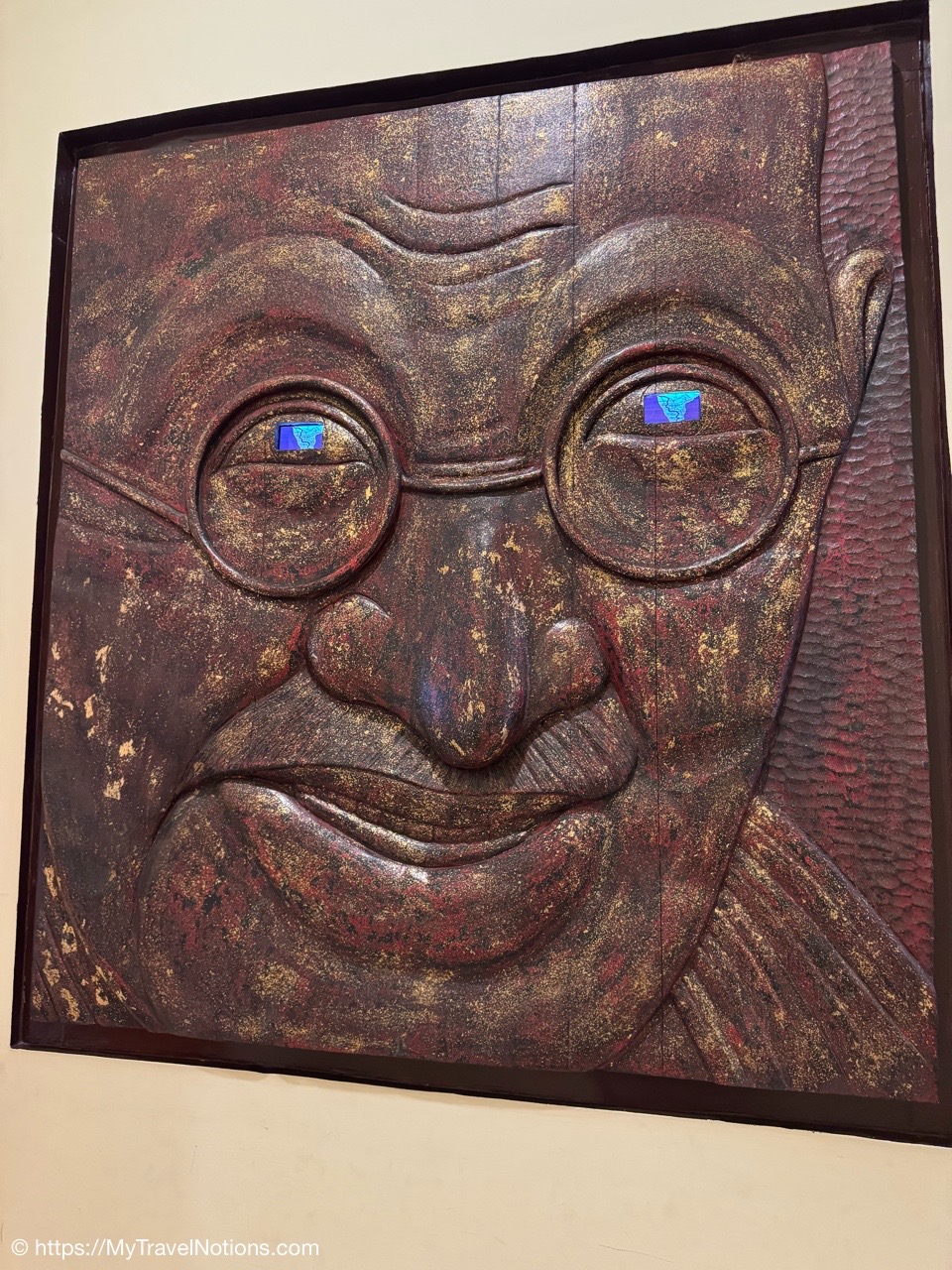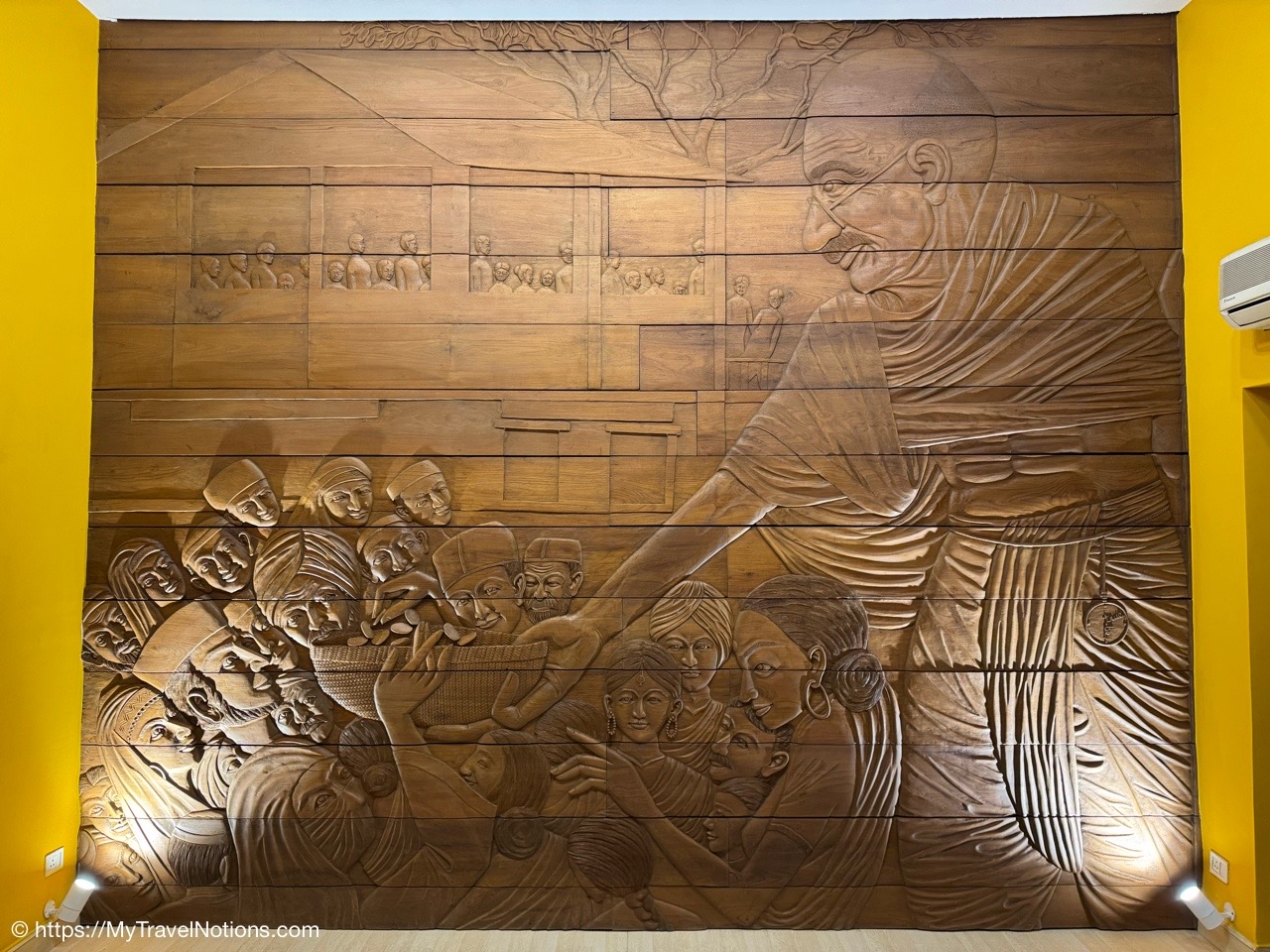 A piece of engraved wood art at the Eternal Gandhi Multimedia Museum located within Gandhi Smriti, which is part of the Gandhi National Museum in New Delhi. (March 18, 2025)