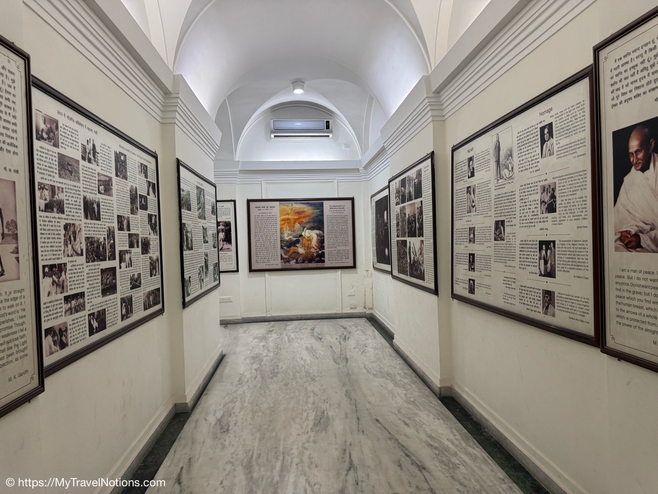 The Gandhi Smriti Gallery of photos and stories of Mahatma Gandhi life and death at the Eternal Gandhi Multimedia Museum located in a hallway within the Gandhi Smriti, which is part of the Gandhi National Museum in New Delhi. (March 18, 2025)
