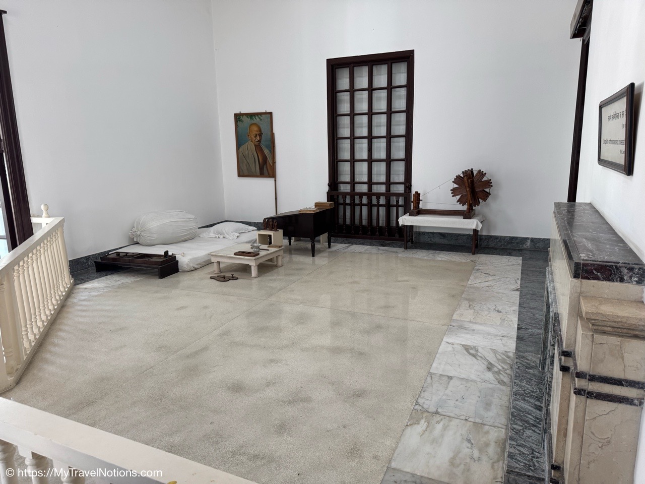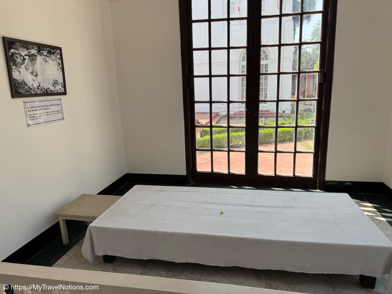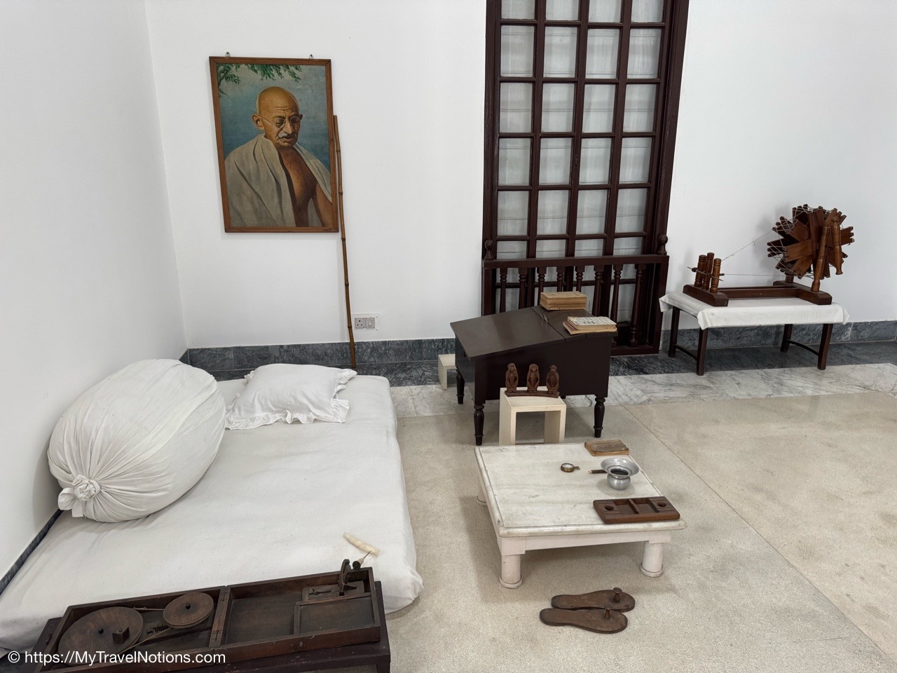 Gandhi’s bed was a simple mattress on the floor, reflecting his minimalist lifestyle in his room at the Gandhi Smriti (formerly Birla House) and Gandhi National Museum in Delhi where Mahatma Gandhi lived during the last 144 days of his life. The room was preserved as it was on the day of his assassination. It is a key exhibit in the museum, showcasing Gandhi’s simple lifestyle and belongings. (March 18, 2025)