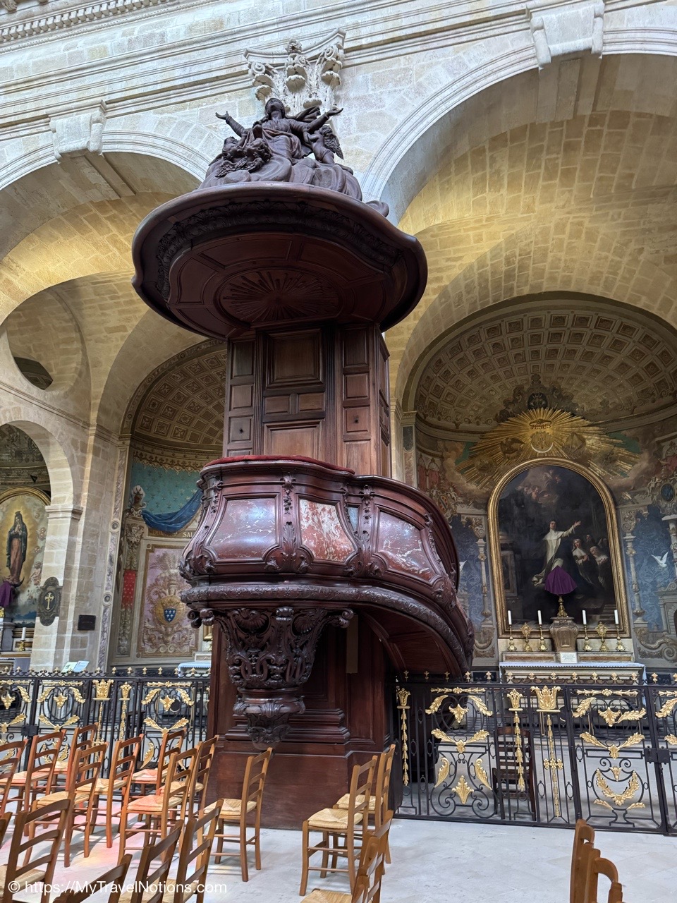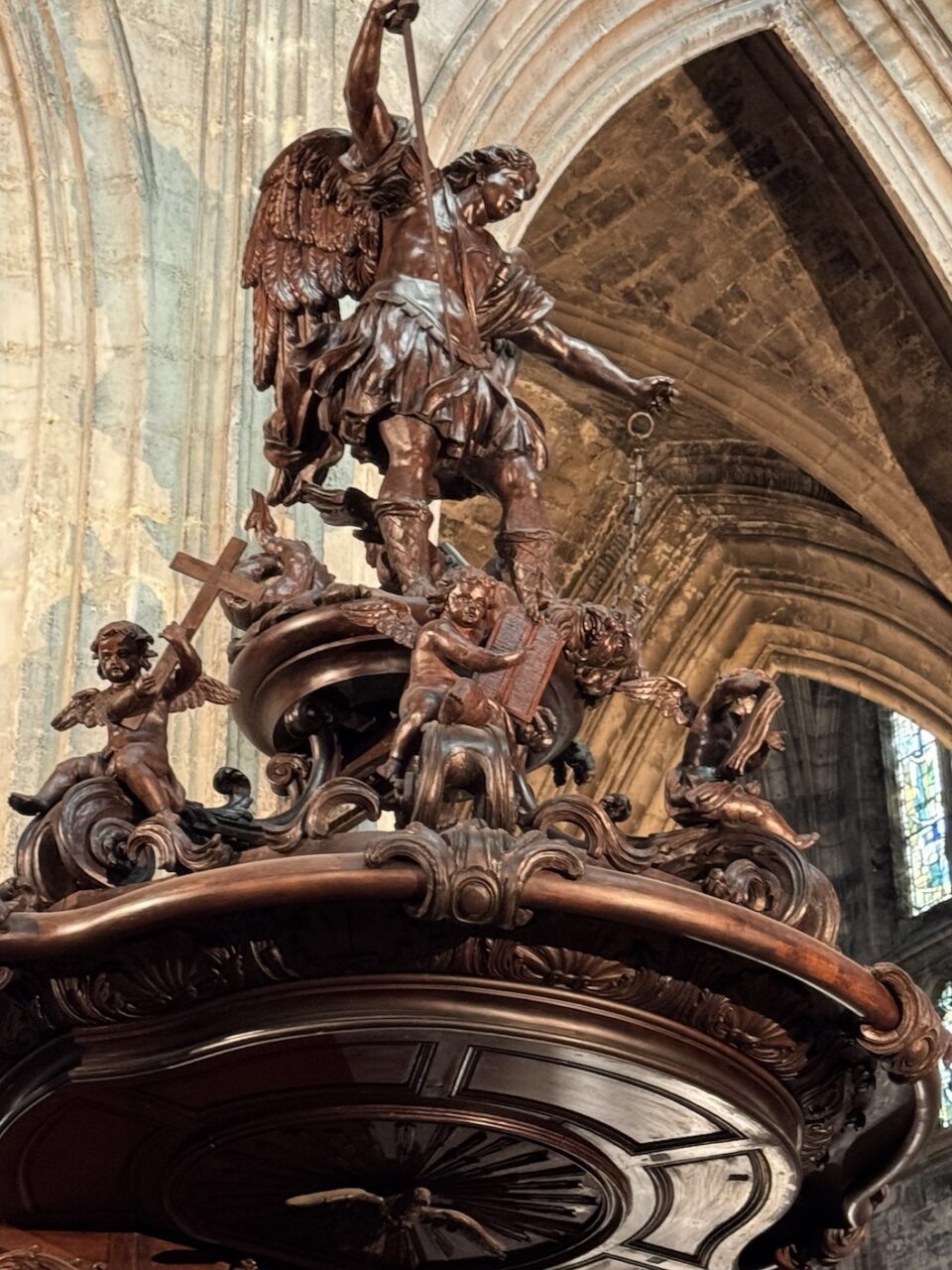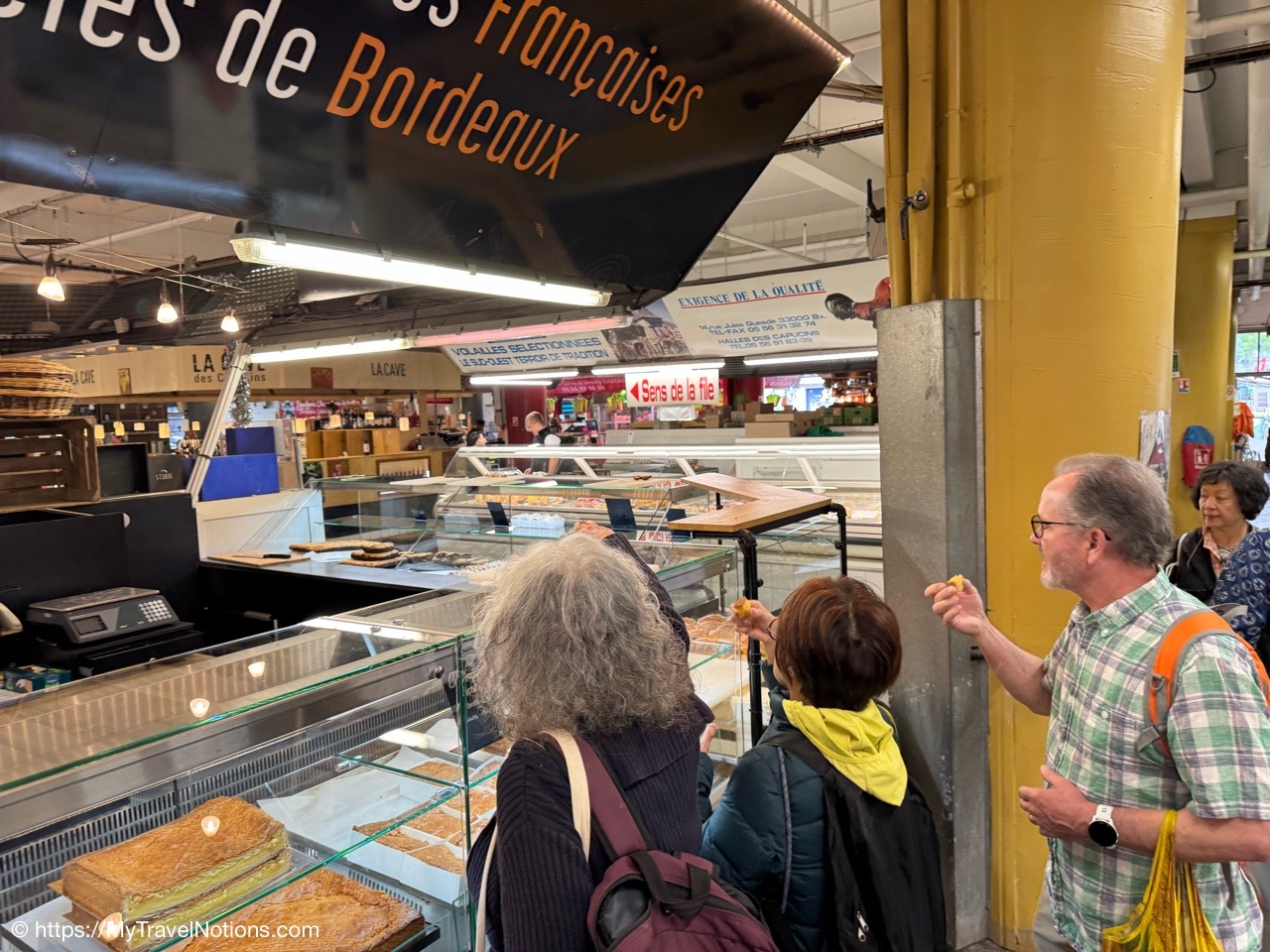 And, of course, no lunch would be complete without dessert. Here we are trying out the cake-like Gâteau Basque at the Marché des Capucins in Bordeaux. It is constructed from layers of a butter-sugar wheat flour pastry dough and in this case a thick filling of vanilla pastry cream. Delicious. (April 17, 2025)Plus, we also had to try and purchase the famous local dessert of Canelé at the Marché des Capucins in Bordeaux. The little brown striated pastry became one of Bordeaux’s symbols and can be found throughout the city. Made from simple ingredients of flour, milk, eggs, sugar and butter and enhanced by the aromas of rum and vanilla. (April 17, 2025)A piece of art on the side of a building in the Saint-Michel region of Bordeaux. (April 17, 2025)Passing one of the six Bordeaux gates on the tram to Kim’s apartment after our picnic food shopping adventure at the Marché des Capucins in Bordeaux’s Saint-Michel district. Bordeaux gates are ancient entrances that allowed people to enter and leave the city when it was surrounded by a wall. This Porte de Bourgogne or Burgundy Gate was part of the second rampart, built in the 14th century, which stretched from the Garonne River to the present-day Place de la Comédie. (April 17, 2025)As soon as we arrived at Kim’s apartment in Bordeaux, Alice and Tammy began helping Kim to plate the goodies we purchased at the Marché des Capucins in Bordeaux. (April 17, 2025)With the table mostly set with the food we purchased at the Marché des Capucins in Bordeaux, Kim pours the white and rose wines for our meal. (April 17, 2025)Our beautiful table of goodies purchased at the Marché des Capucins in Bordeaux. (April 17, 2025)Tammy and Alice at Kim, our market food guide and hostess’ apartment in Bordeaux. at Kim’s apartment in Bordeaux with a table full of the goodies we purchased at the Marché des Capucins in Bordeaux. (April 17, 2025)Santé! And, thank you Kim, our market food guide and hostess, for opening up your apartment to us and for this photo. From left: Tammy, Alice, Rosie, John and me. (April 17, 2025)Back to the Saint-Michel district of Bordeaux to visit the Basilique Saint-Michel or Basilica of St. Michael with its bell tower known as the spire and arrow of Saint Michael under restoration. This Gothic church, dedicated to the Archangel, took over 200 years to construct from the 14th to the 16th century. The separate bell tower, which is 374 feet or 114 meters tall, was built in the 15th century. (April 17, 2025)Back to the Saint-Michel district of Bordeaux to visit the Basilique Saint-Michel or Basilica of St. Michael with its bell tower known as the spire and arrow of Saint Michael under restoration. This Gothic church, dedicated to the Archangel, took over 200 years to construct from the 14th to the 16th century. The separate bell tower, which is 374 feet or 114 meters tall, was built in the 15th century. (April 17, 2025)The Basilique Saint-Michel or Basilica of St. Michael was built between the end of 14th century and the 16th century. It is at the heart of the ancient quarter of Saint-Michel in Bordeaux and like the tower, it is undergoing renovations. (April 17, 2025)The Basilique Saint-Michel or Basilica of St. Michael was built between the end of 14th century and the 16th century. It is at the heart of the ancient quarter of Saint-Michel in Bordeaux and like the tower, it is undergoing renovations. (April 17, 2025)Inside the Basilique Saint-Michel in Bordeaux. (April 17, 2025)The altar inside the Basilique Saint-Michel in Bordeaux. (April 17, 2025)The altar inside the Basilique Saint-Michel in Bordeaux. (April 17, 2025)The beautiful pulpit representing Saint Michael slaying the dragon inside the Basilique Saint-Michel in Bordeaux. It was heavily damaged in 1940 along with most of the stain glass windows being broken. (April 17, 2025)The beautiful pulpit representing Saint Michael slaying the dragon inside the Basilique Saint-Michel in Bordeaux. It was heavily damaged in 1940 along with most of the stain glass windows being broken. (April 17, 2025)Inside the Basilique Saint-Michel in Bordeaux. (April 17, 2025)Most of the original stained-glass windows at the Basilique Saint-Michel in Bordeaux were blown out by bombs in the Second World War and then replaced in the 50s and 60s by the current impressive stained glass. This one depicts the Last Supper and its Eucharistic symbols. (April 17, 2025)A side chapel altar with the beautiful stained glass at the Basilique Saint-Michel in Bordeaux. The original stained glass were blown out by bombs in the Second World War and then replaced in the 50s and 60s by the current impressive stained glass. This one depicts the Last Supper and its Eucharistic symbols. (April 17, 2025)Most of the original stained-glass windows at the Basilique Saint-Michel in Bordeaux were blown out by bombs in the Second World War and then replaced in the 50s and 60s by the current impressive stained glass. This one depicts four scenes with angels. (April 17, 2025)